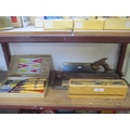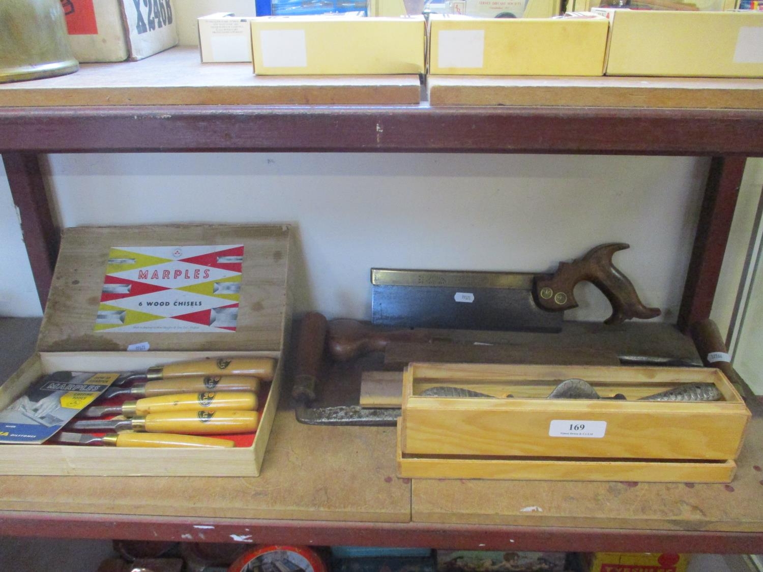 Five Marples wood working chisels together with various other carpentry tools