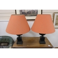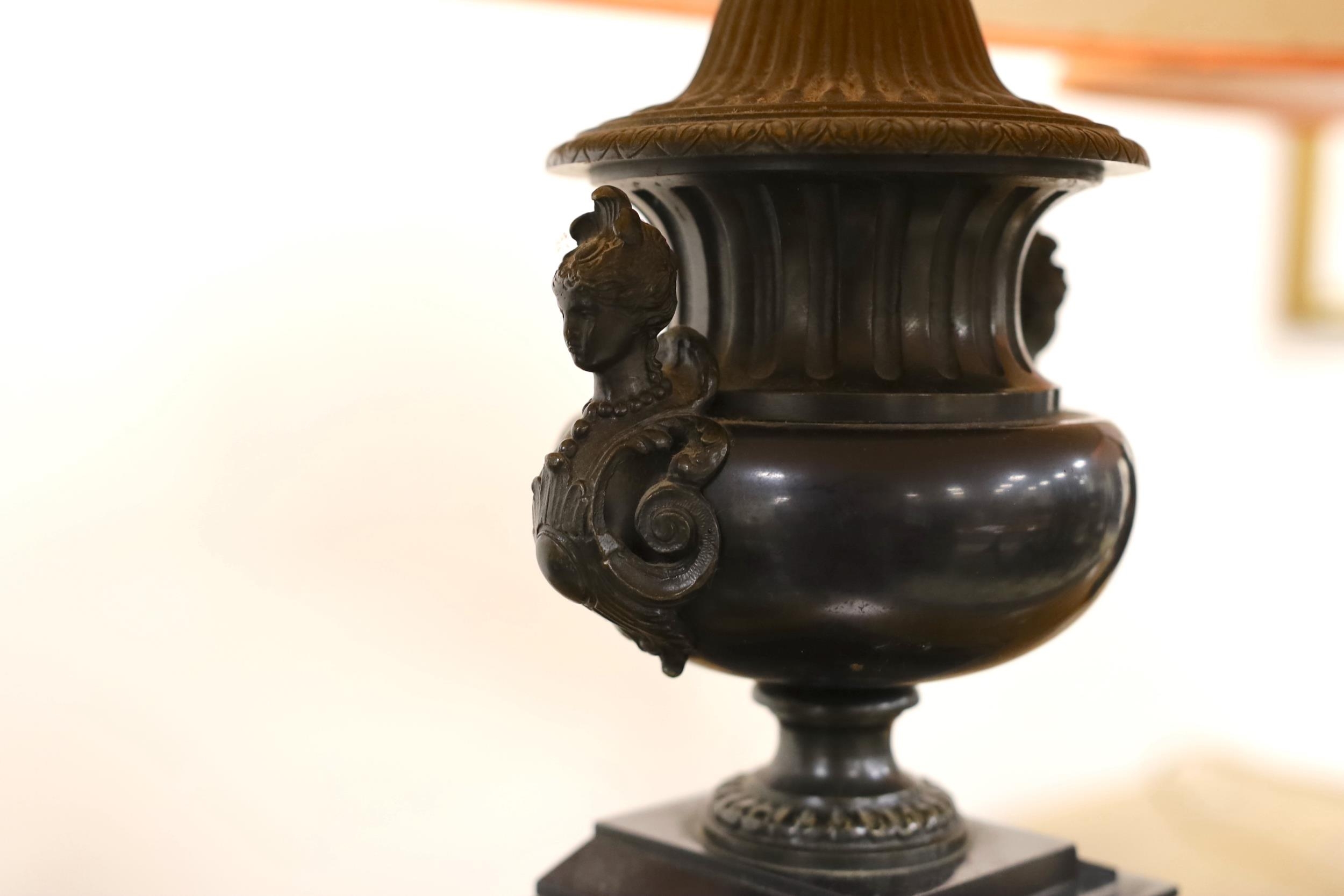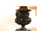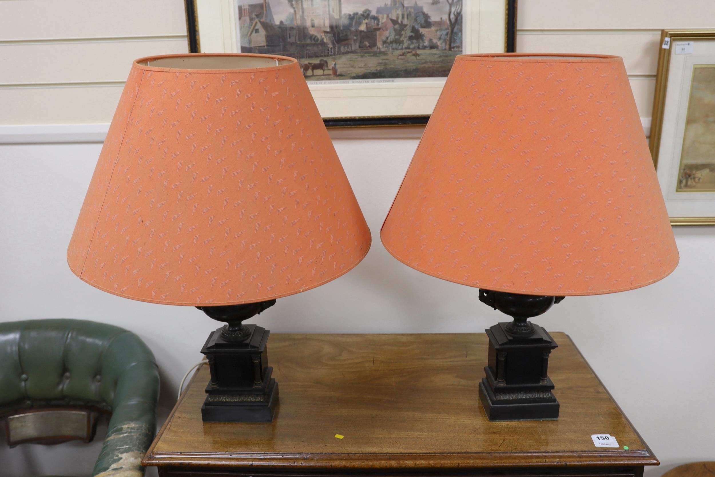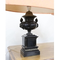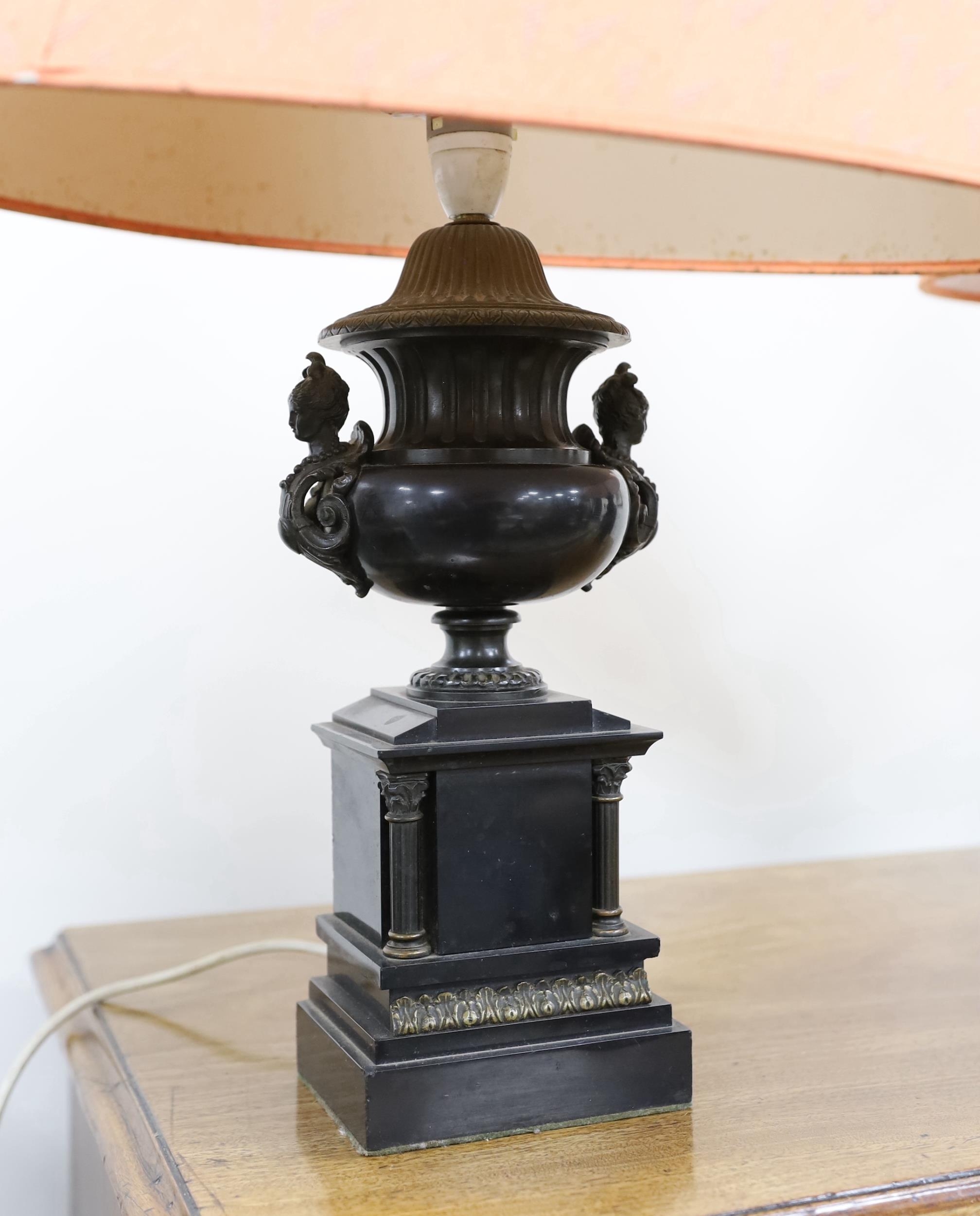 A pair of bronze and polished slate urns, converted to desk lamps (likely ex clock garniture), 34cm high excluding the fitting