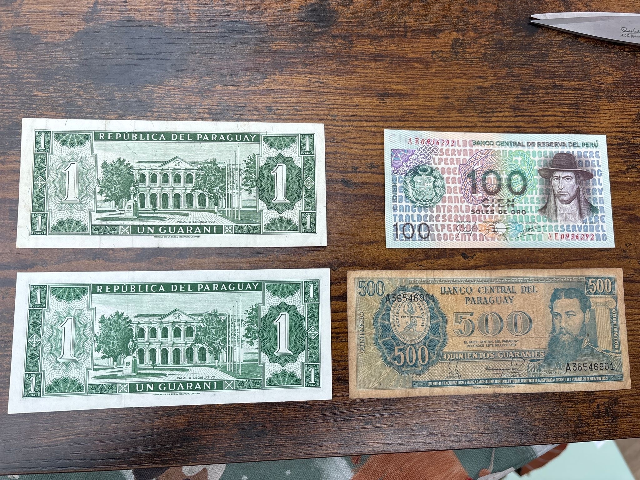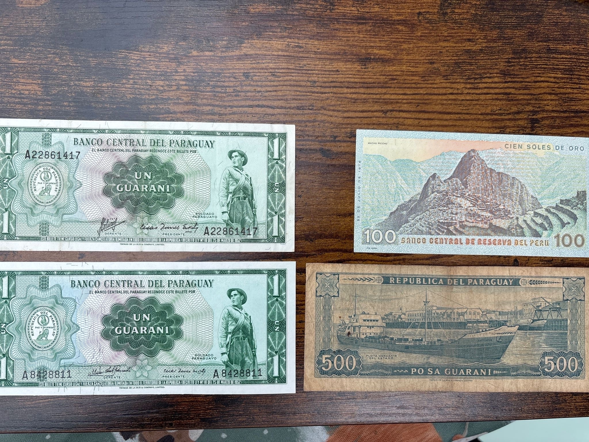 South America Banknotes – Paraguay & Peru – 4 Note Collection – Mixed Vintage & Modern Small collection of South American banknotes including Paraguay (1 & 500 Guaranies) and Peru (100 Soles). A mix of older and more modern issues with varied designs and condition. Includes both crisp and circulated examples. Ideal starter or filler lot.