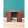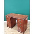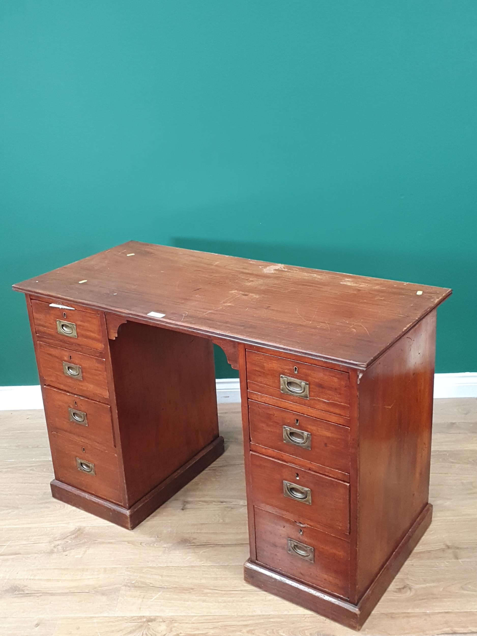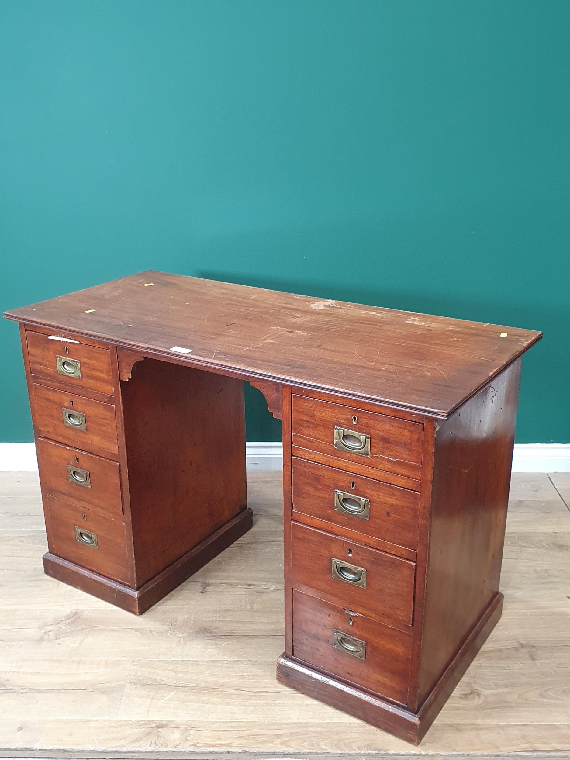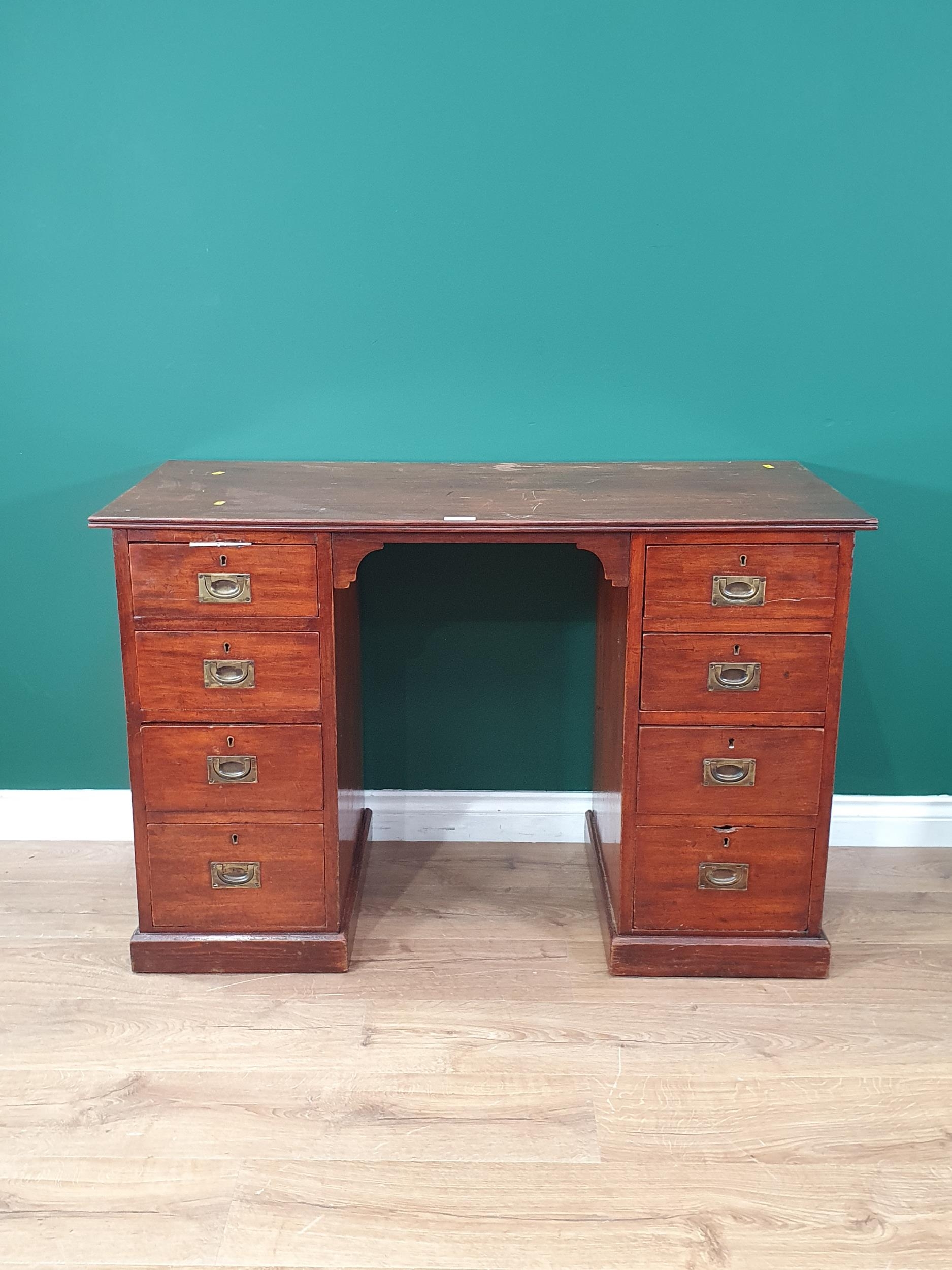 An antique mahogany Campaign style Pedestal Desk fitted four drawers each side with brass inset handles 3ft 9in W x 2ft 5in H