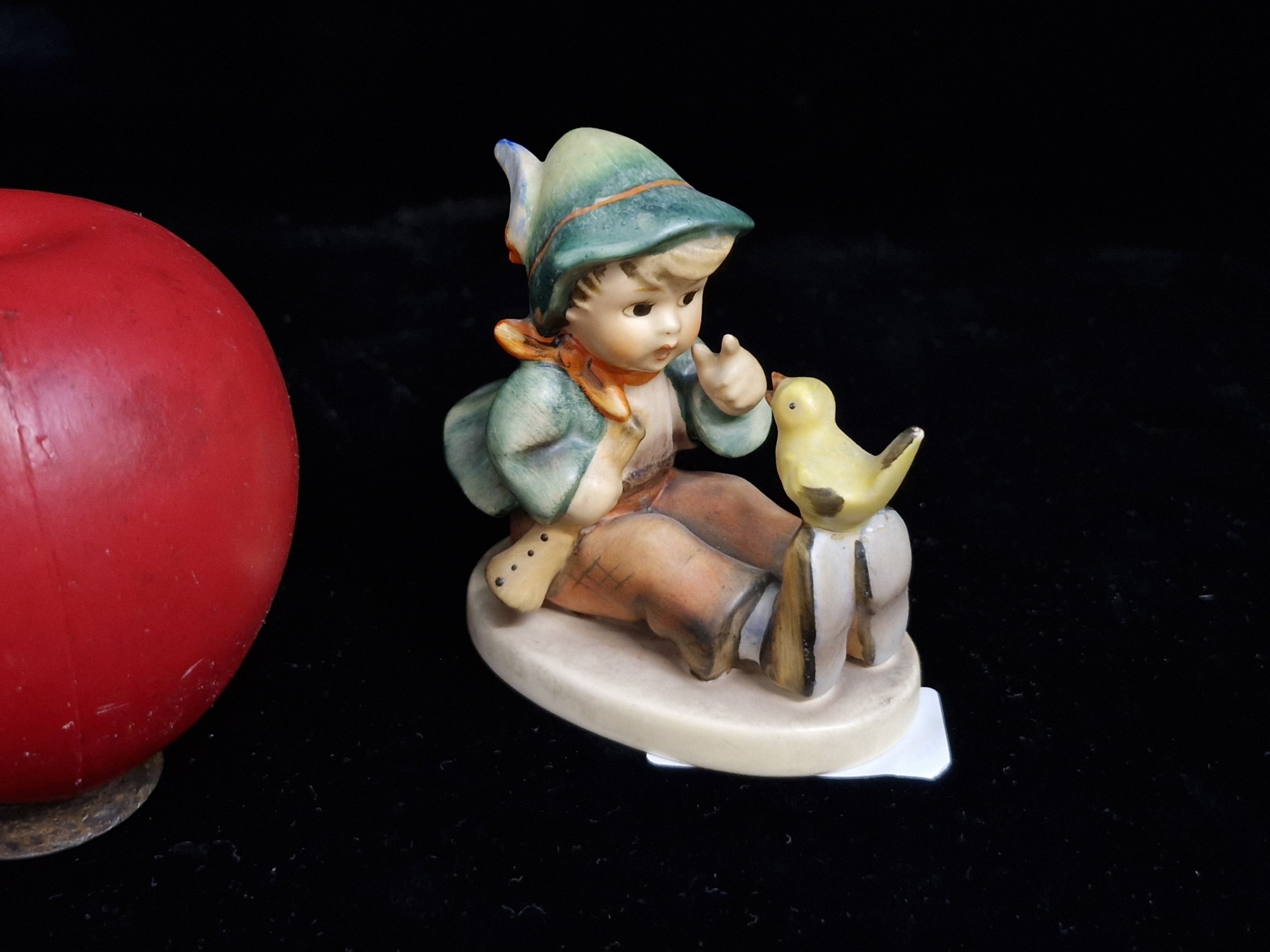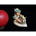 A super sweet vintage Hummel Goebel West German ceramic figurine titled 'Singing Lesson'. Features small boy teaching a bird to sing. In good condition. Small repair to bird sitting on shoe but almost not noticeable.