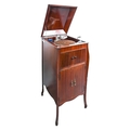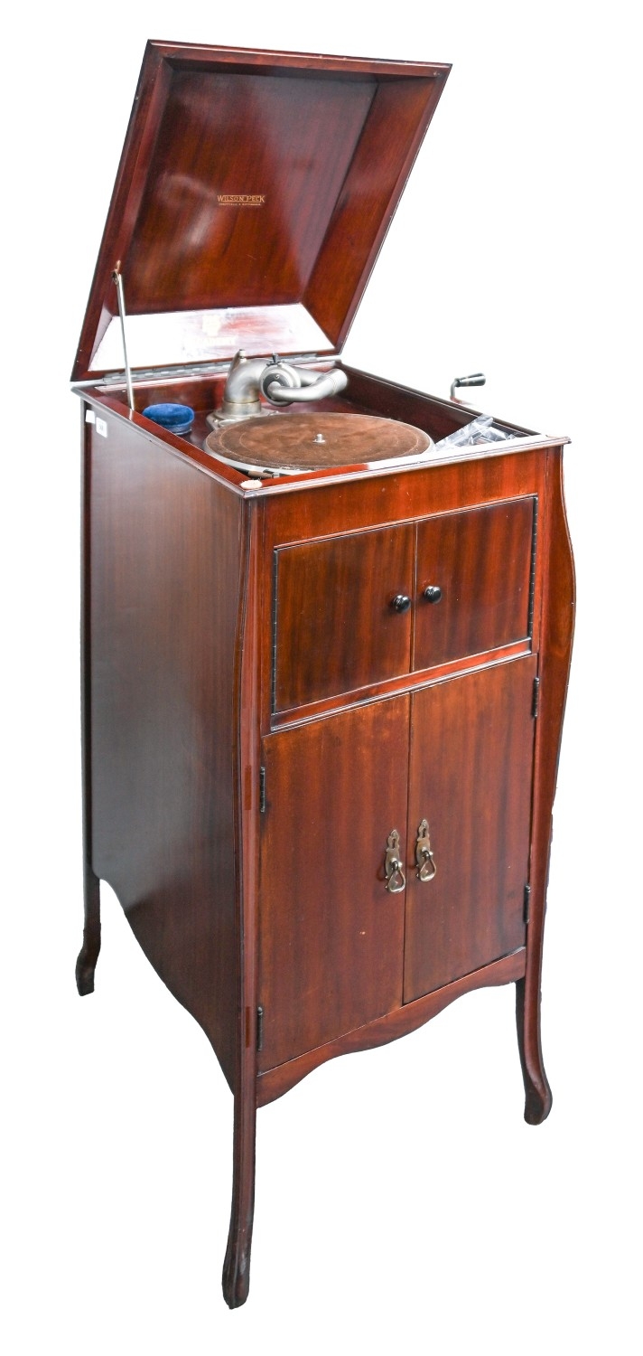 An Academy gramophone, early 20th c, in mahogany case with carved scrolling legs, the inside of the lid inscribed Wilson Peck Sheffield & Nottingham, 103cm h; 46 x 56cm and miscellaneous contemporary records