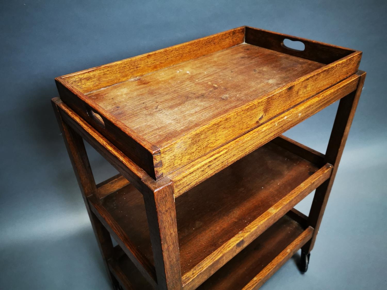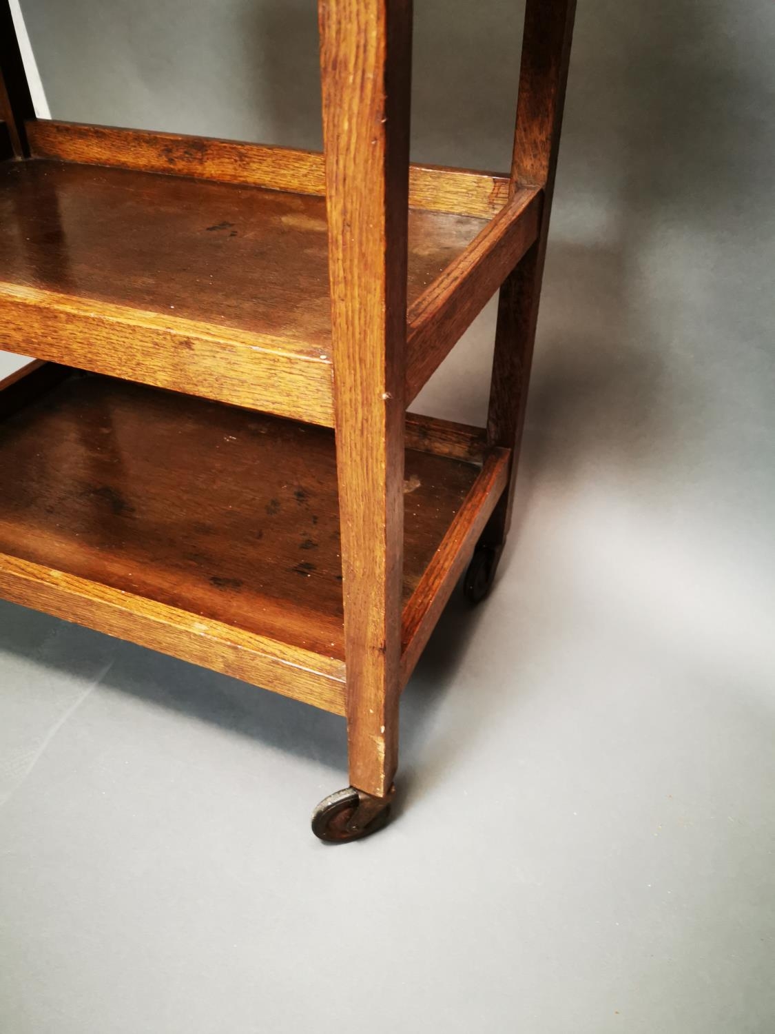 Edwardian oak tea trolly {84 cm H x 63 cm W x 40 cm D}.