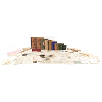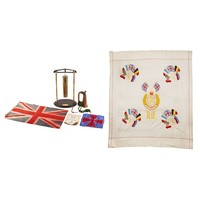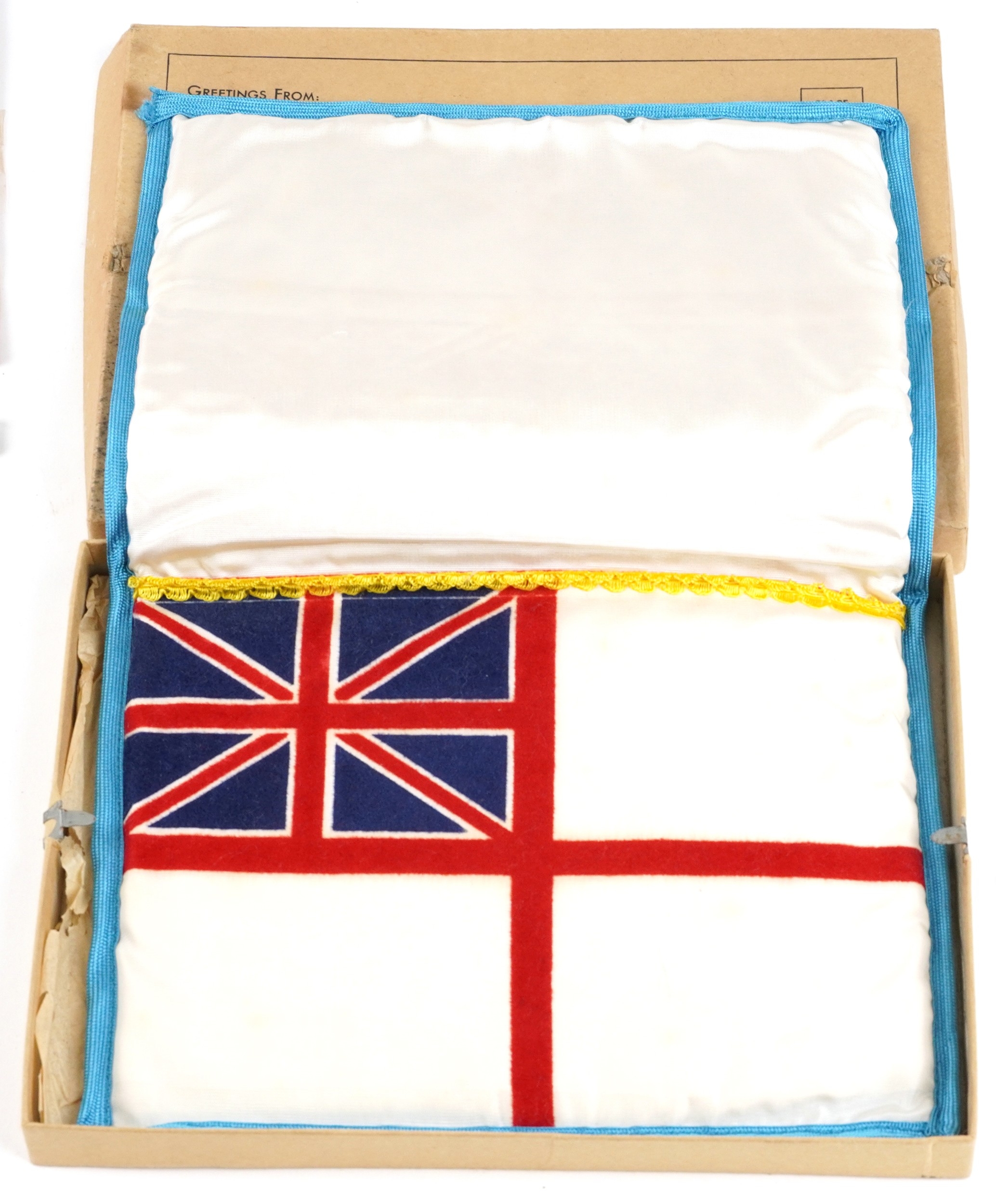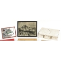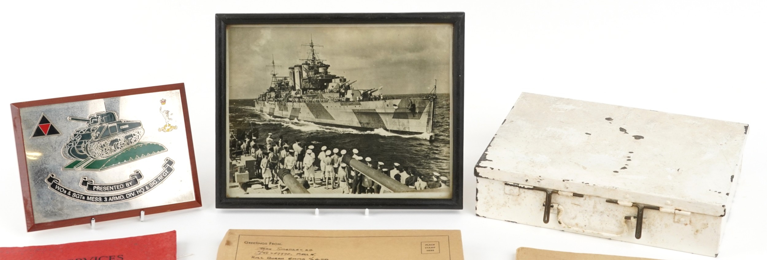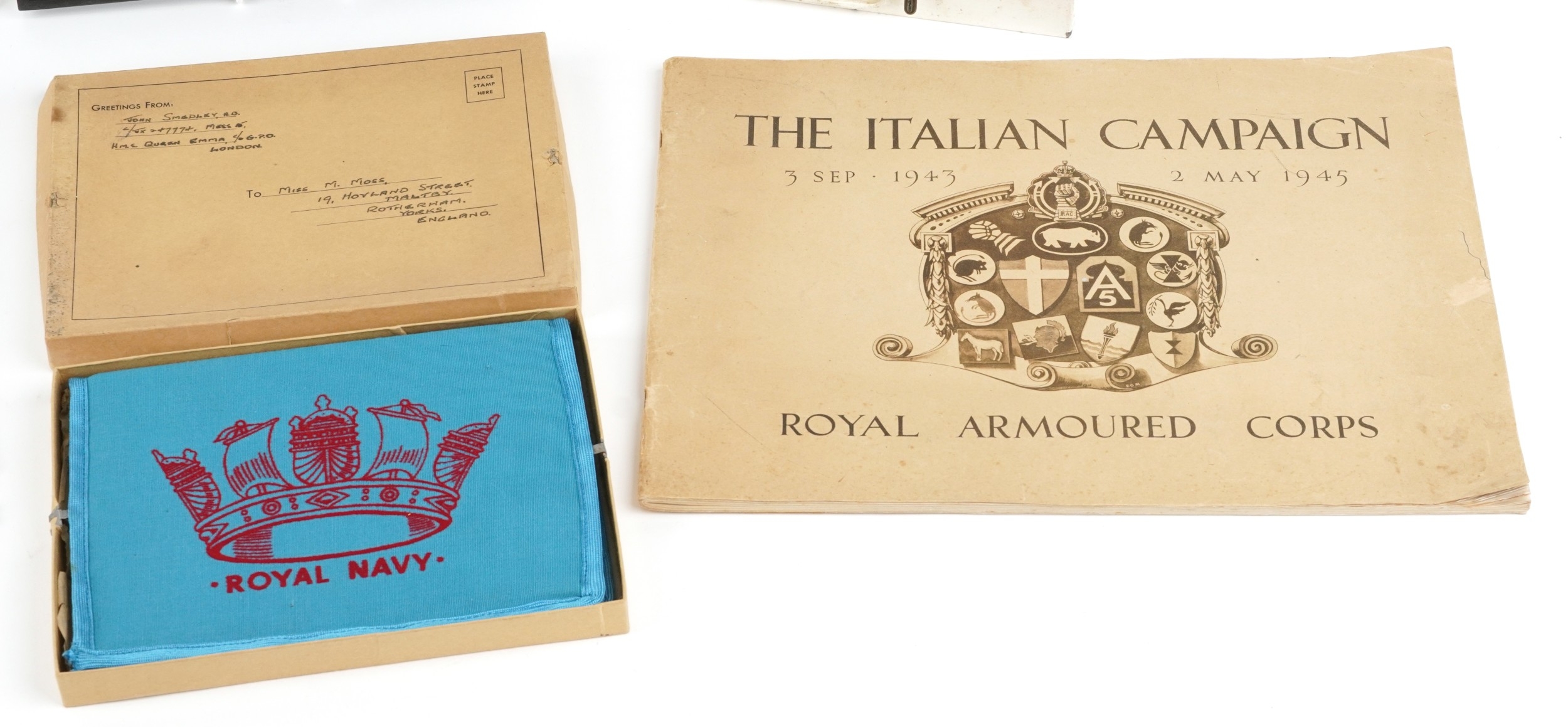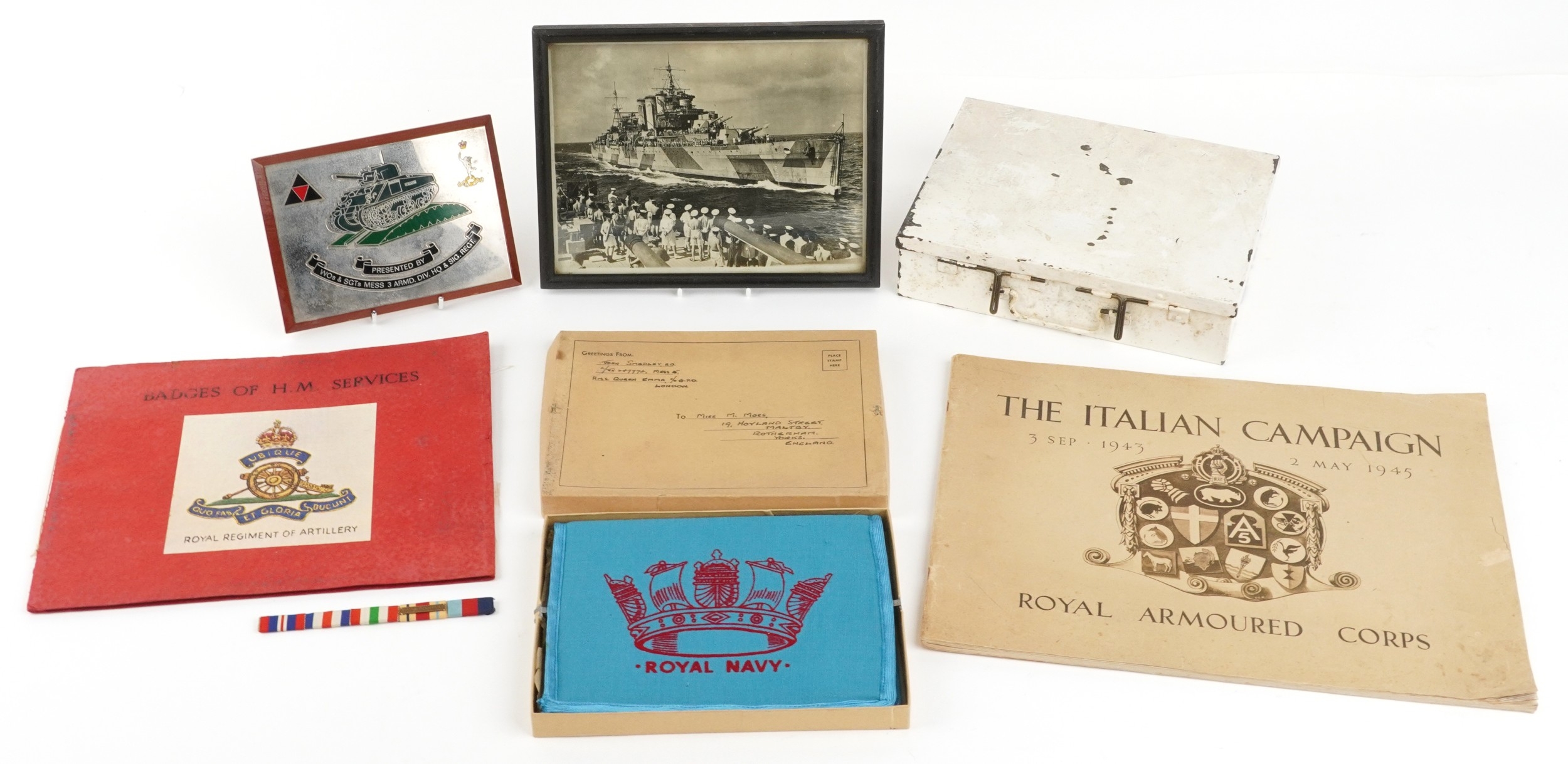 Militaria including a Royal Navy sweetheart pouch, first aid tin and Badges of HM Services book.