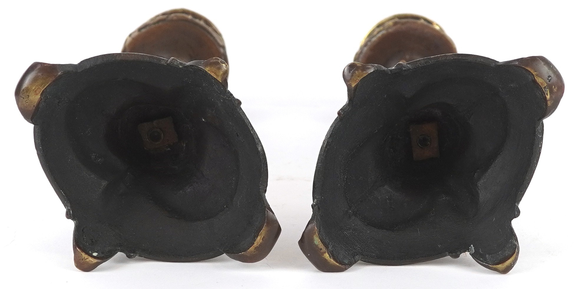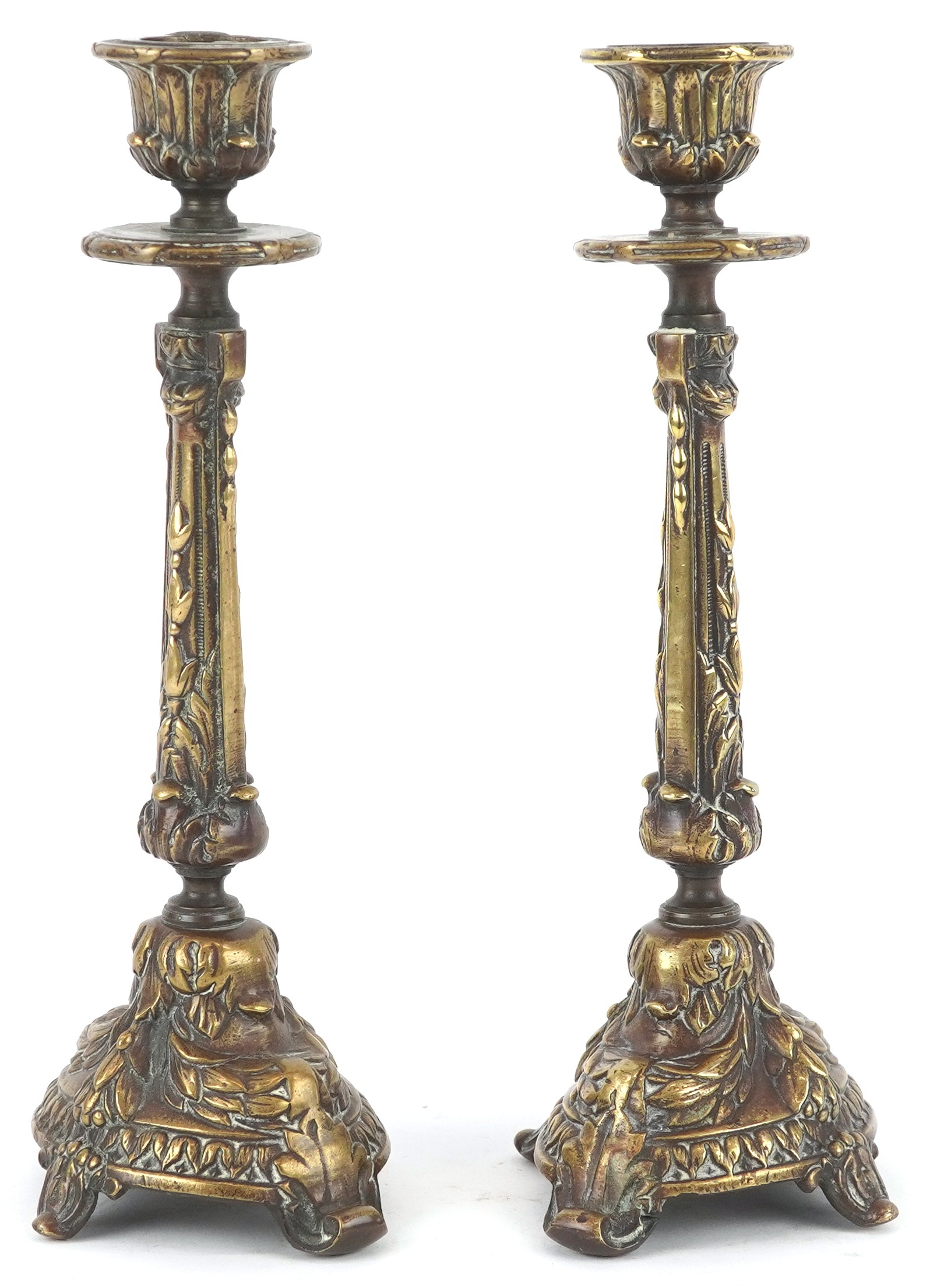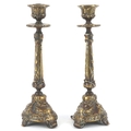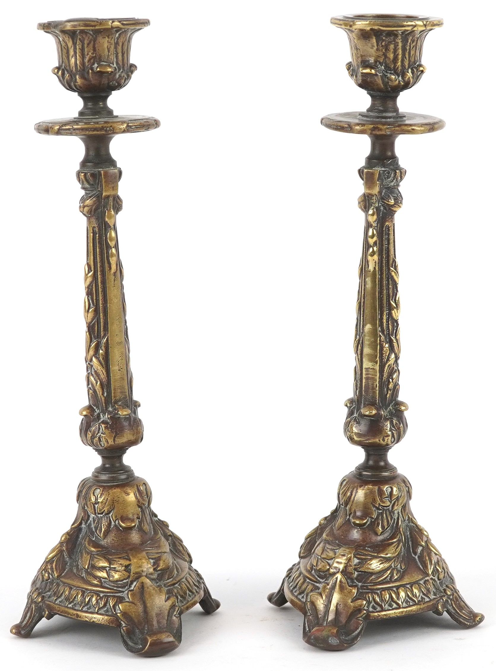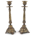 A pair of gilt metal candlesticks with cast leaf decoration, 23cm high.