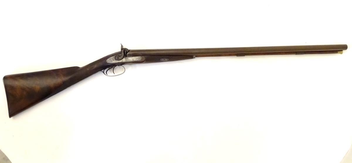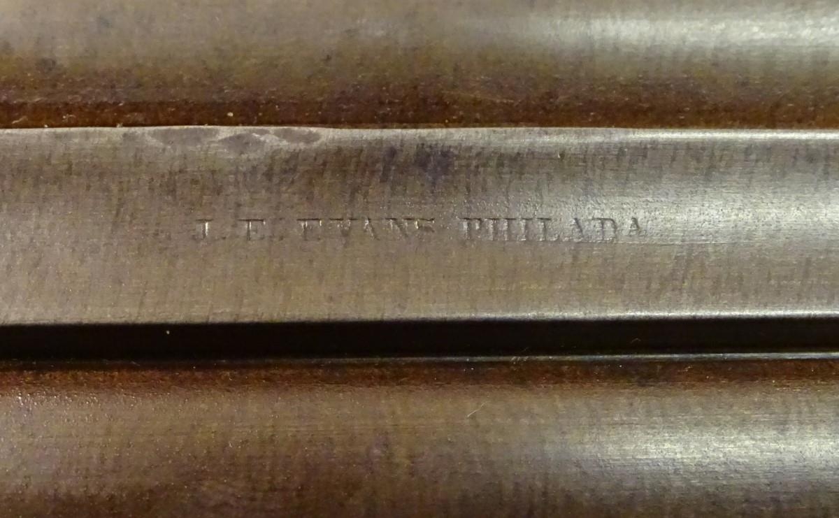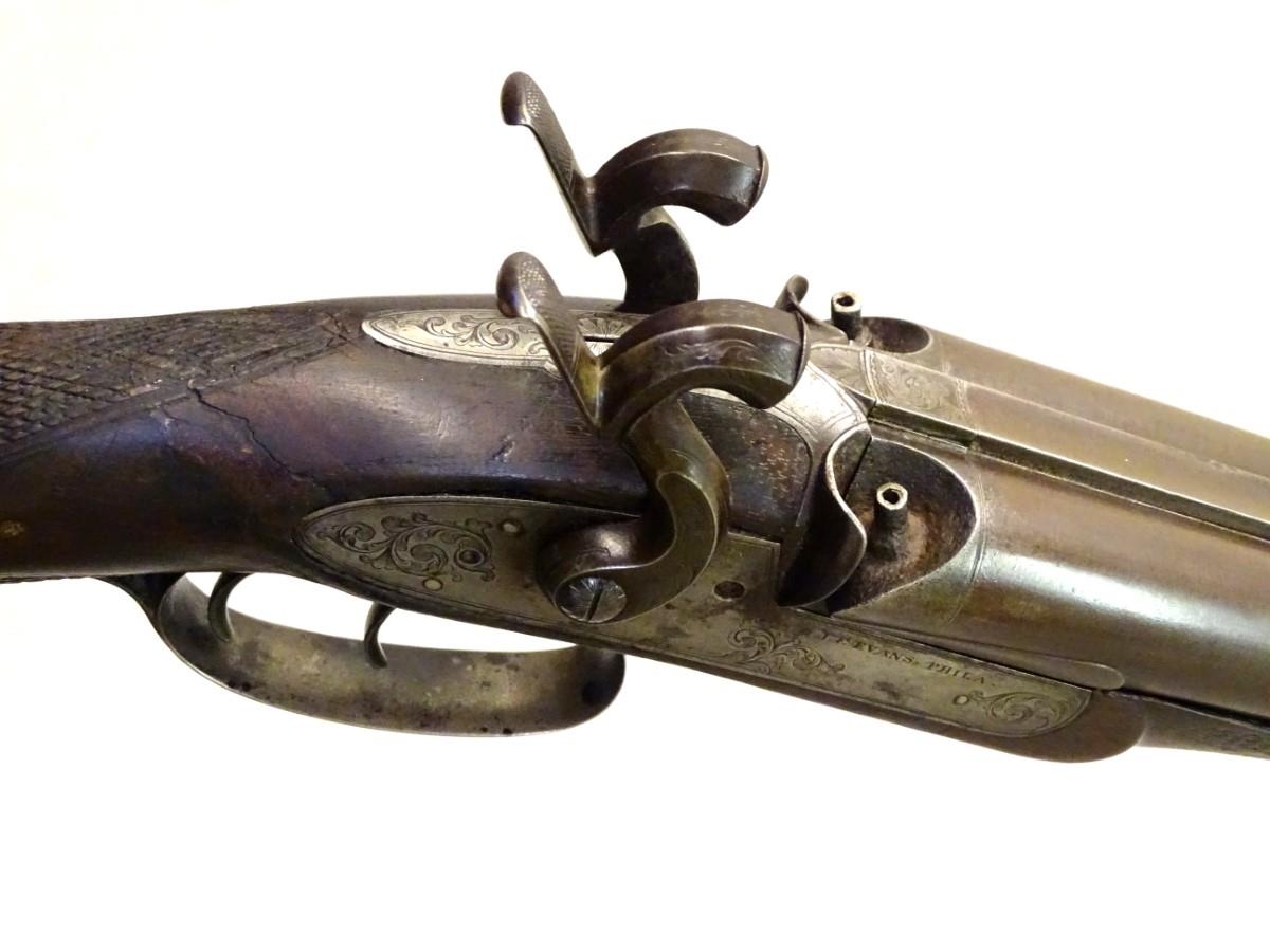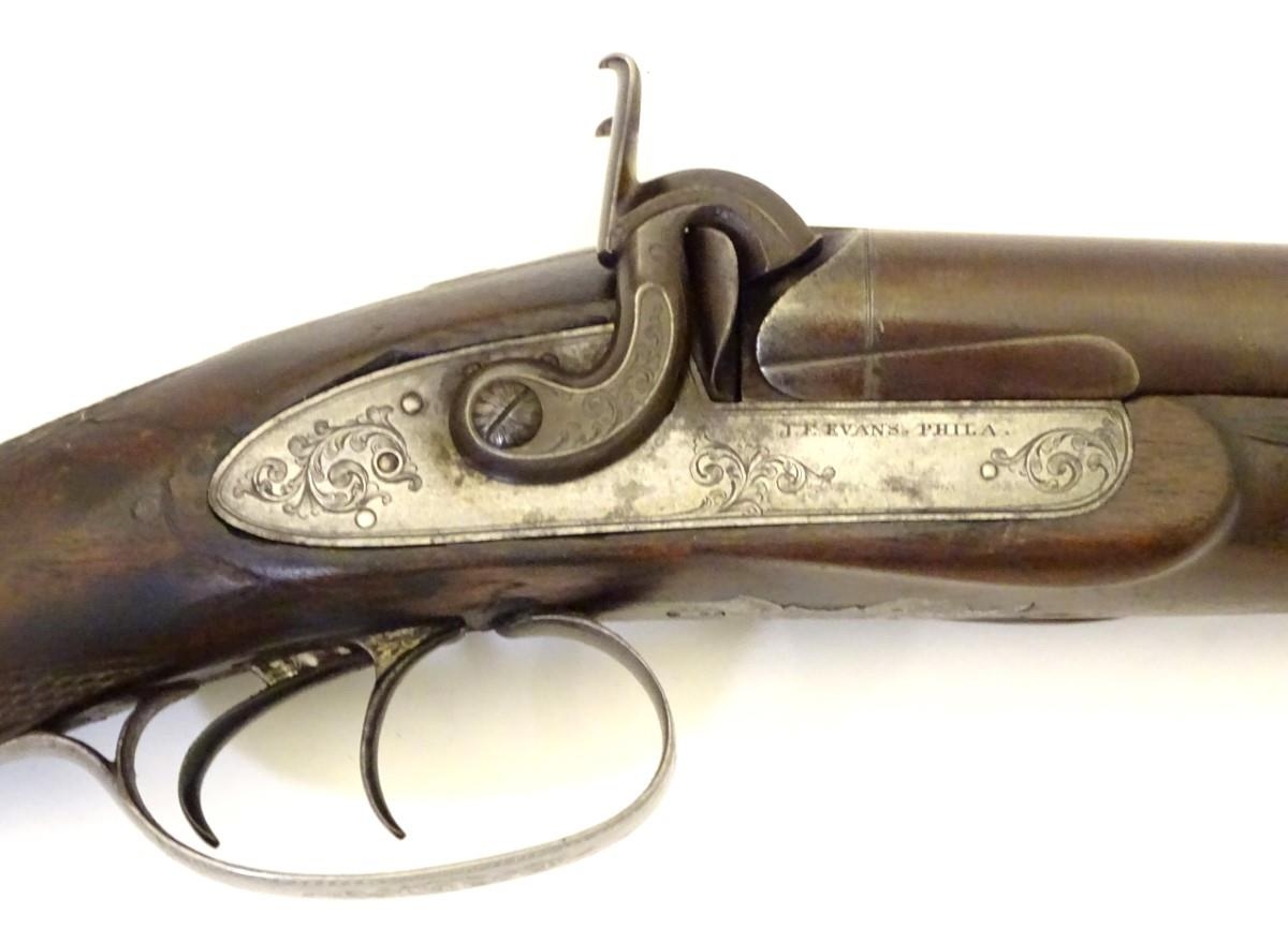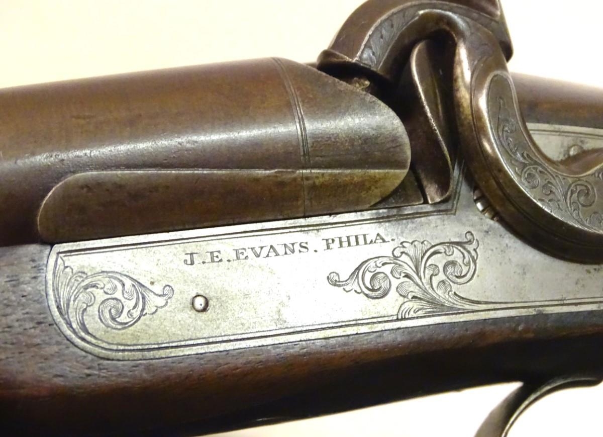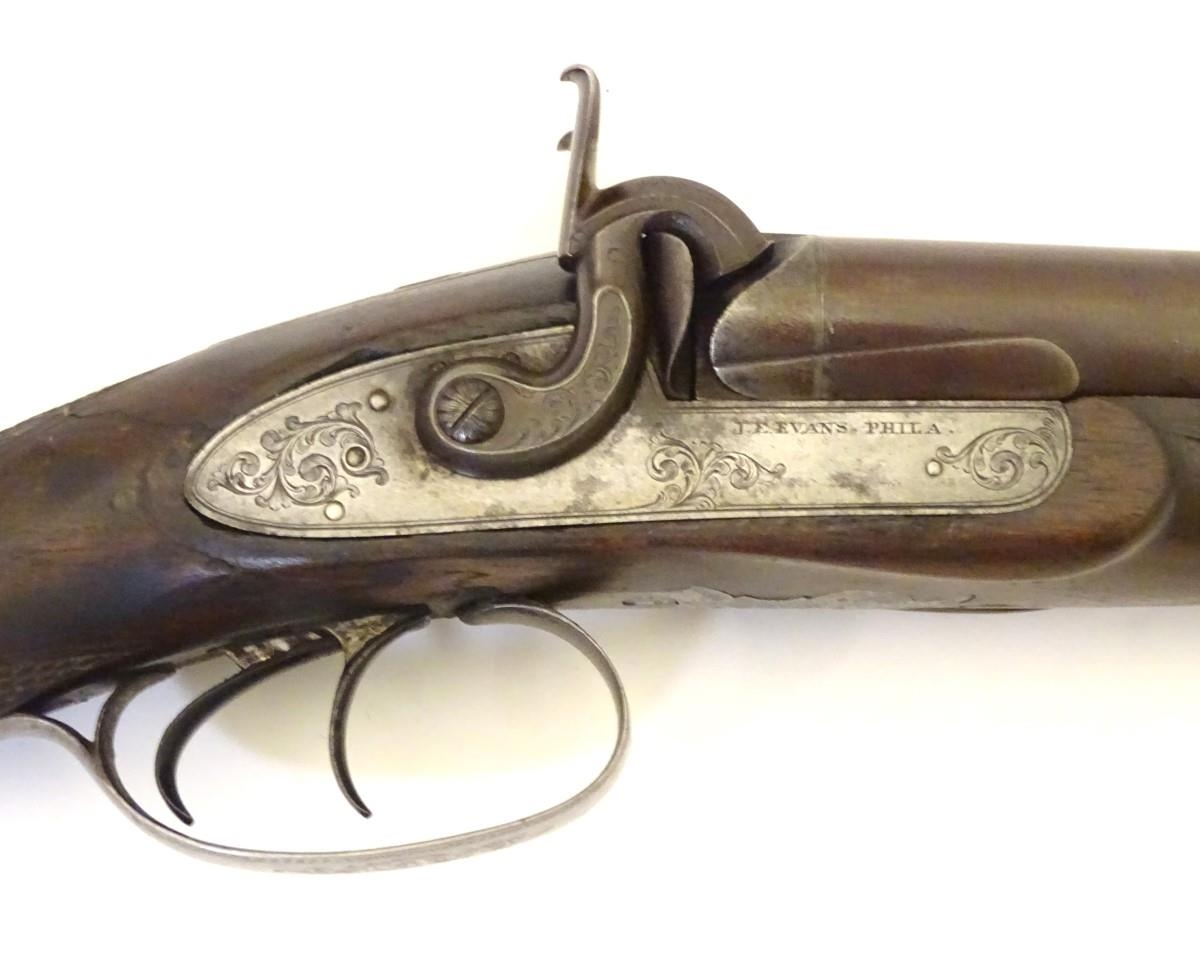 An 19thC American 10 bore side by side percussion muzzleloading black powder hammergun by J. E. Evans, Philadelphia. 30 3/4'' damascus barrels with signed concave rib, stamped under with serial number (453), maker's initials and 'ML' within an oval. Ramrod under. Straight-hand figured walnut stock with chequered palm and fore-end. The action, tang and trigger guard finely engraved with foliate scroll motifs, signed ' J. E. Evans. Phila.' James E. Evans is listed as a Philadelphia maker of 'percussion, duelling and derringer type pistols and fine double shotguns' at various Philadelphia addresses between 1850-1865. Notice to international bidders: Please note we are a UK based auction house. We ask that you take into consideration possible shipping restrictions and shipping costs prior to bidding with us.
