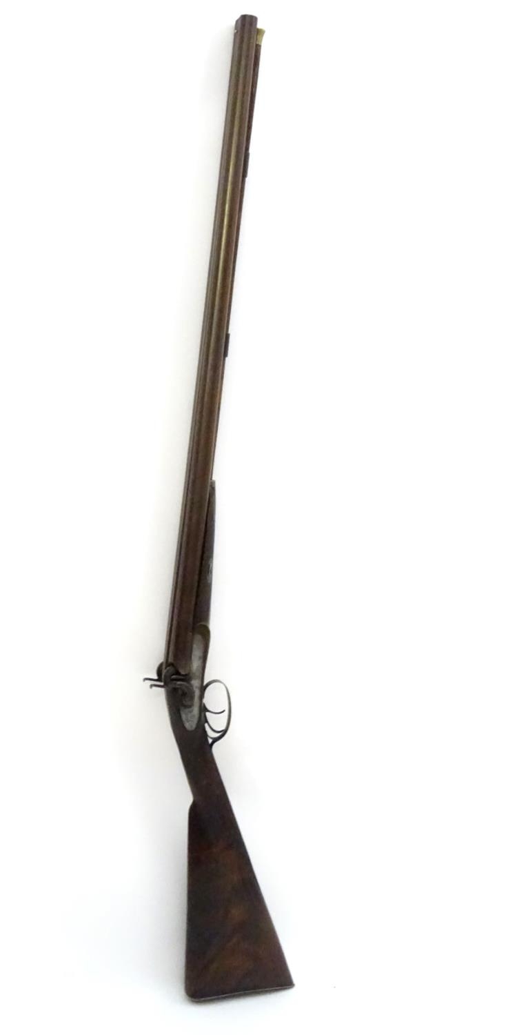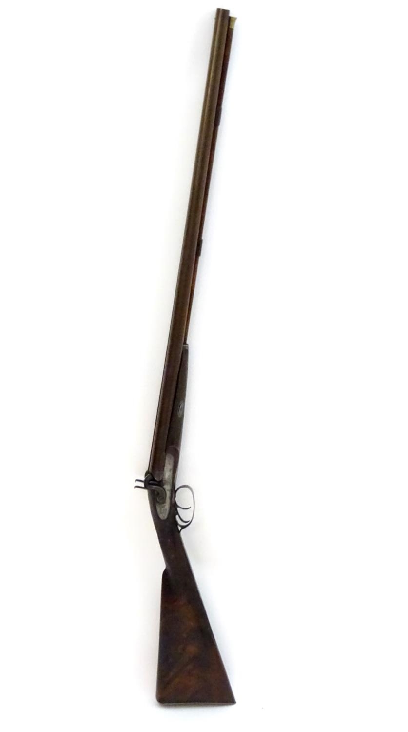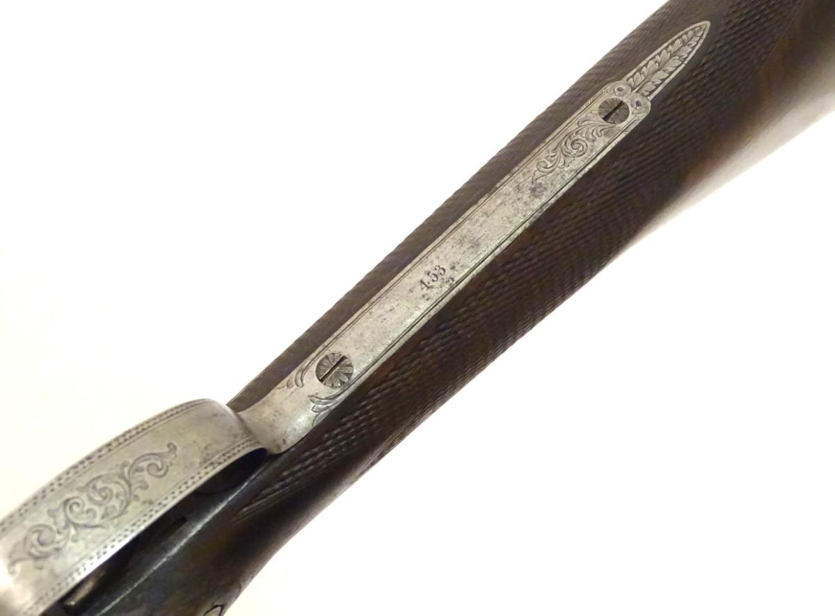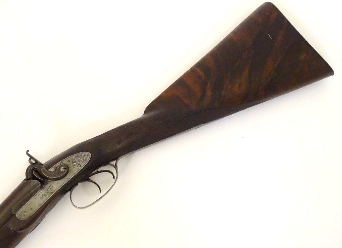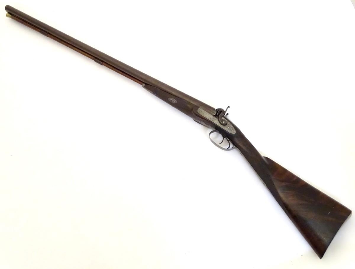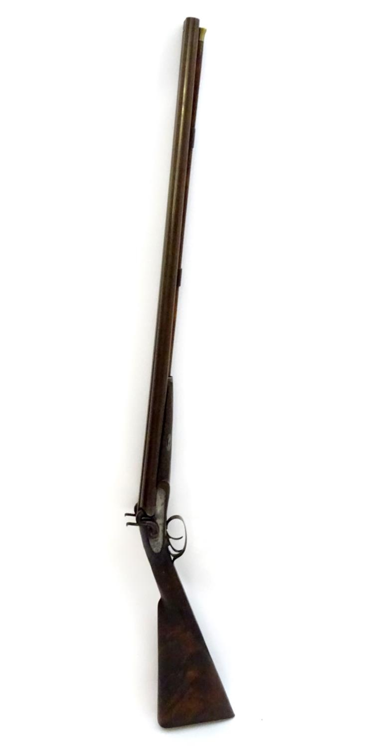 An 19thC American 10 bore side by side percussion muzzleloading black powder hammergun by J. E. Evans, Philadelphia. 30 3/4'' damascus barrels with signed concave rib, stamped under with serial number (453), maker's initials and 'ML' within an oval. Ramrod under. Straight-hand figured walnut stock with chequered palm and fore-end. The action, tang and trigger guard finely engraved with foliate scroll motifs, signed ' J. E. Evans. Phila.' James E. Evans is listed as a Philadelphia maker of 'percussion, duelling and derringer type pistols and fine double shotguns' at various Philadelphia addresses between 1850-1865. Notice to international bidders: Please note we are a UK based auction house. We ask that you take into consideration possible shipping restrictions and shipping costs prior to bidding with us.
