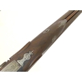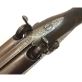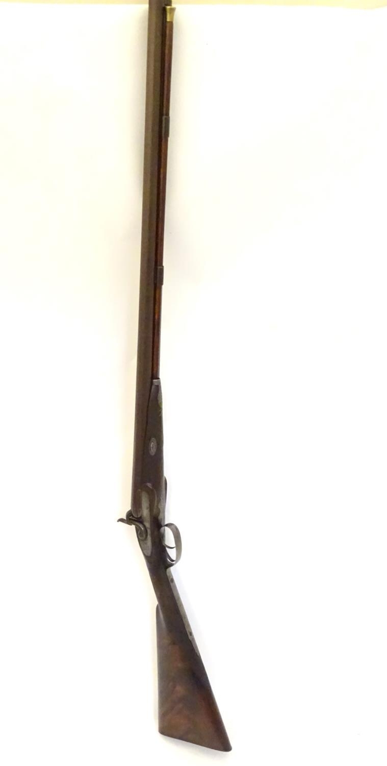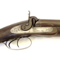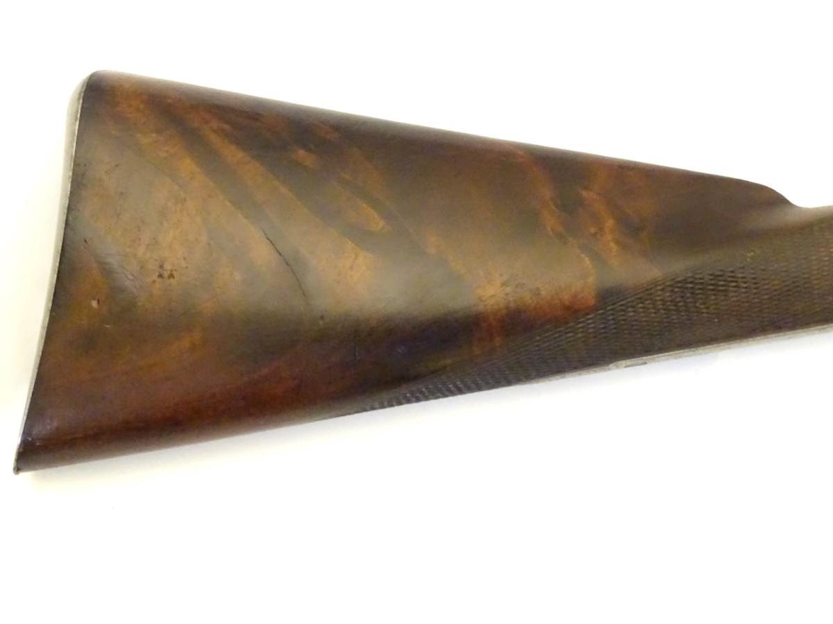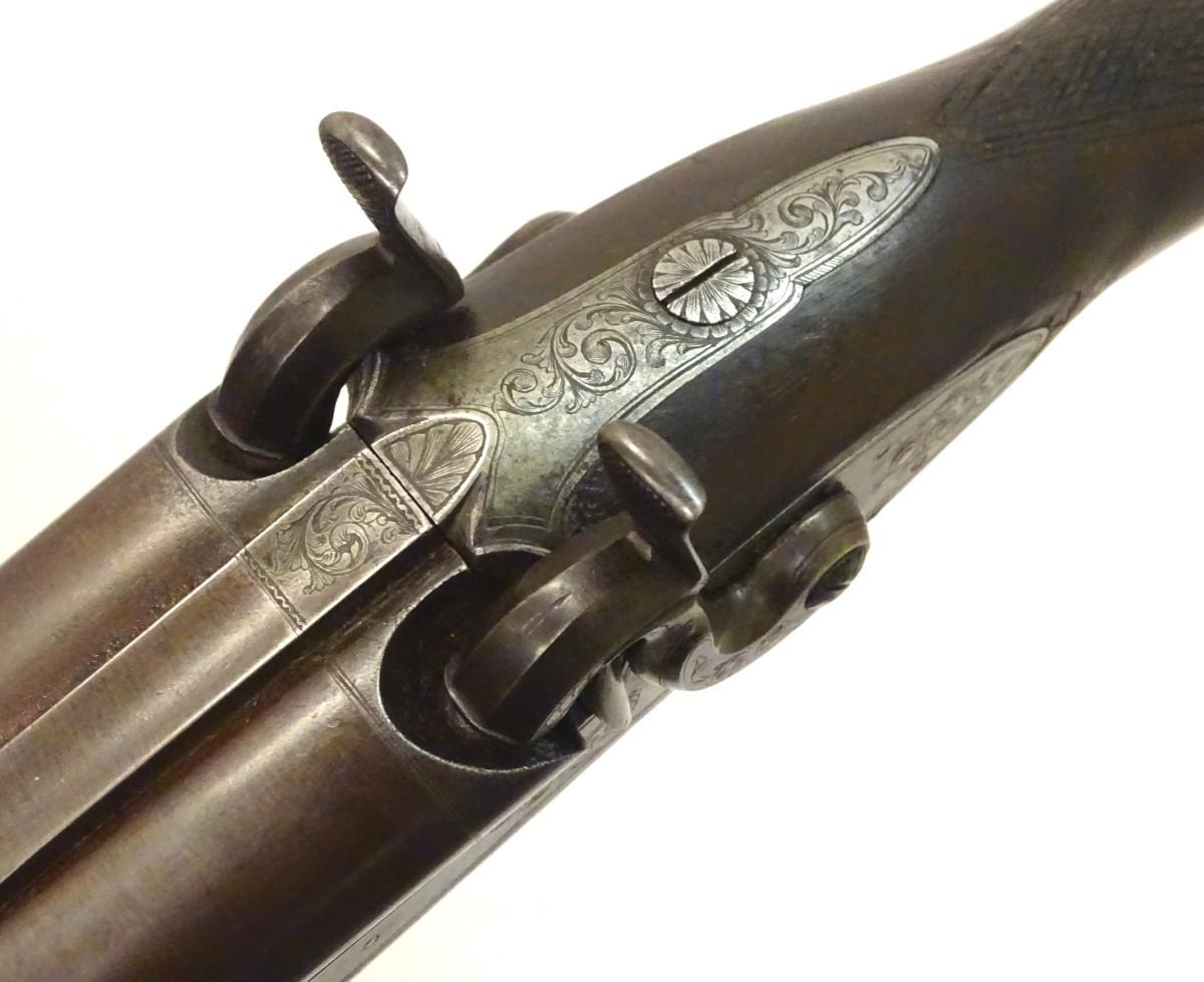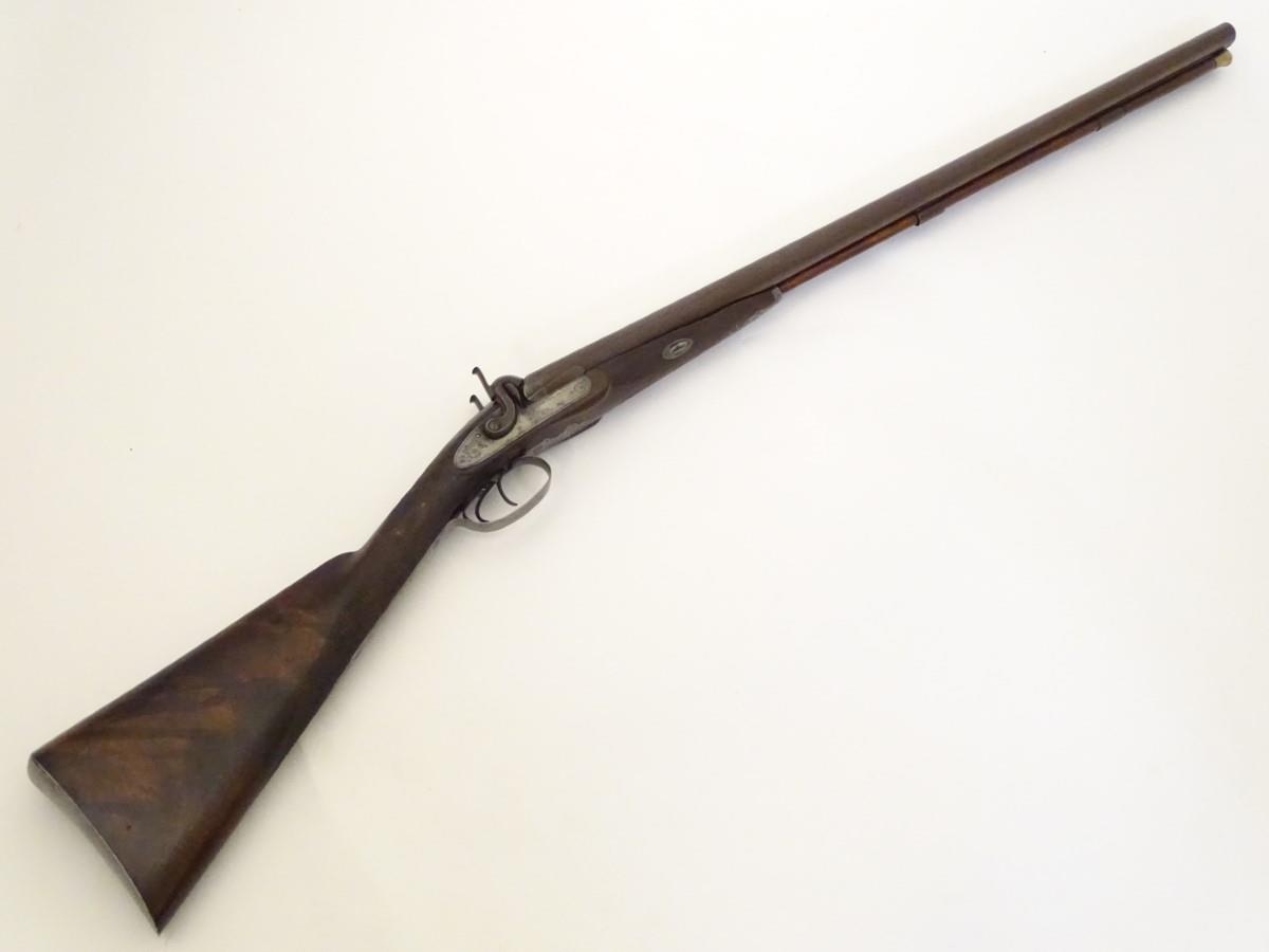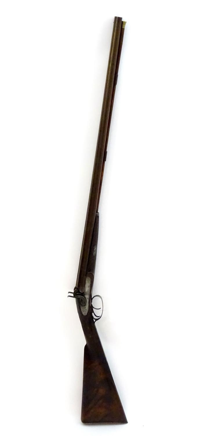 An 19thC American 10 bore side by side percussion muzzleloading black powder hammergun by J. E. Evans, Philadelphia. 30 3/4'' damascus barrels with signed concave rib, stamped under with serial number (453), maker's initials and 'ML' within an oval. Ramrod under. Straight-hand figured walnut stock with chequered palm and fore-end. The action, tang and trigger guard finely engraved with foliate scroll motifs, signed ' J. E. Evans. Phila.' James E. Evans is listed as a Philadelphia maker of 'percussion, duelling and derringer type pistols and fine double shotguns' at various Philadelphia addresses between 1850-1865. Notice to international bidders: Please note we are a UK based auction house. We ask that you take into consideration possible shipping restrictions and shipping costs prior to bidding with us.
