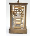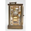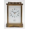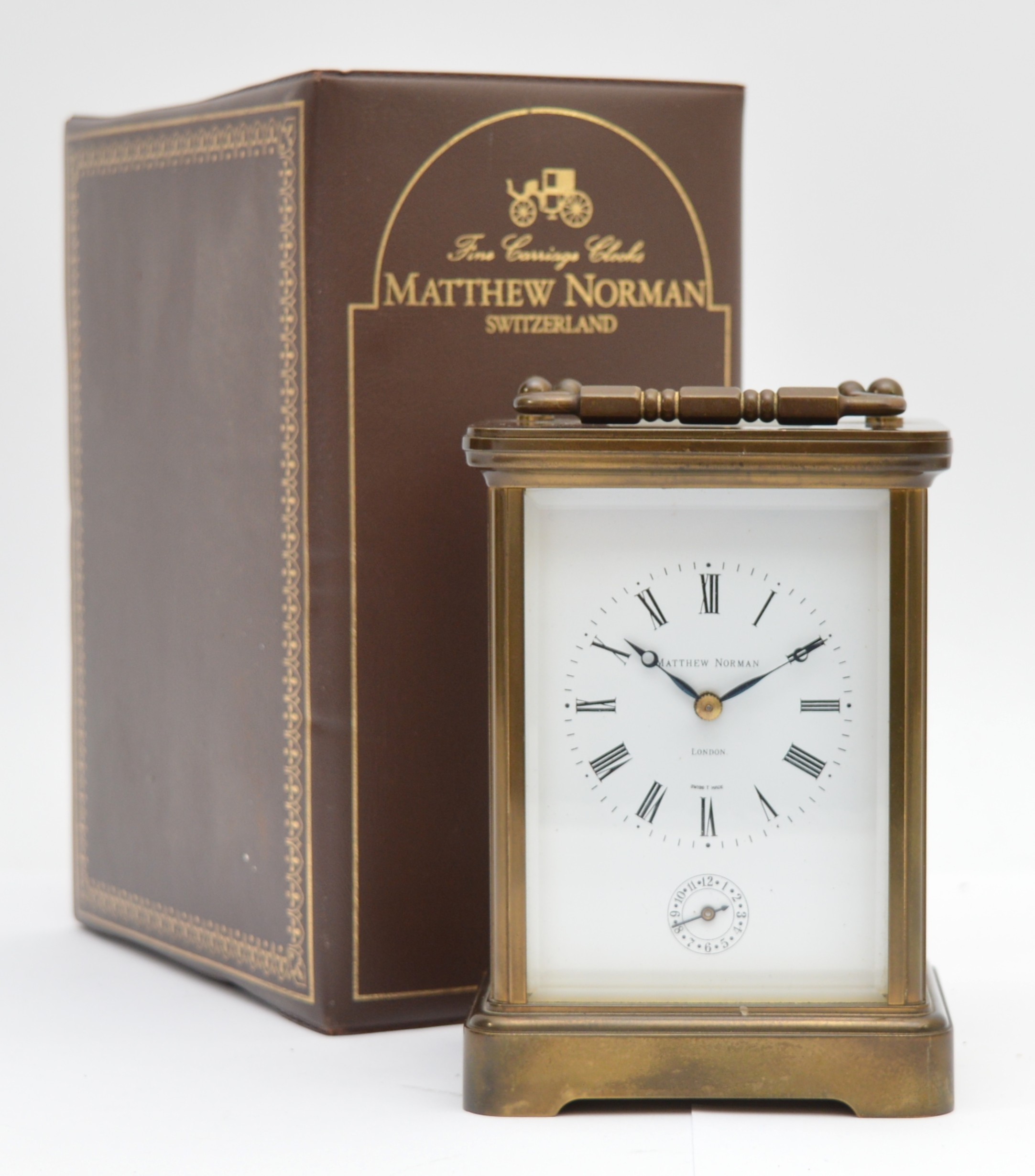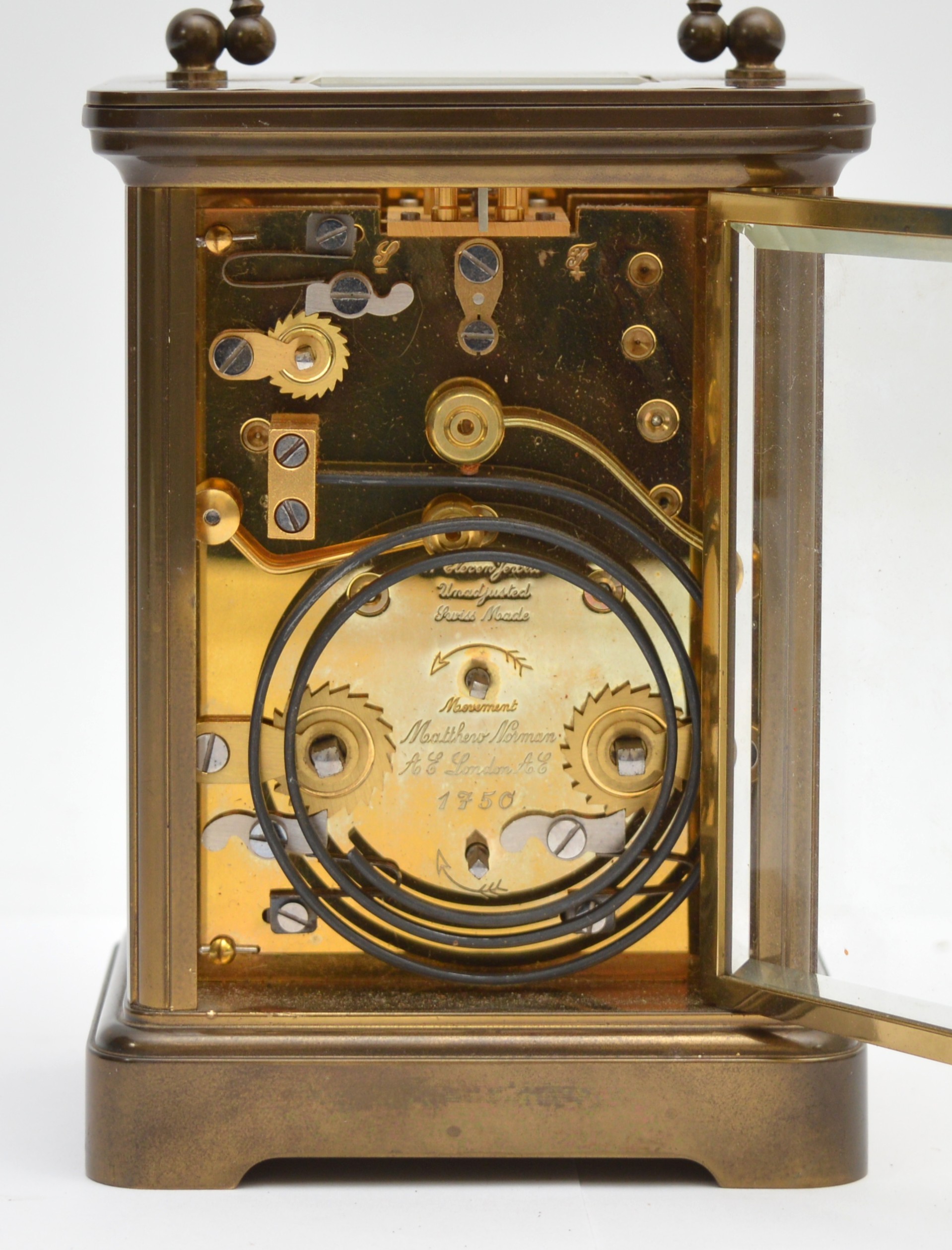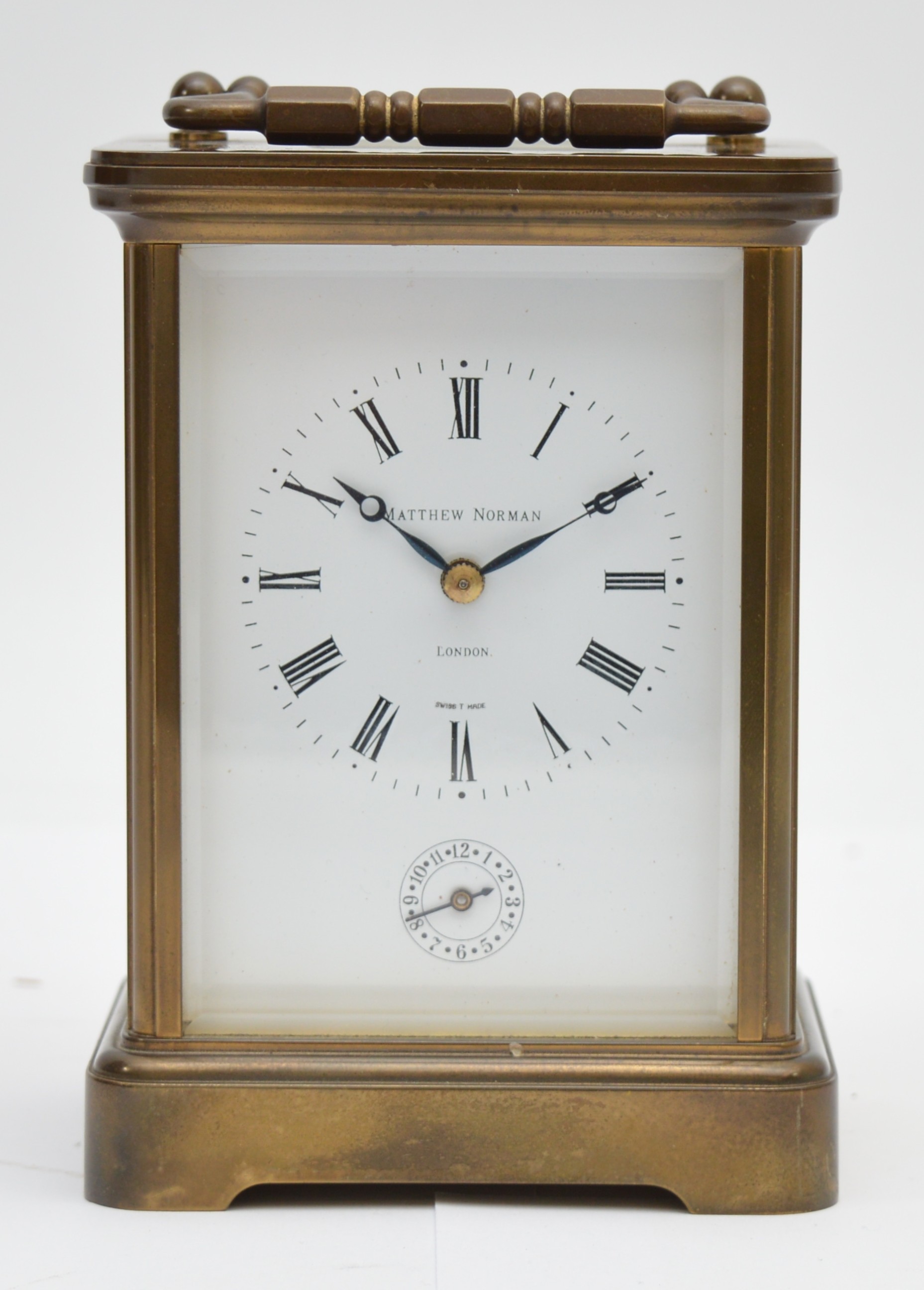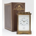 Matthew Norman, a brass alarm and striking carriage clock, signed white enamel dial with Roman numerals, 11 jewel Swiss made movement striking the hours and half on a gong, 14.5cm, case.