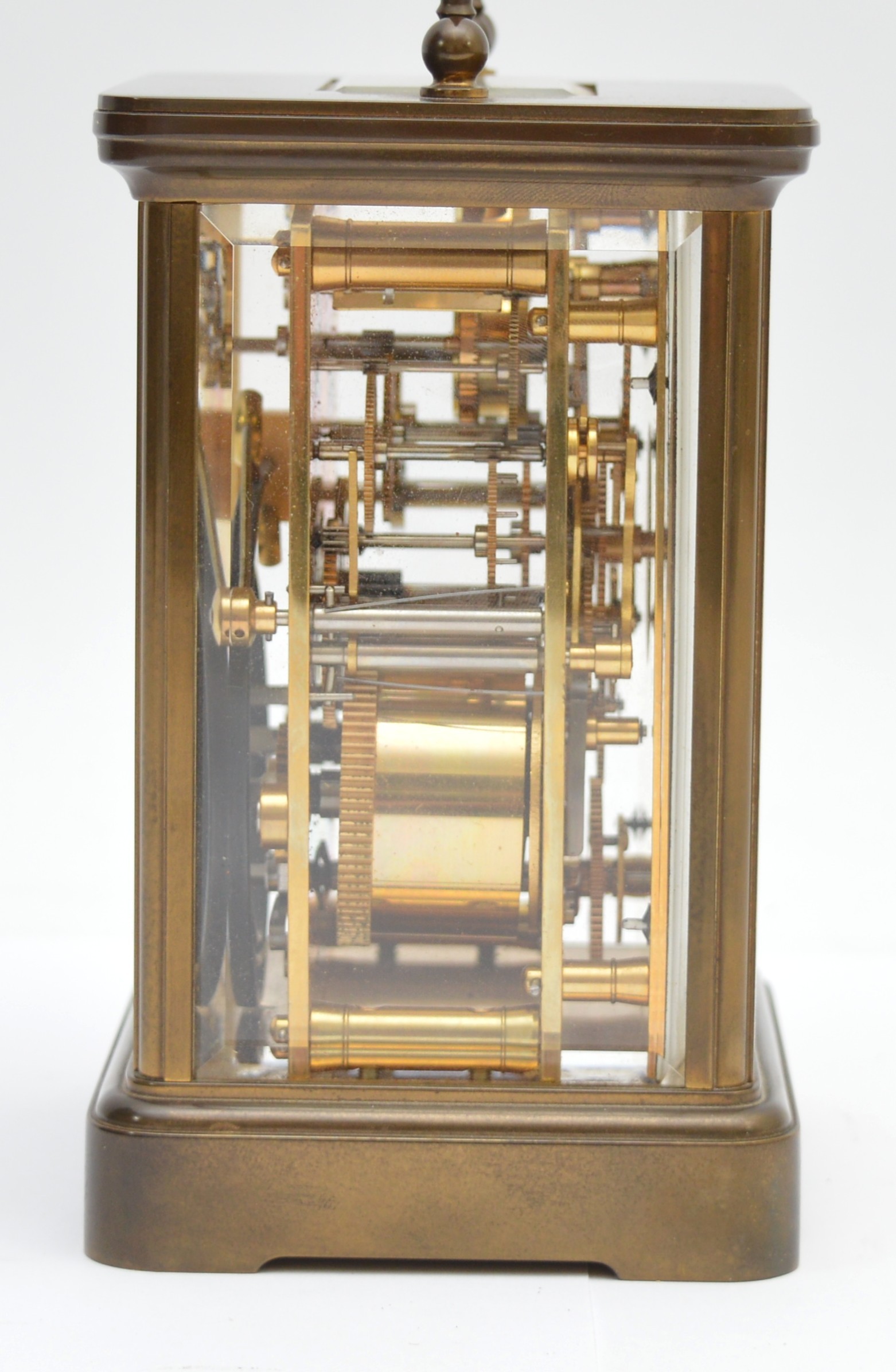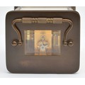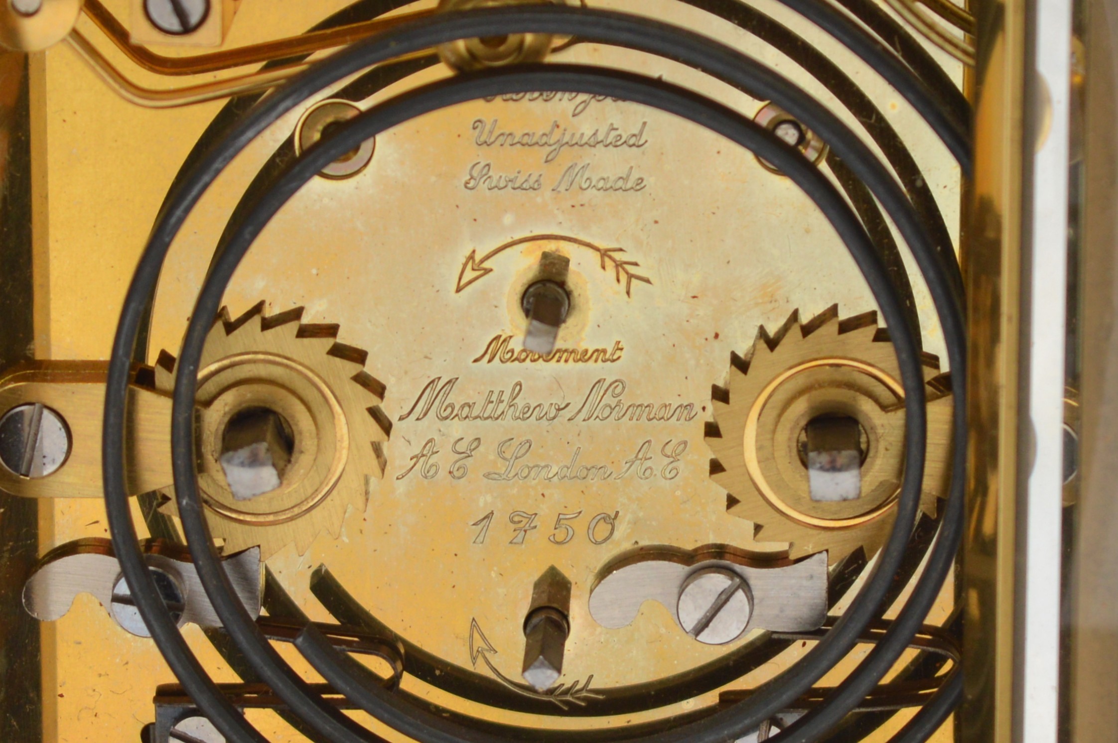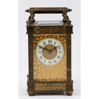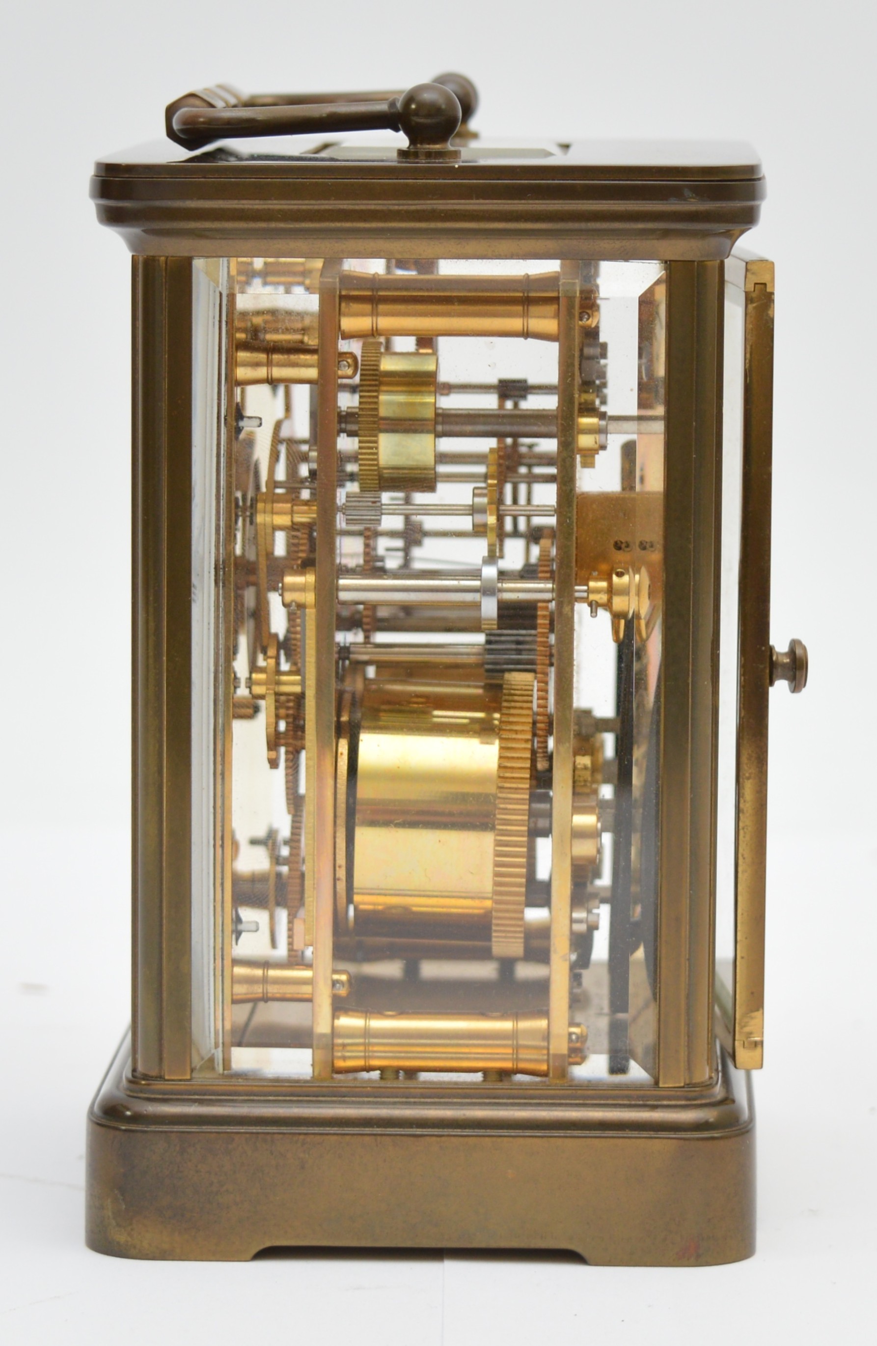 Matthew Norman, a brass alarm and striking carriage clock, signed white enamel dial with Roman numerals, 11 jewel Swiss made movement striking the hours and half on a gong, 14.5cm, case.