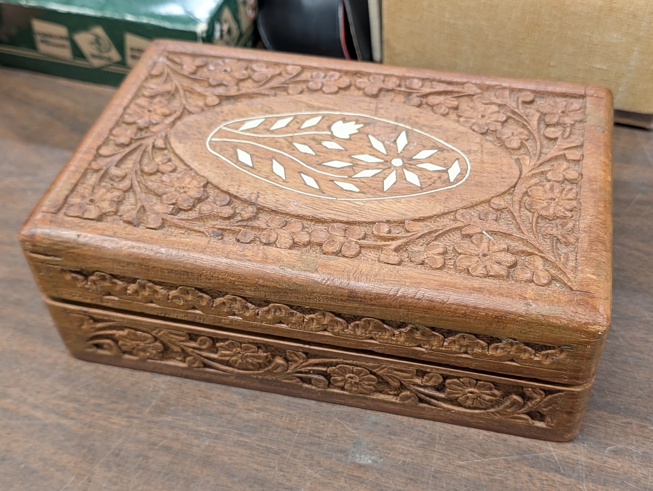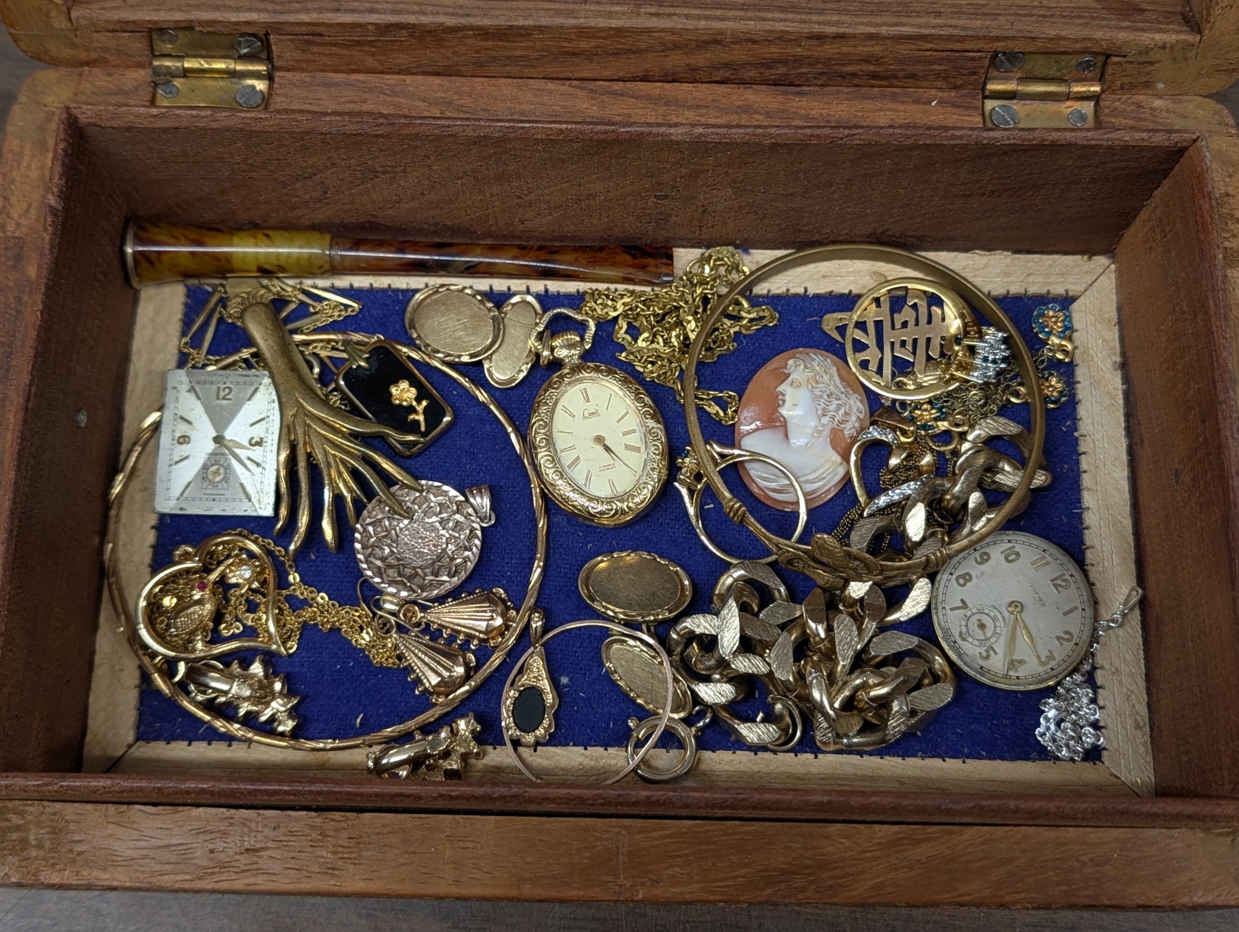 An Assortment of Vintage Costume and some gold filled Jewellery and Watches in a Carved Wooden Box