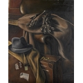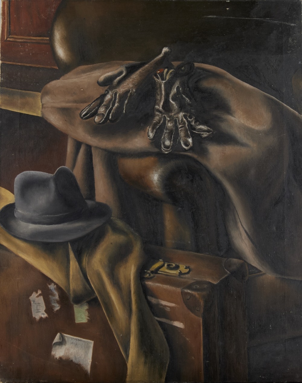 Still life with gloves, hat and a suitcase by a chair;