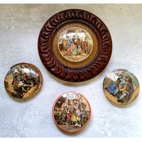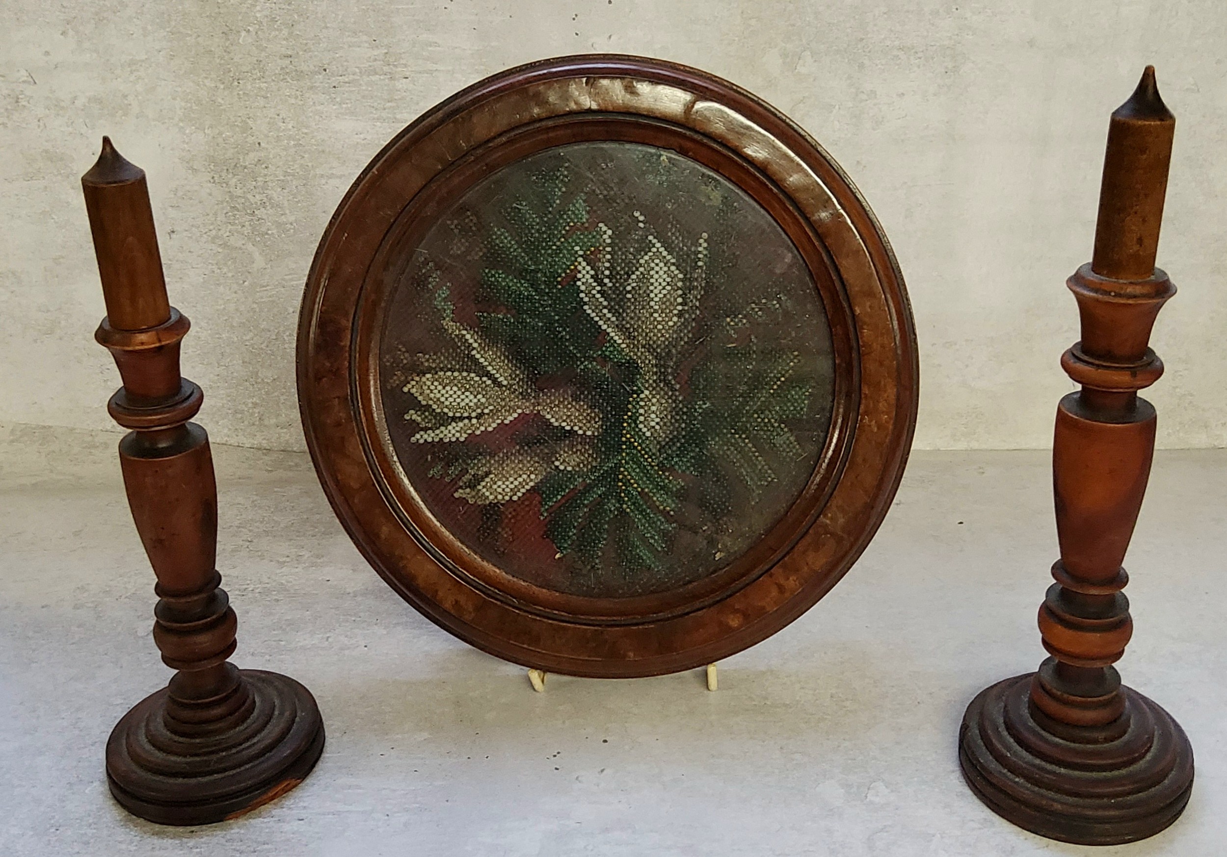 A Victorian beadwork circular panel in a period moulded burr walnut frame mounted on four bun feet; a pair of turned yew decorative candlesticks with wooden candles