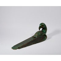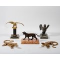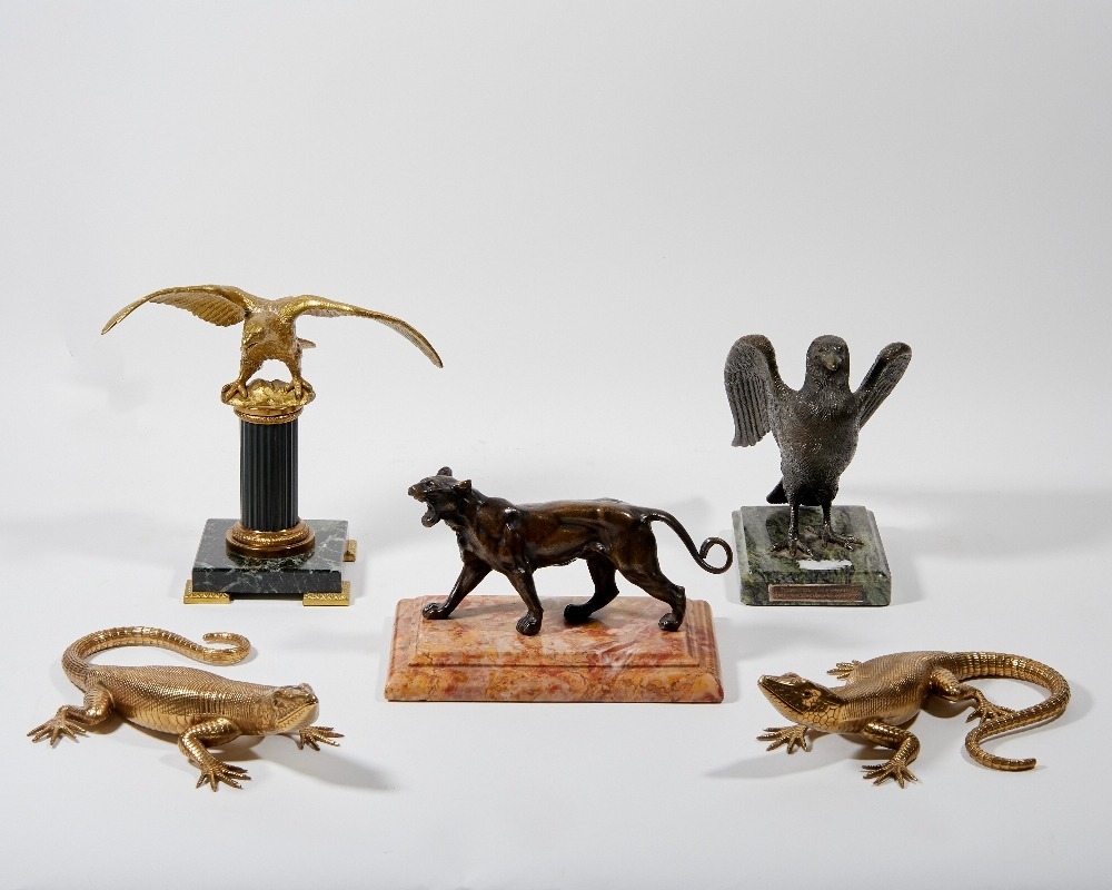 A group of bronze animals, 20th century, comprising: a pacing lioness on a marble plinth, 21cm wide overall; a model of a crow, mounted on a green marble plinth applied with a plaque quoting Mark Twain I HAVE HAD MANY WORRIES MOST OF WHICH NEVER HAPPENDED, 18cm high; a gilt and patinated bronze watch stand modelled as an eagle with spread wings, mounted on a fluted column and green marble plinth, 22cm high; and two gilt models of lizards, 23cm long (5)