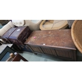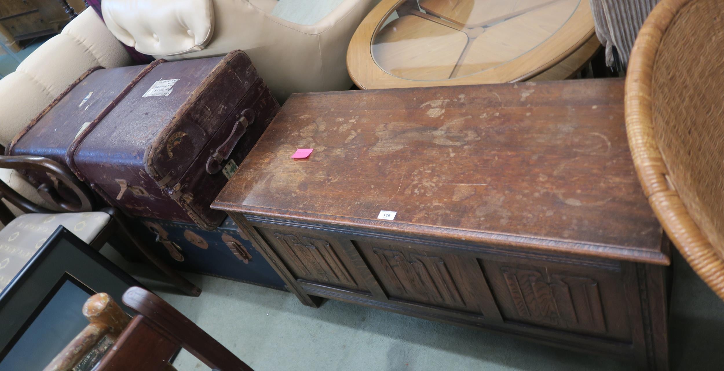 A 20th century mahogany linen fold blanket chest and two travel trunks (3)