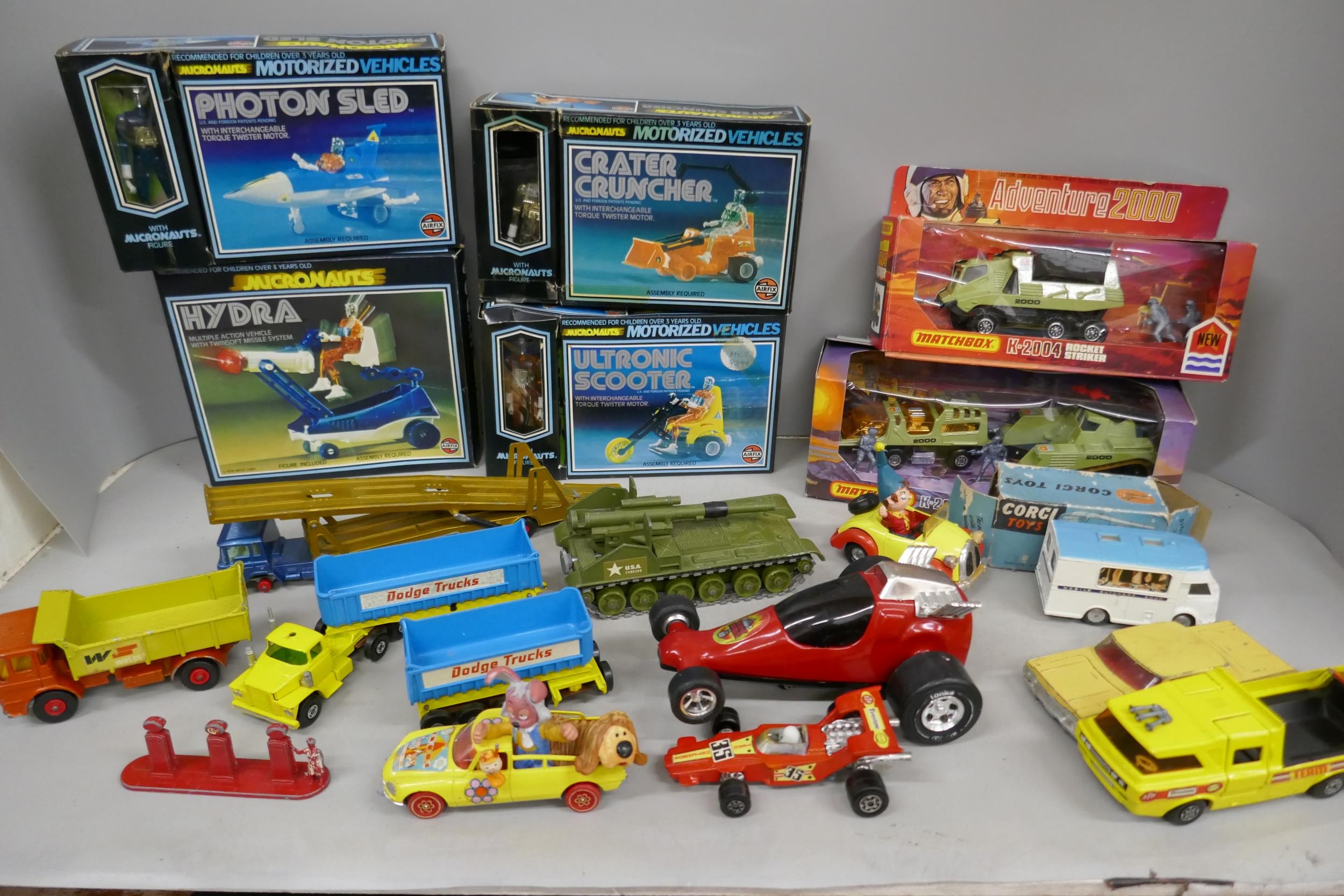 Model vehicles; Matchbox K-2004 Rocket Striker, K-2001 Raider Command, both boxed, Corgi Magic Roundabout, Corgi Noddy's Car, Corgi Toys 413 Family Butchers, box a/f, etc.