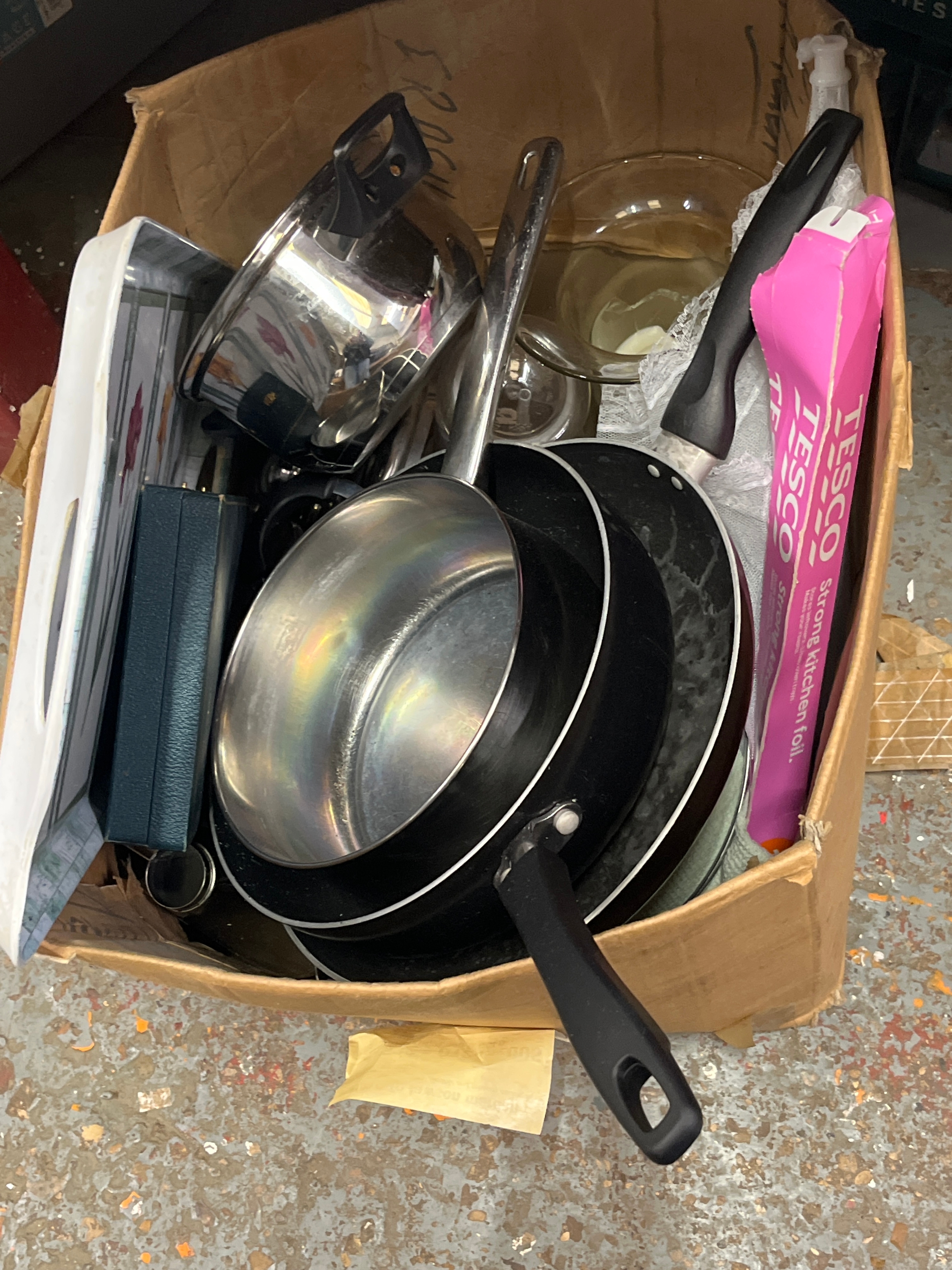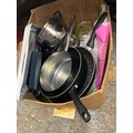Large box of Pans, tray, cutlery etc