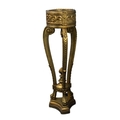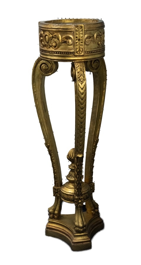 MODERN CARVED GILTWOOD TALL JARDINIÈRE, IN THE GEORGIAN STYLE, the circular top with gilt metal liner and foliate scroll decoration, raised on three acanthus capped scroll supports with paw feet, tied by an ornate moulded, circular finial, and raised on a conforming triform base, 47 ¼” (120cm) high