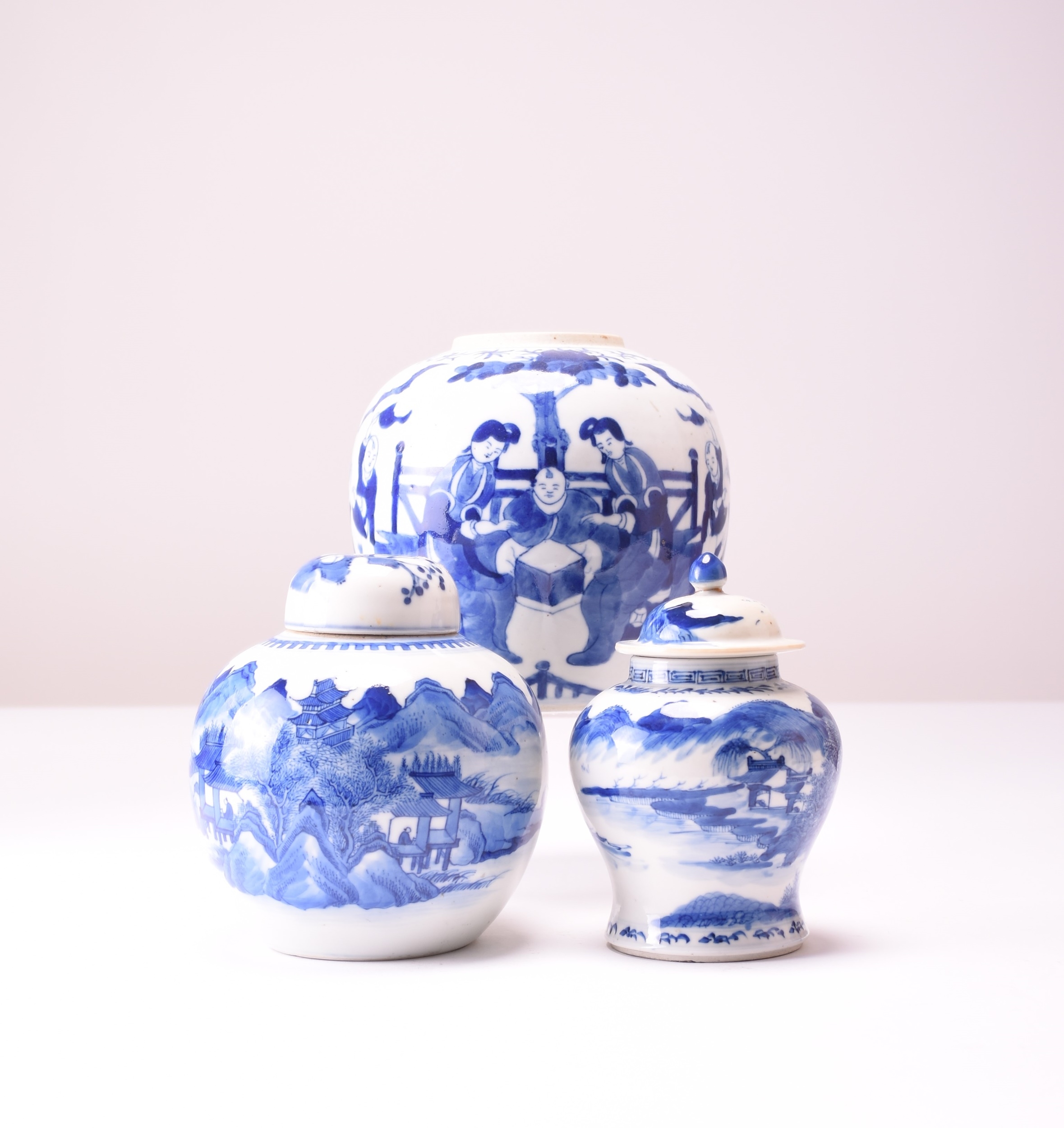 Three Chinese blue and white ginger jars, two with covers, 19th century 16cm, 15cm and 14.5cm high (3) Property of a private London collector.