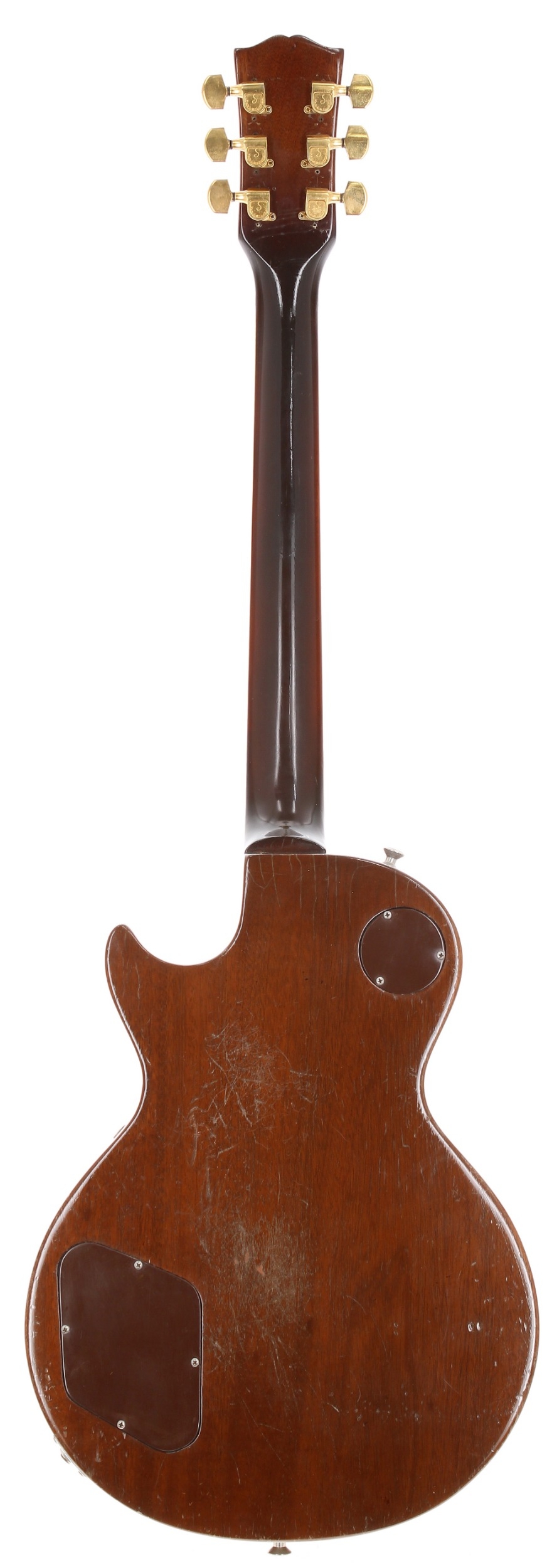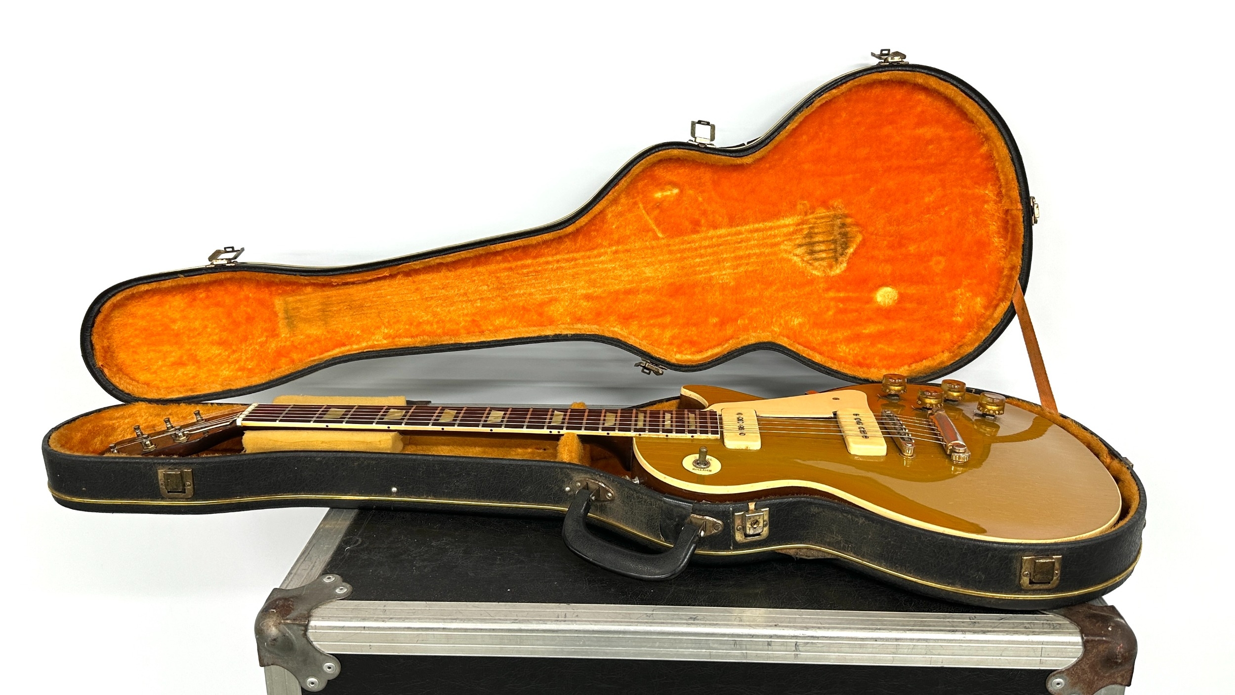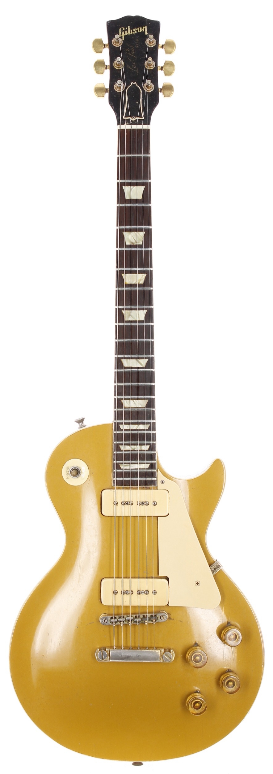 1952 Gibson Les Paul Stopbar with Tune-o-Matic conversion electric guitar, made in USA; Body: gold top finish upon mahogany back, top with lacquer checking and other minor dings, buckle scratching, dings and other blemishes to back and sides, original trapeze holes to body end; Neck: repair with 6" inset reinforcement strip, refinished; Fretboard: Brazilian rosewood with pearl crown position markers; Frets: good, refret; Electrics: working, replacement caps and re-soldering; Hardware: stop bar/Tune-o-Matic conversion, loss to gold plating, replacement Schaller tuners, replacement strap buttons, replacement jack plate, replacement switch tip; Case: non-original hard case; Weight: 4.19kg; Overall condition: fair