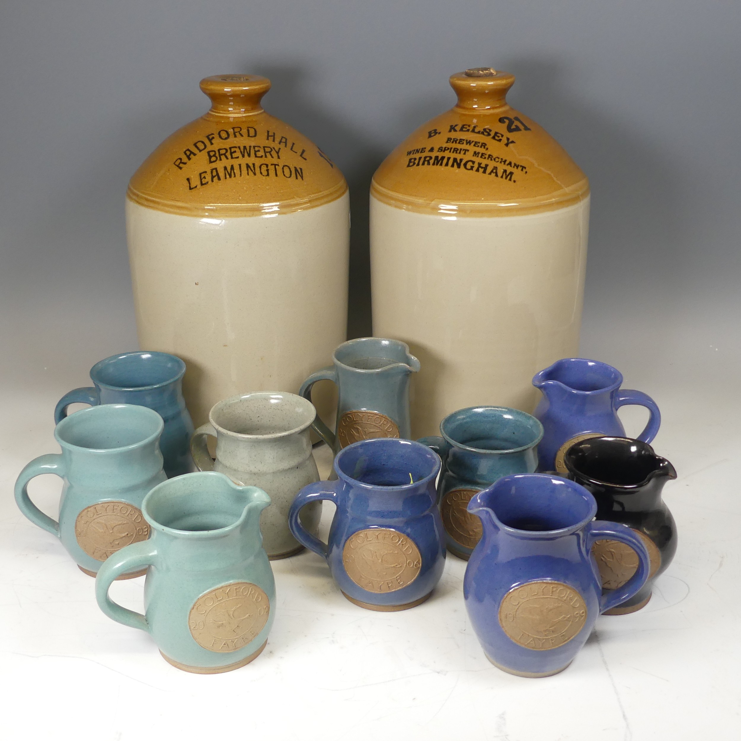 A pair of late 20th century Flagons, H 38 cm, together with a collection of Colyford Fayre Jugs, dating 1997-2006, and a copper hunting Horn. (11)