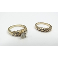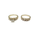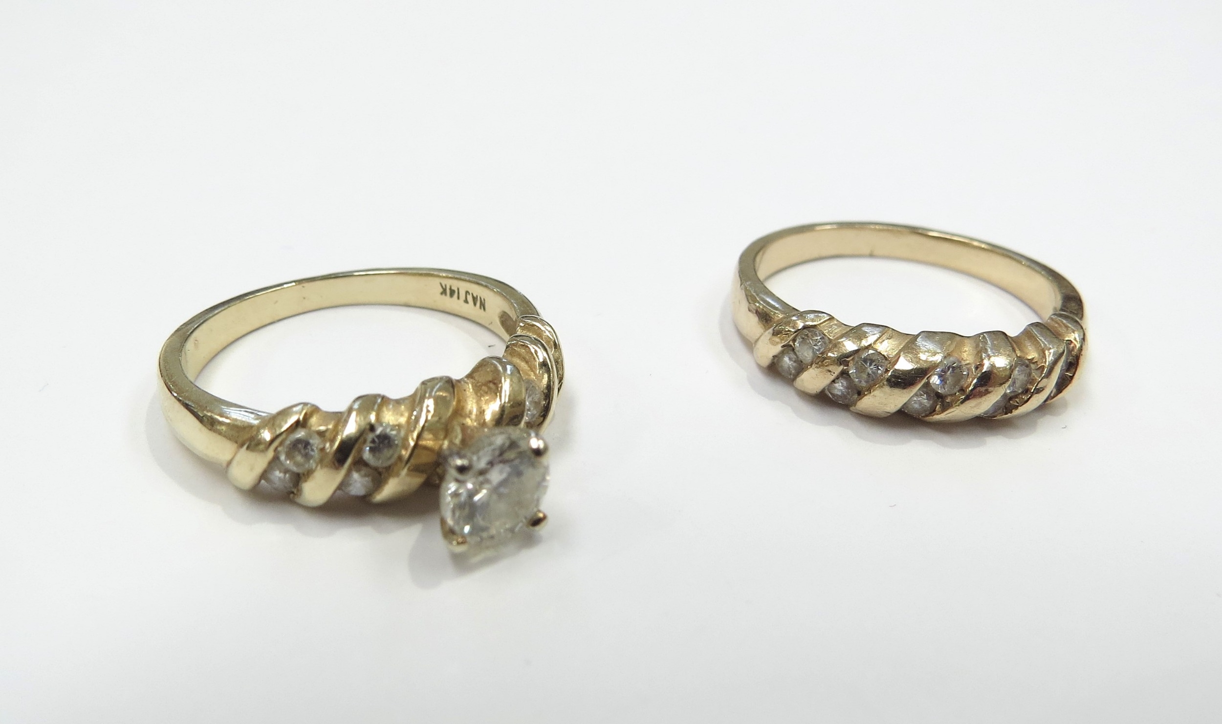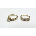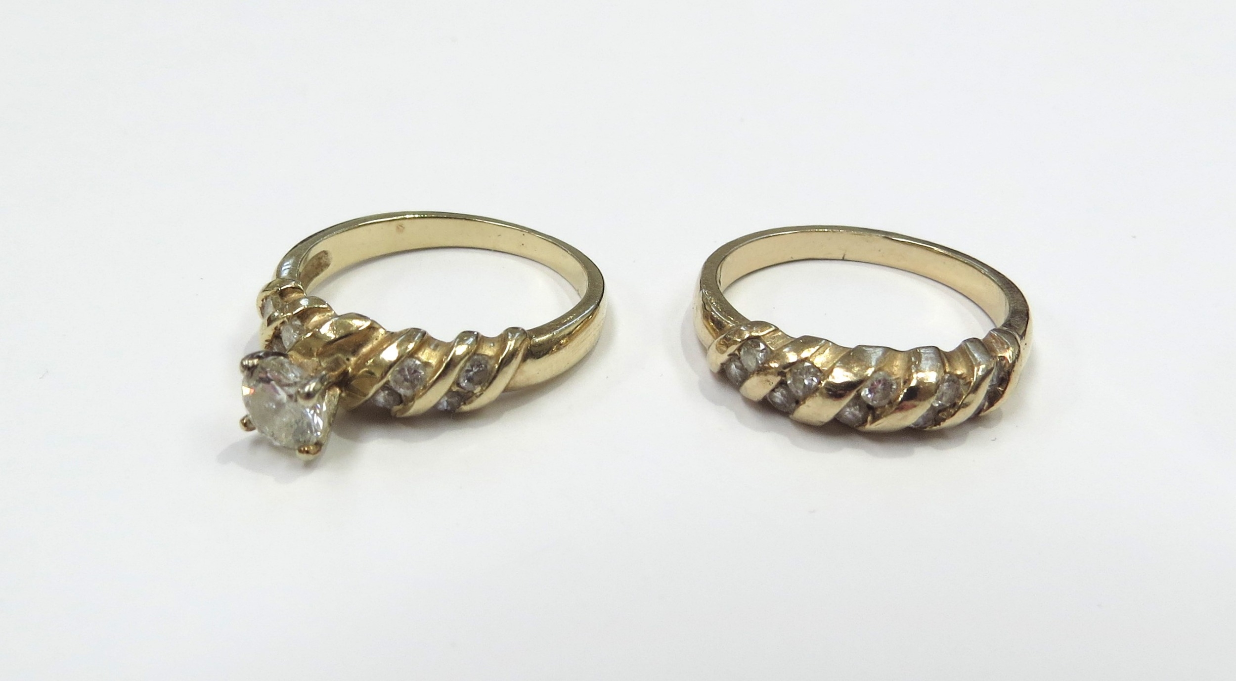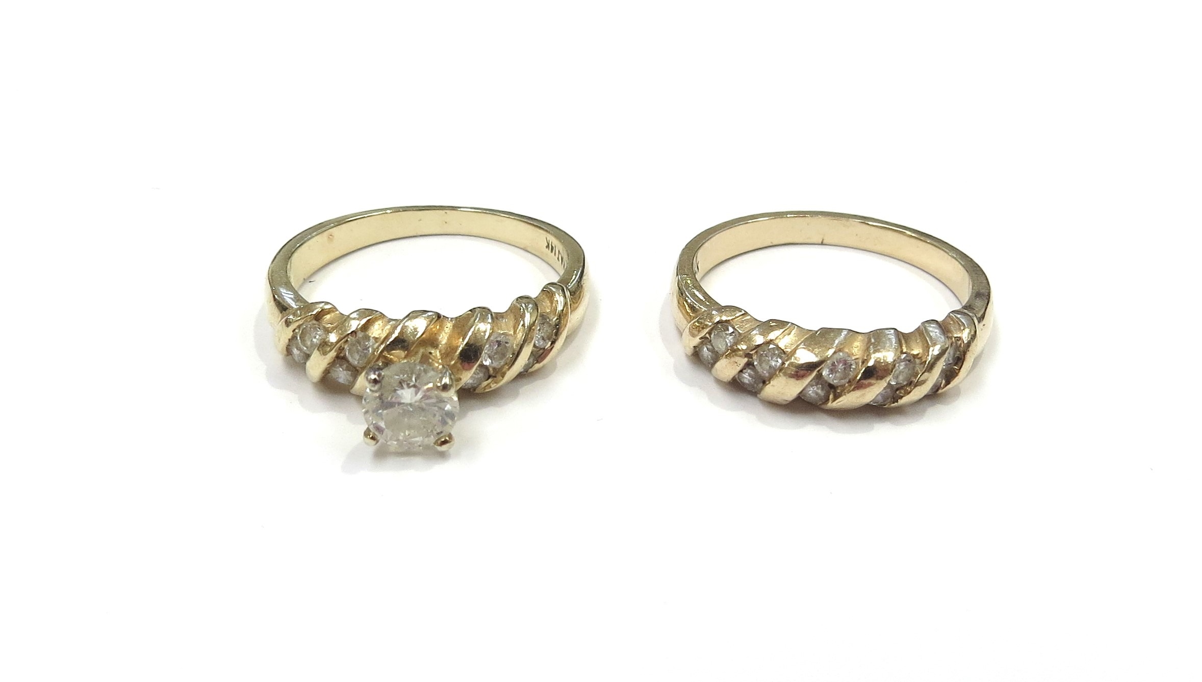 A diamond solitaire ring 0.40ct approx flanked by four brilliant cut diamonds, stamped 14k, with a matching diamond set band. Size K/L, 6.4g