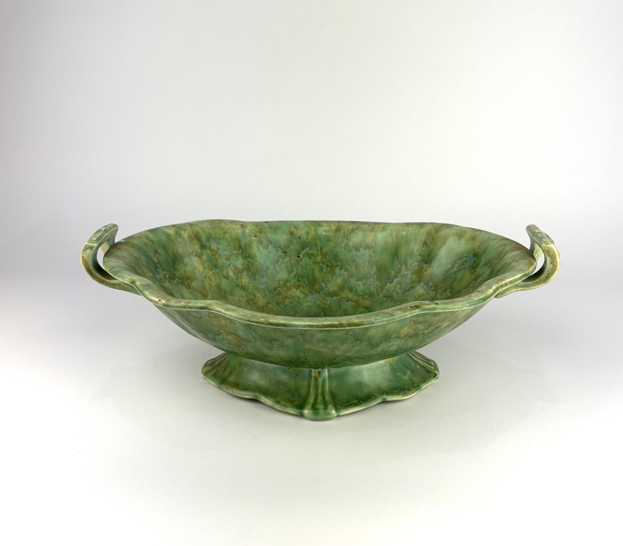An Art Deco Crown Devon two handled pedestal dish with green mottled glaze 31.5cm wide, 11cm high