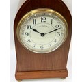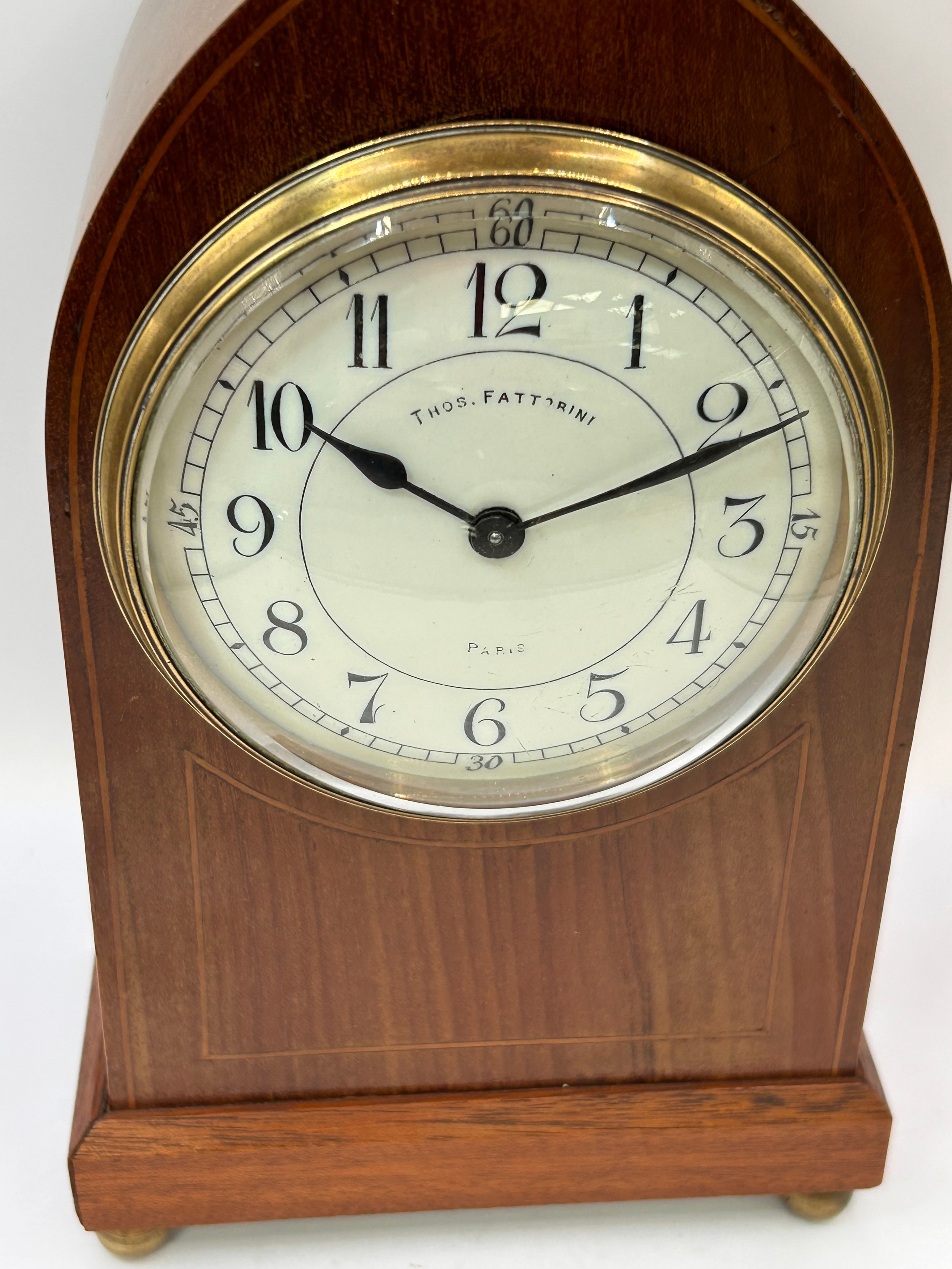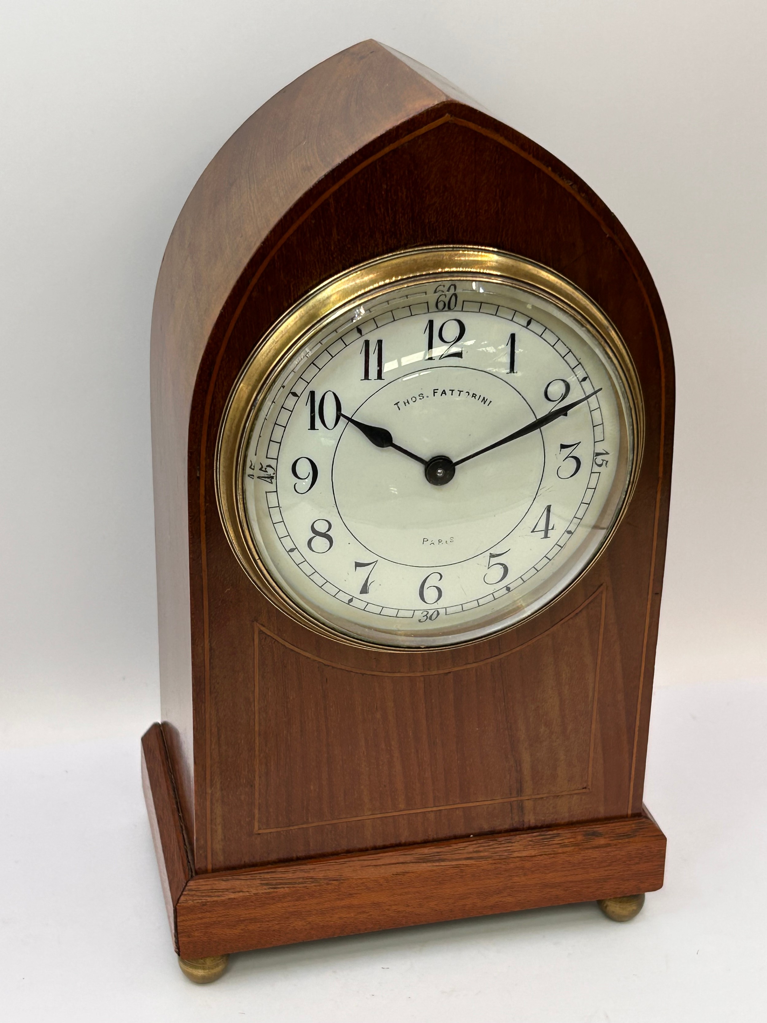 Stunning Fattorini Mahogany Inlaid Lancet Mantle Clock , Running Order With Key, Standing On Bun Feet,9"