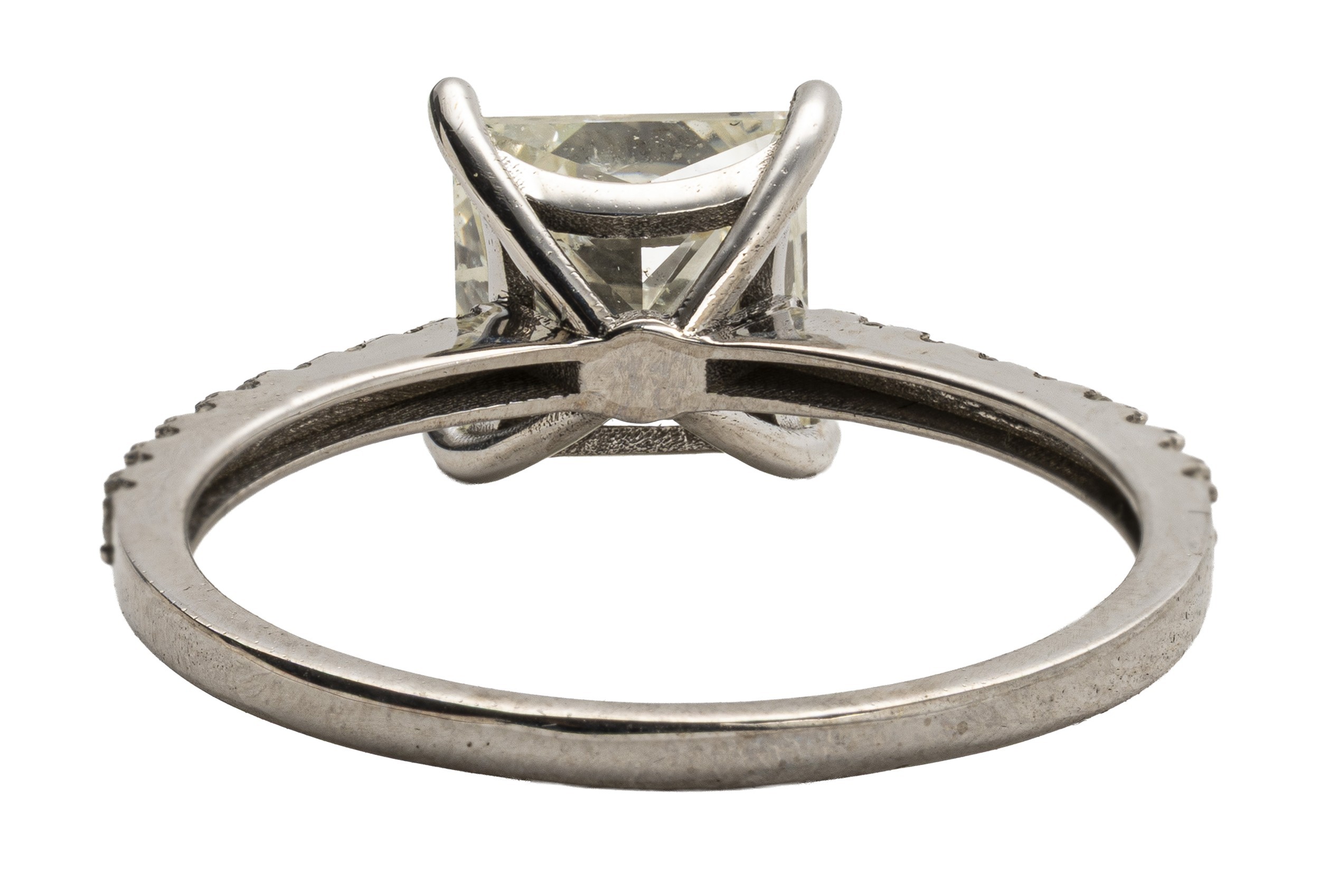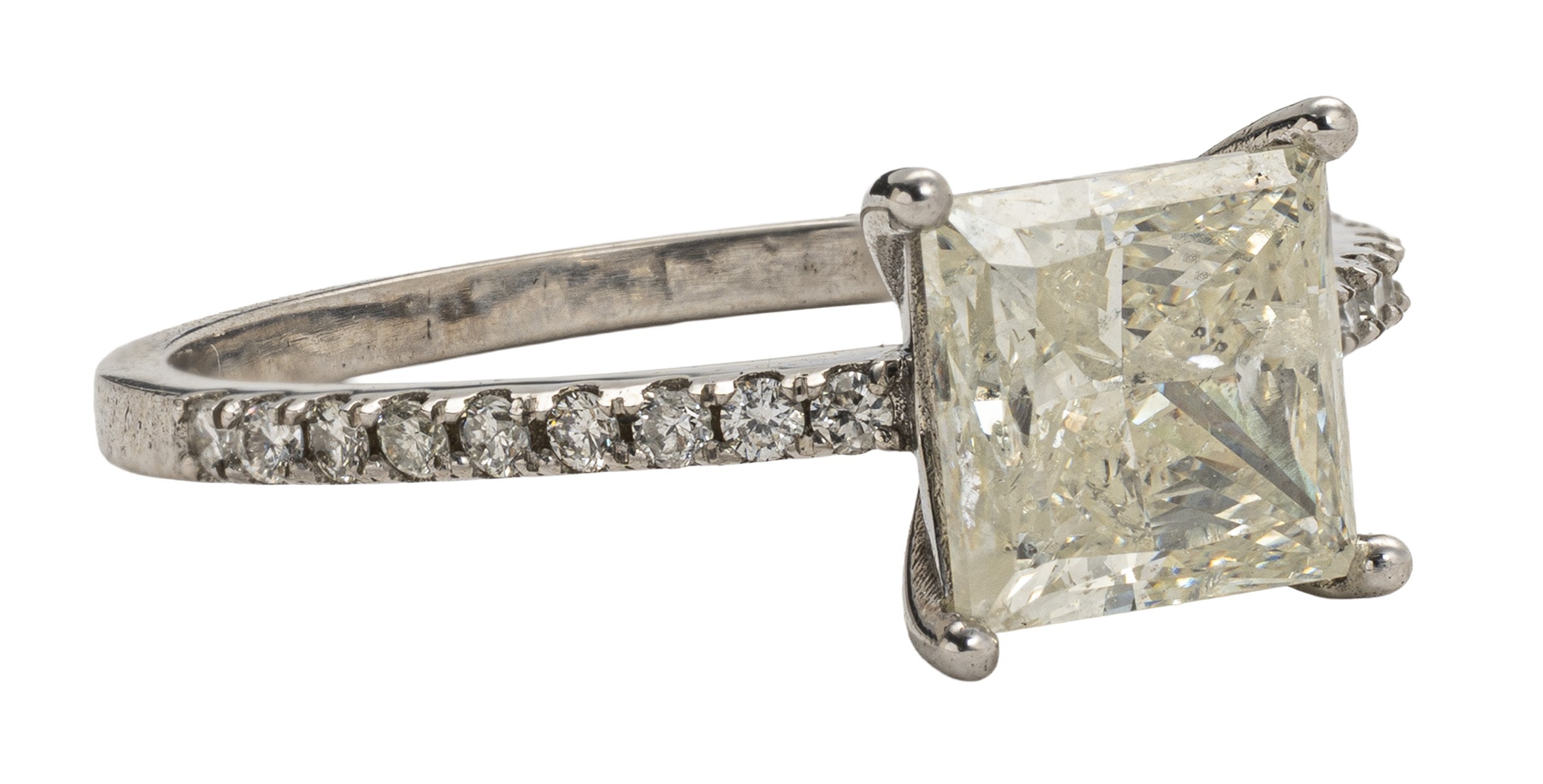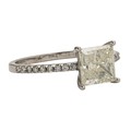 Claw set to the centre, the princess cut diamond 2.02 carats colour L, clarity I1, accompanied by IGI certificate number 476151953 flanked by a total of 0.43 carats of round brilliant cut diamonds colour G, clarity VS, in 18ct white gold, size M, 1,85g all in