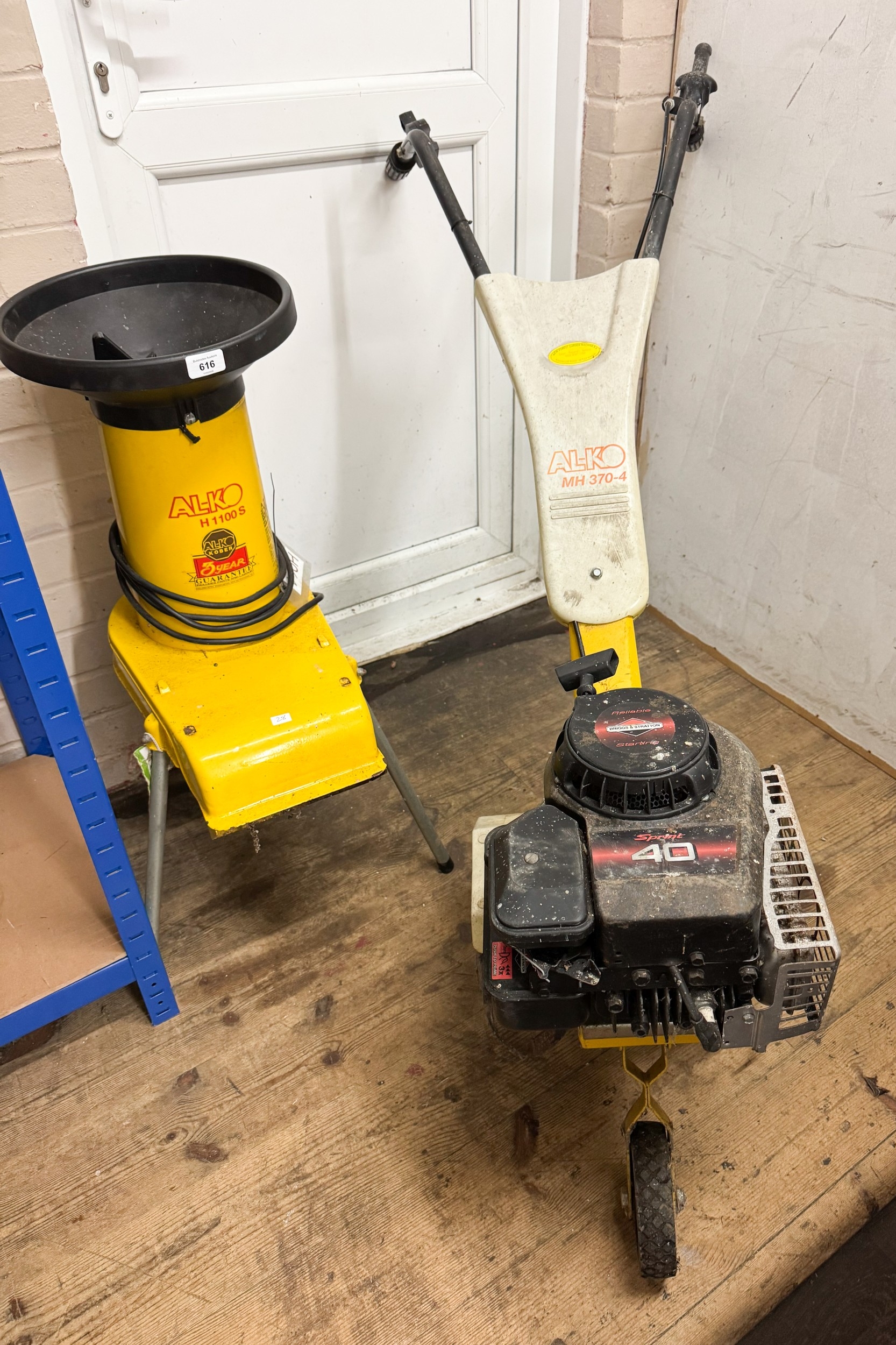 An Alko H 1100 S garden shredder together with a Alko MH 370-4 petrol engine rotavator