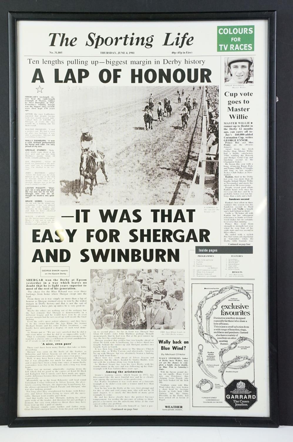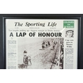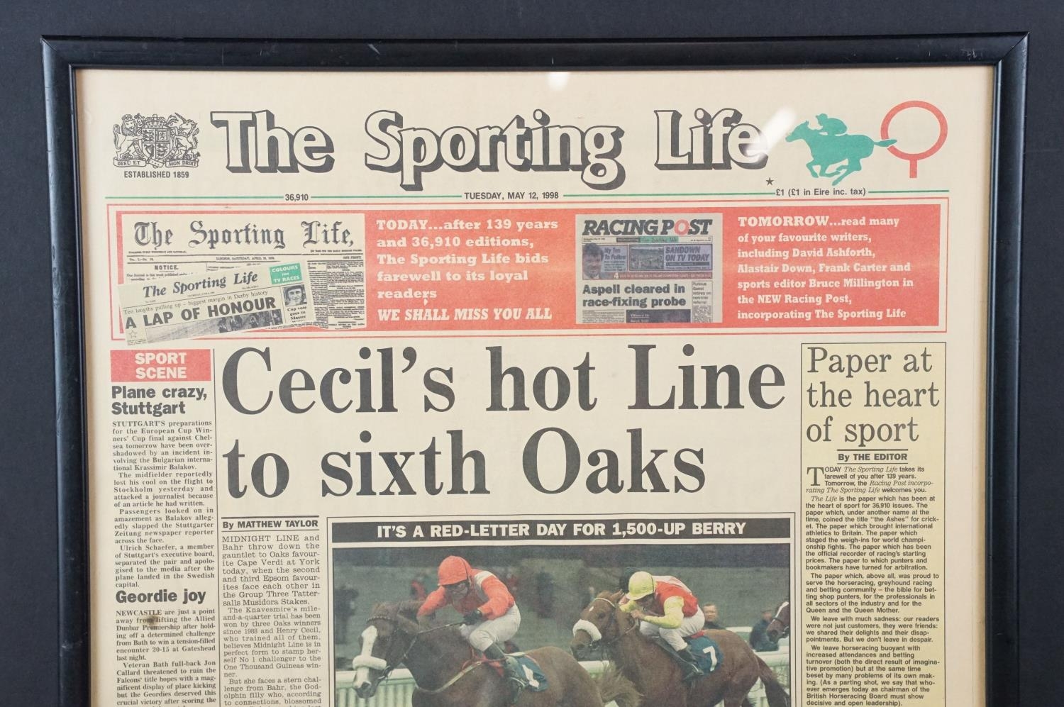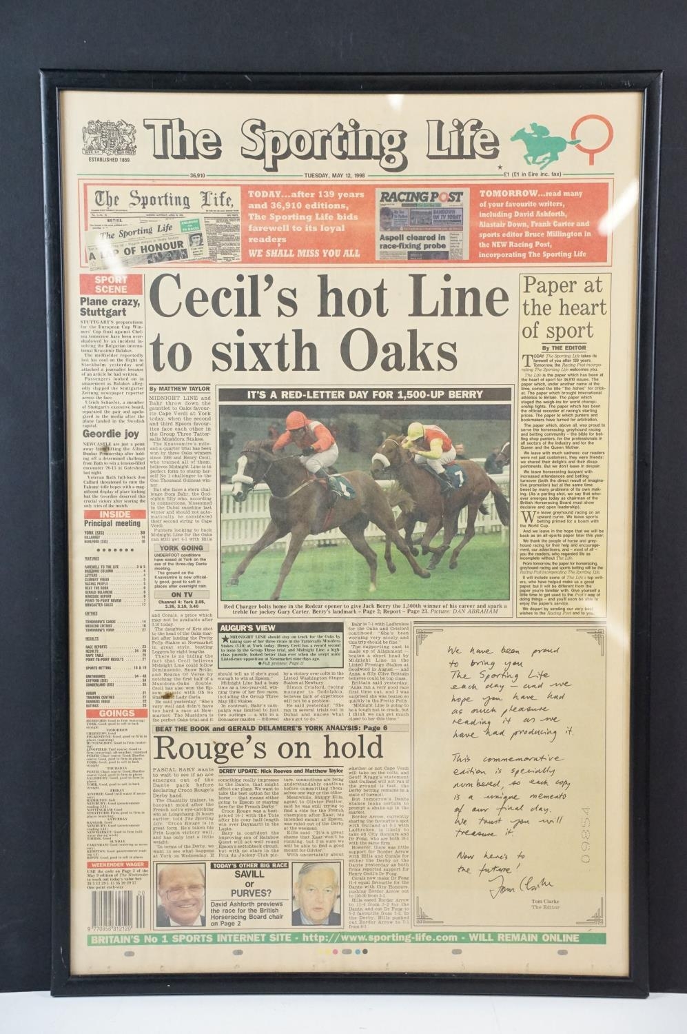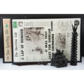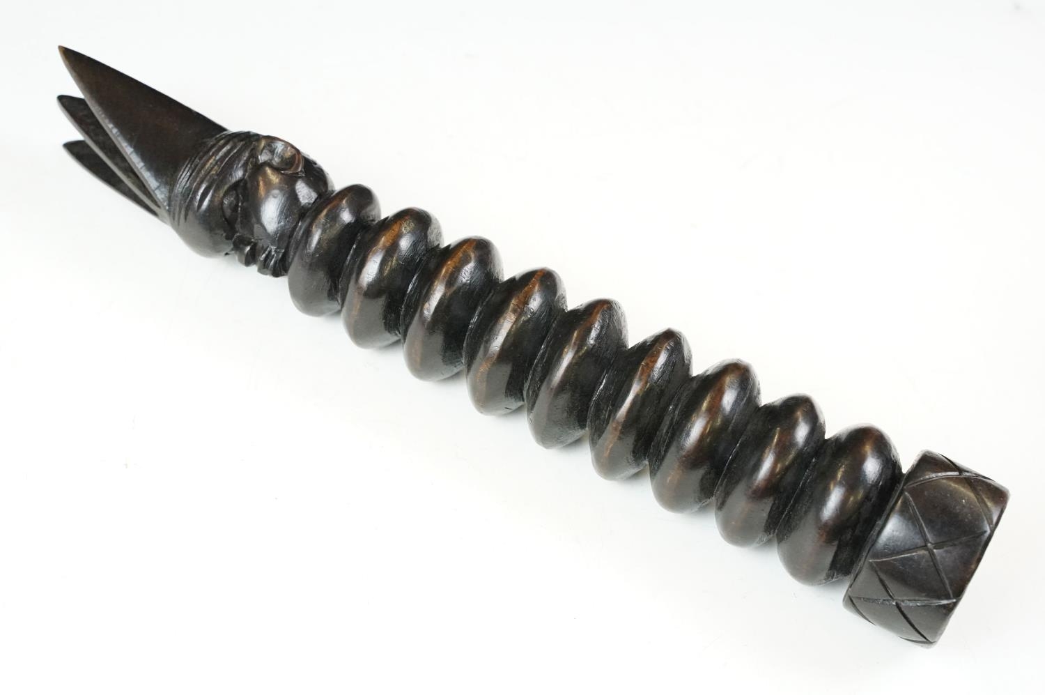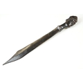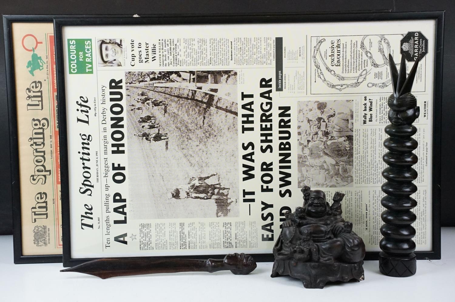 A vintage hand carved ebony letter opener together with a tribal figure and resin buddah with two framed The Sporting Life prints.