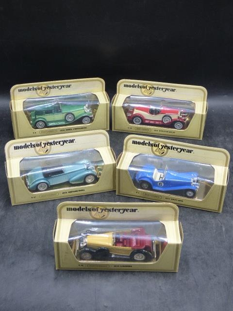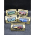 Five Matchbox Die-Cast Models in Display Cases including Riley, Lagonda, Stutz, Hispano, and Duesenberg