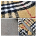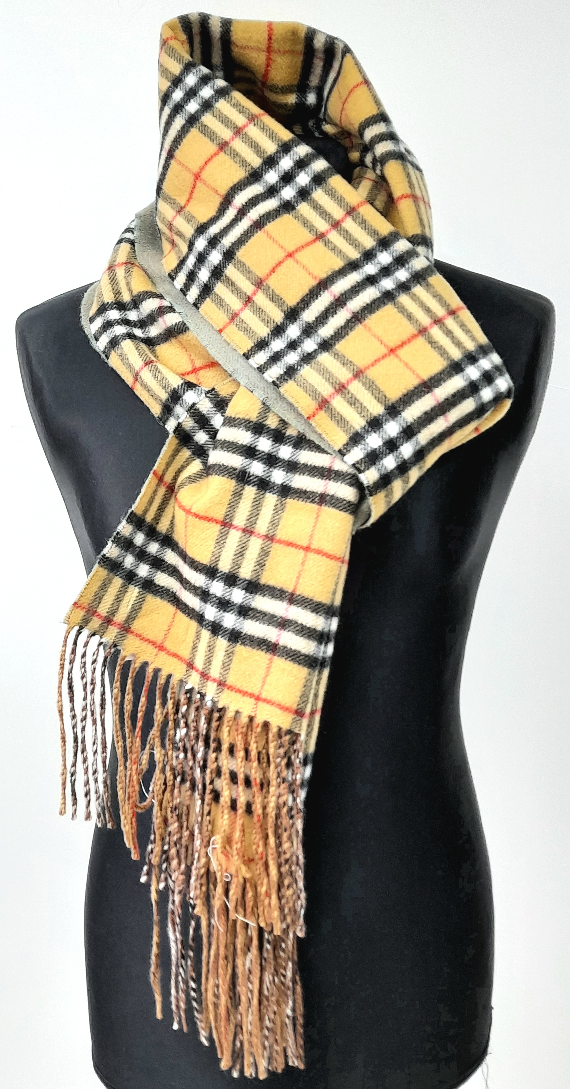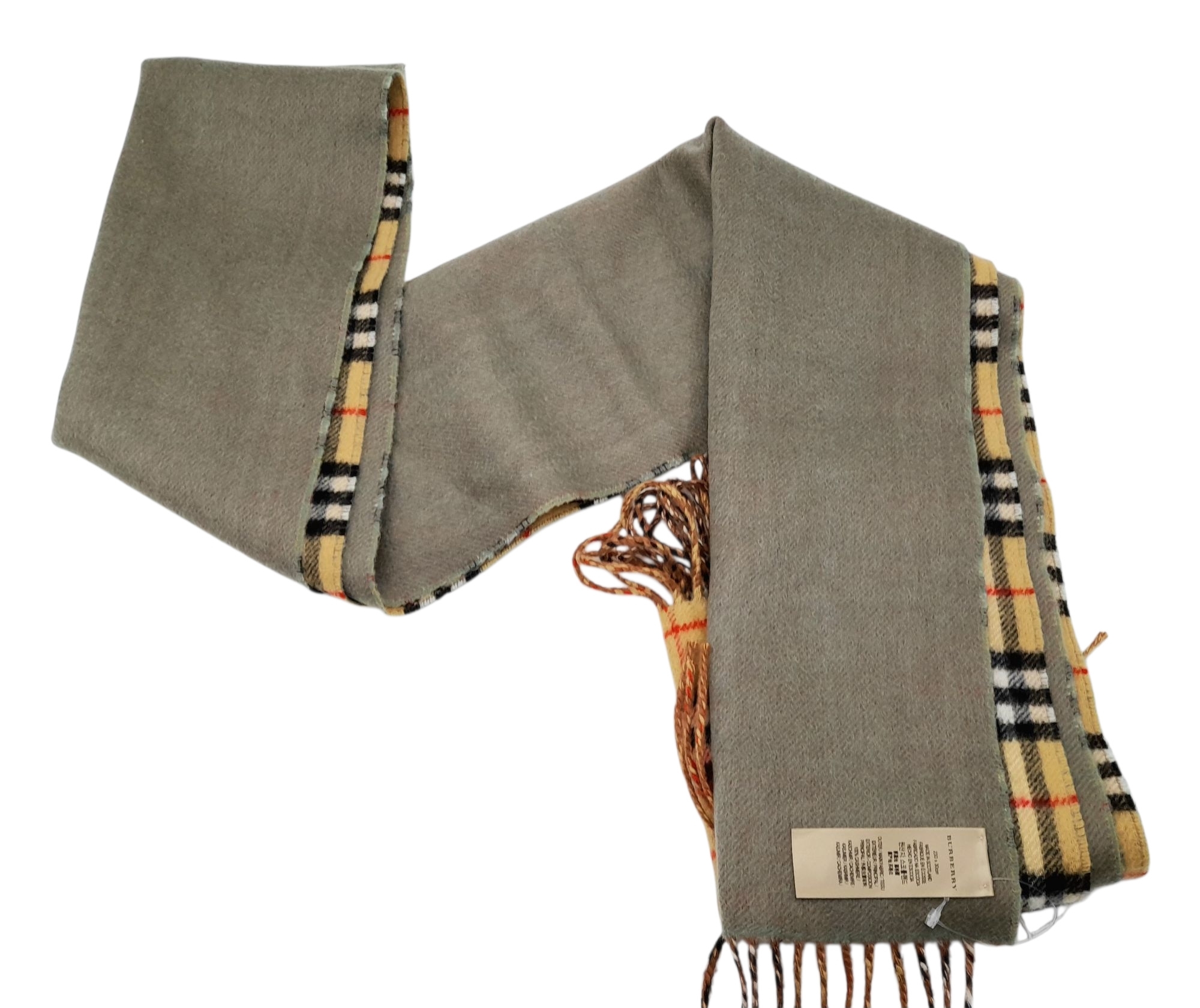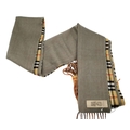 A Burberry Wool Cashmere House Check Fringe Scarf in Camel and Green. Featuring Burberry’s classic camel House Check on one side and a contrasting green on the reversible side, finished with fringed edges. Approximate size: 230cm length x 30.5cm width. Ref: J6