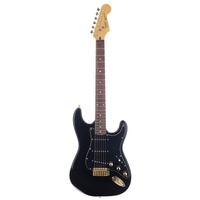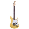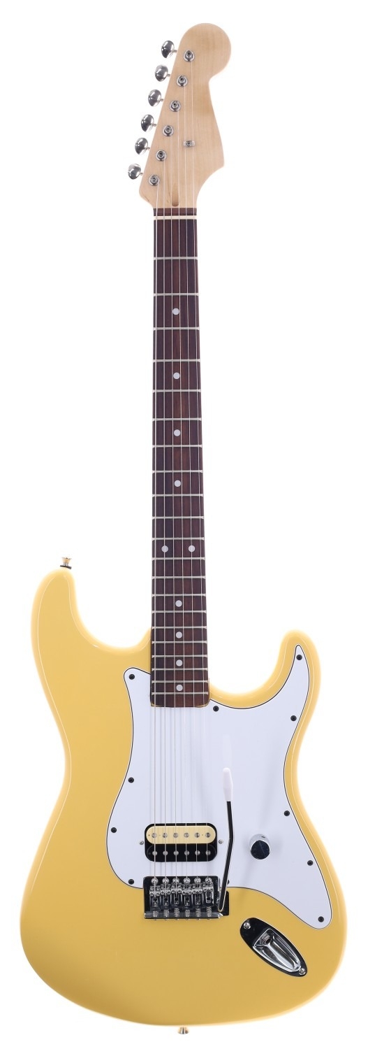 Partscaster Strat type electric guitar with yellow finished body, twenty-one fret rosewood board neck, Alnico zebra humbucker pickup and Fender vintage style tuners