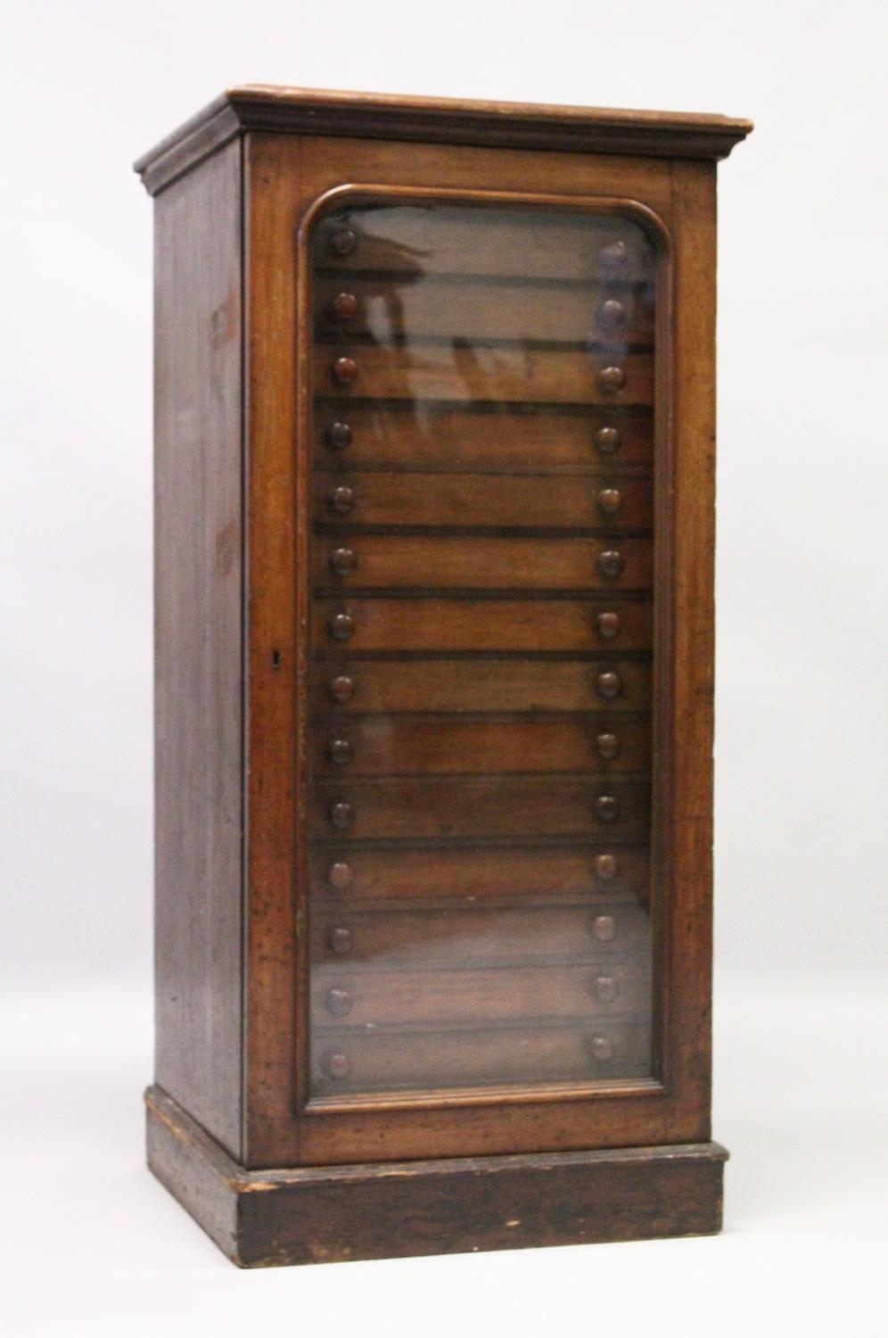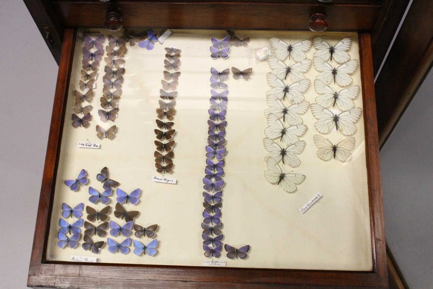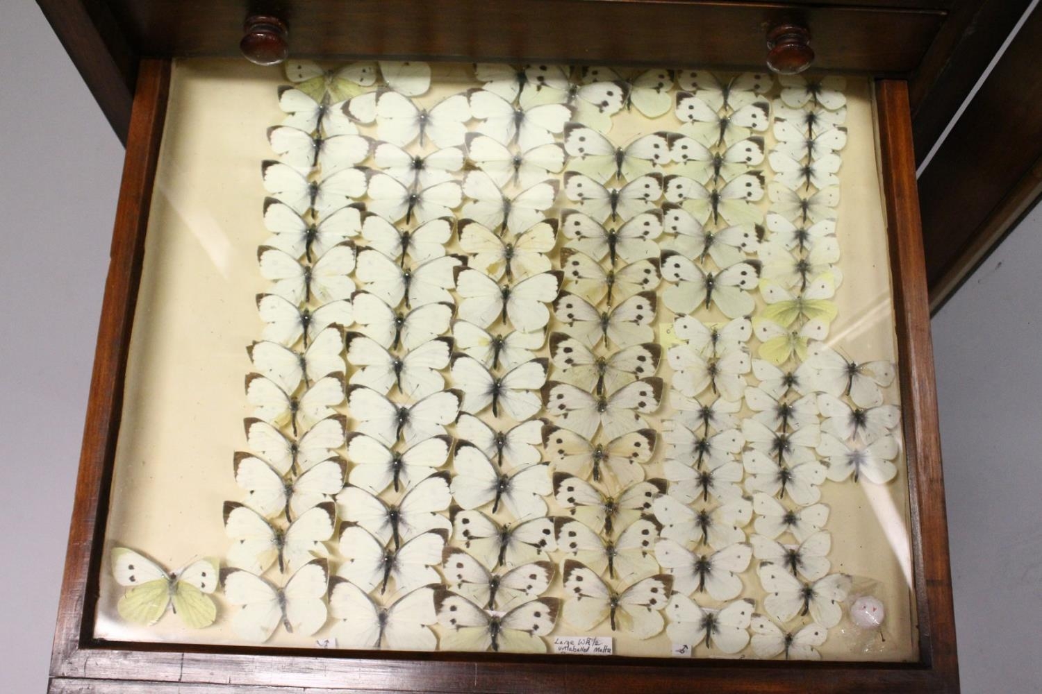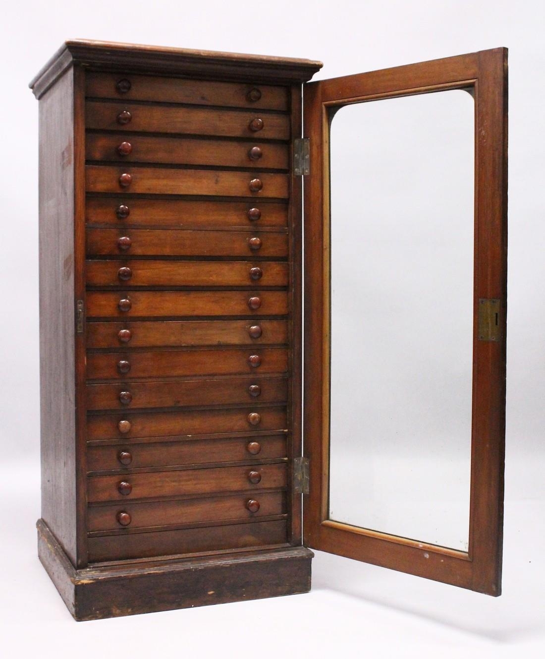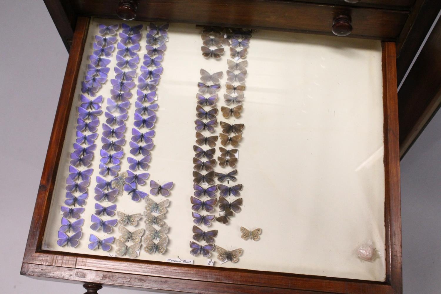 A VERY GOOD VICTORIAN MAHOGANY COLLECTORS CABINET, with glass front door enclosing 14 glass top drawers with wooden handles, containing a collection of Victorian butterflies.
