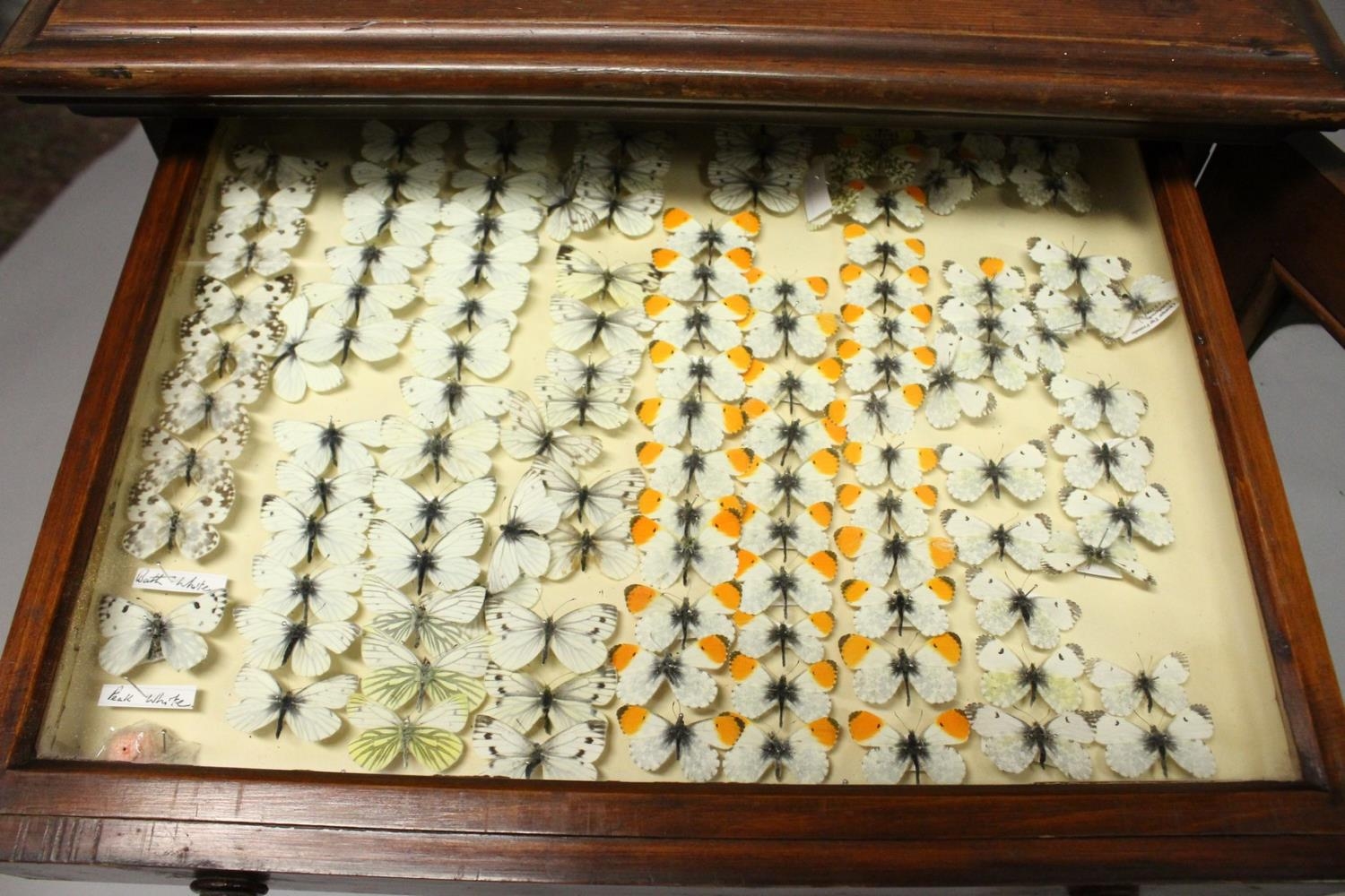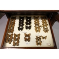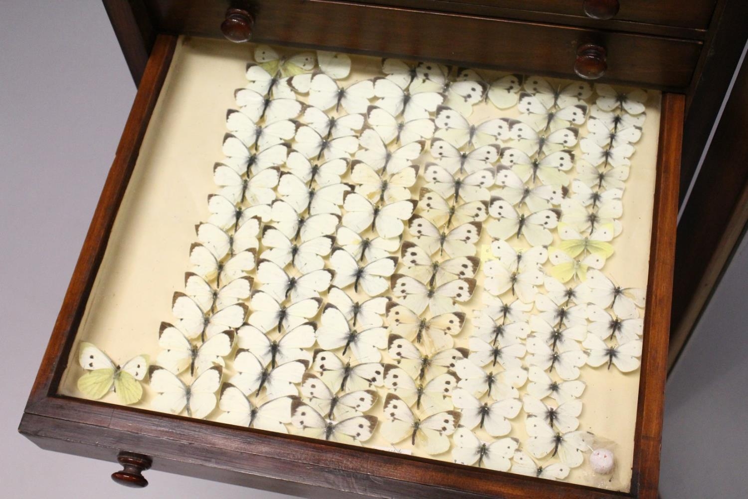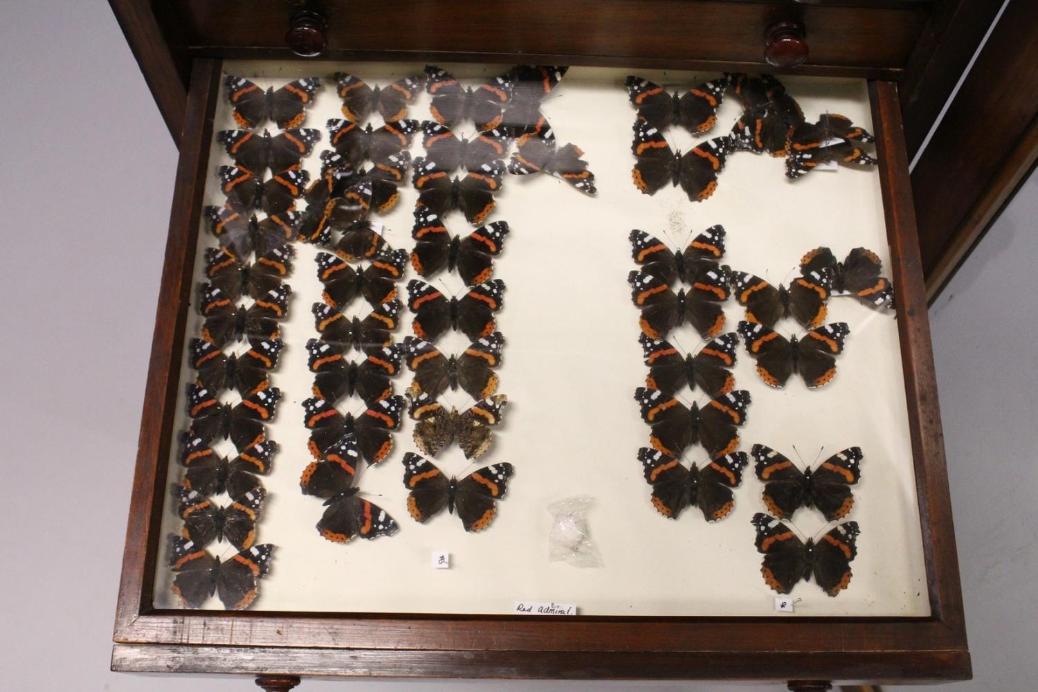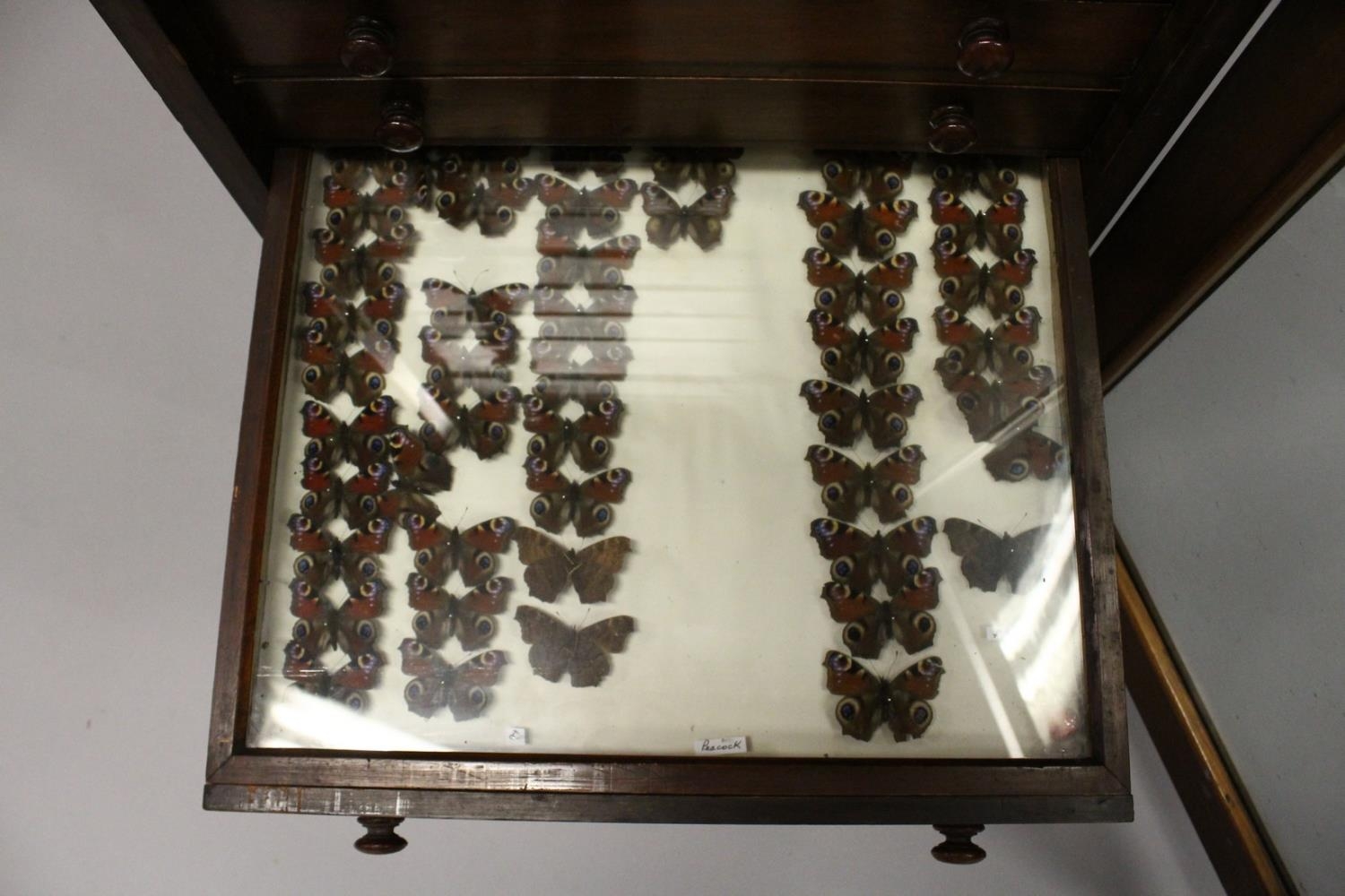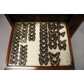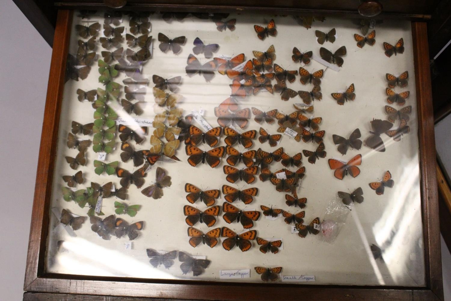 A VERY GOOD VICTORIAN MAHOGANY COLLECTORS CABINET, with glass front door enclosing 14 glass top drawers with wooden handles, containing a collection of Victorian butterflies.