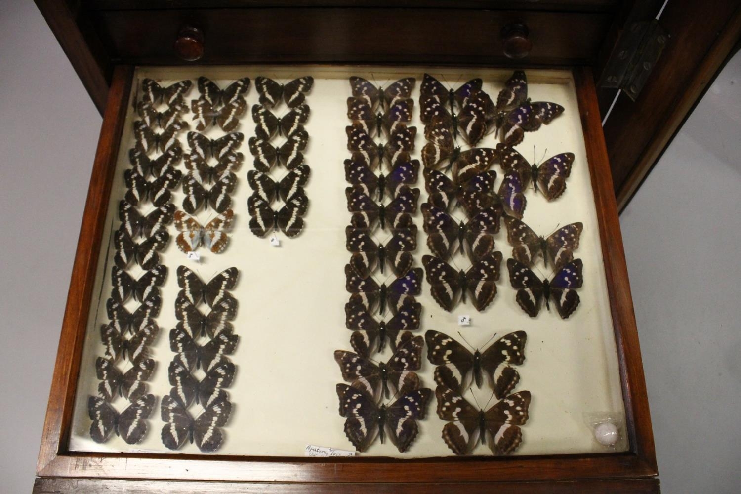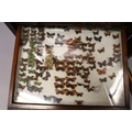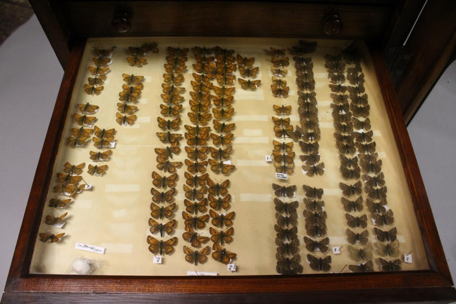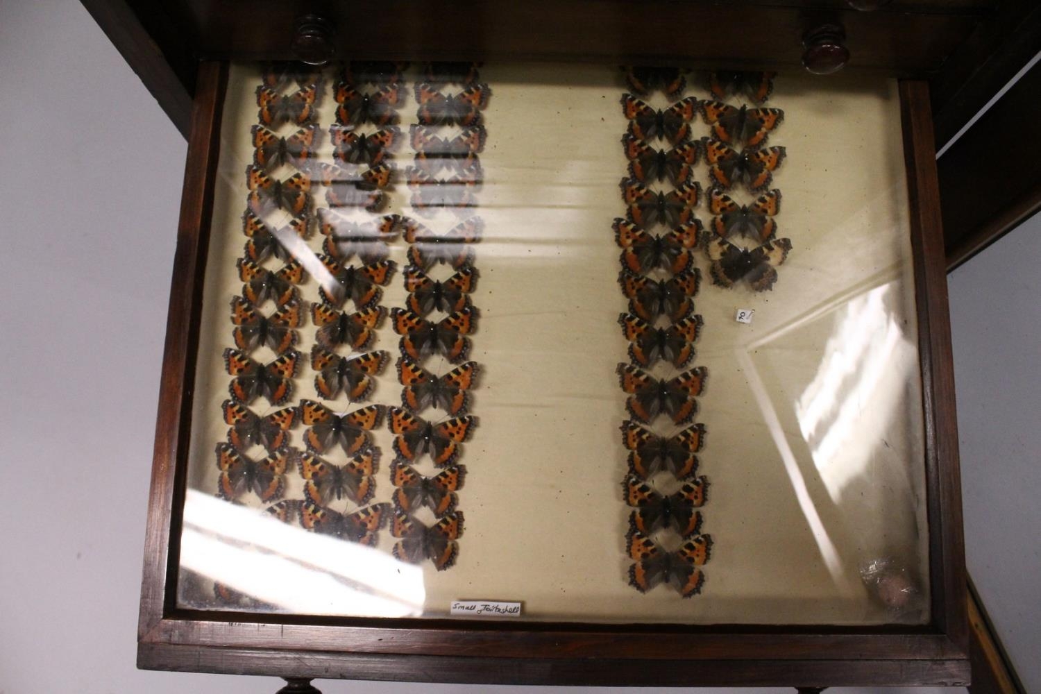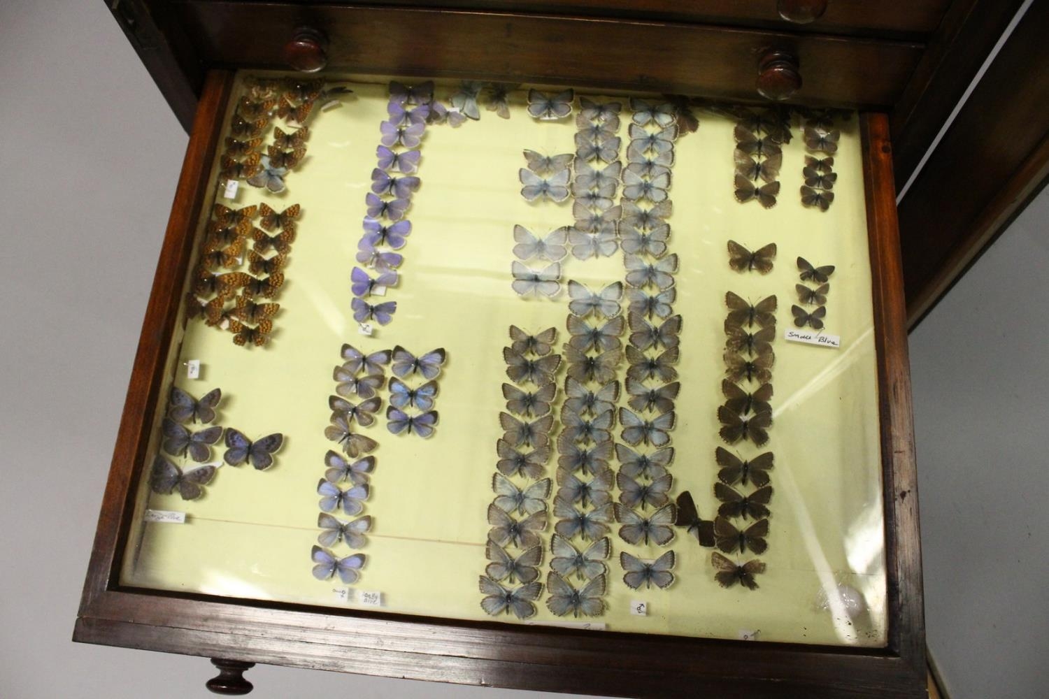 A VERY GOOD VICTORIAN MAHOGANY COLLECTORS CABINET, with glass front door enclosing 14 glass top drawers with wooden handles, containing a collection of Victorian butterflies.