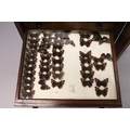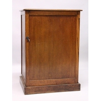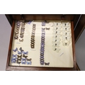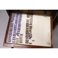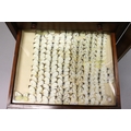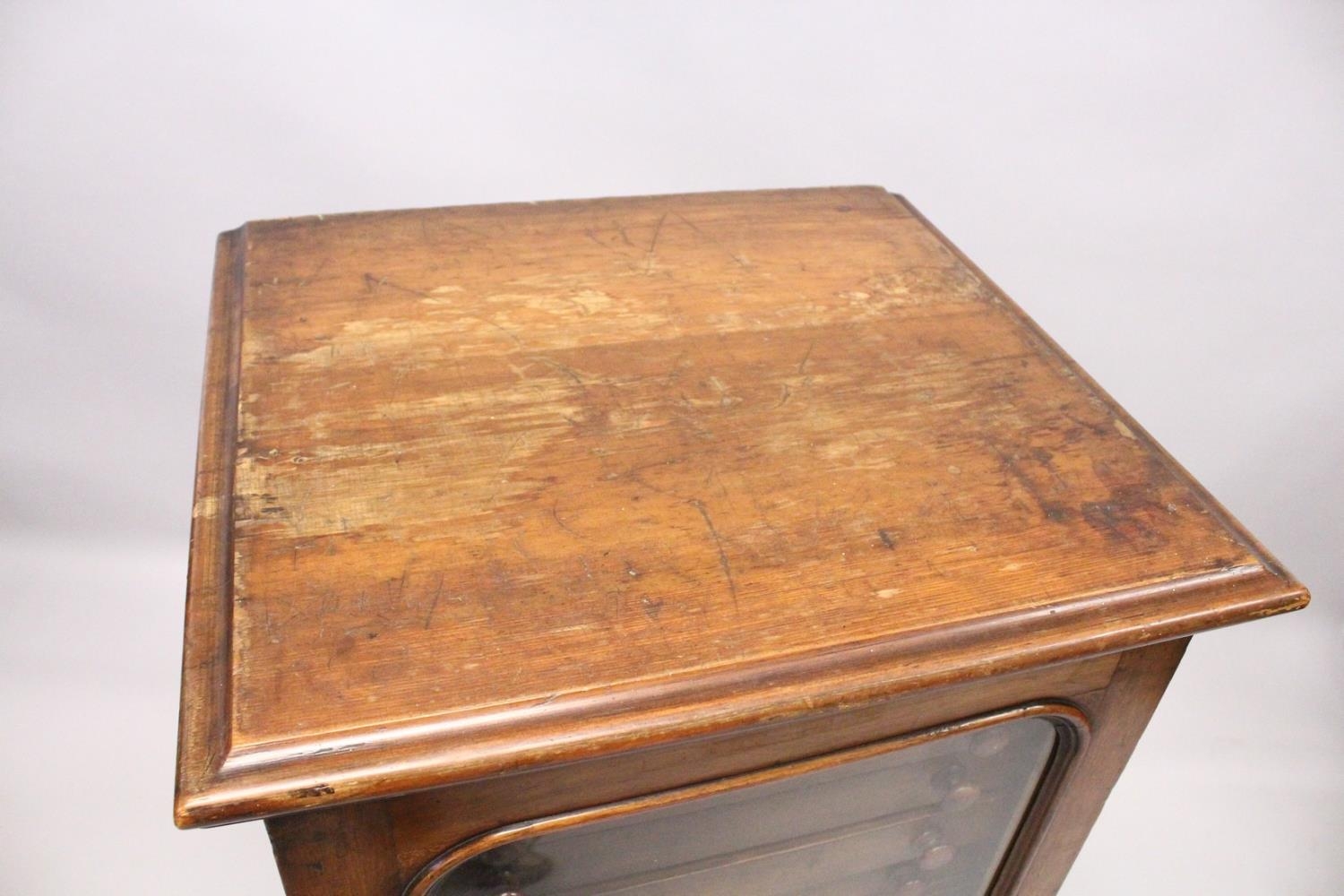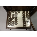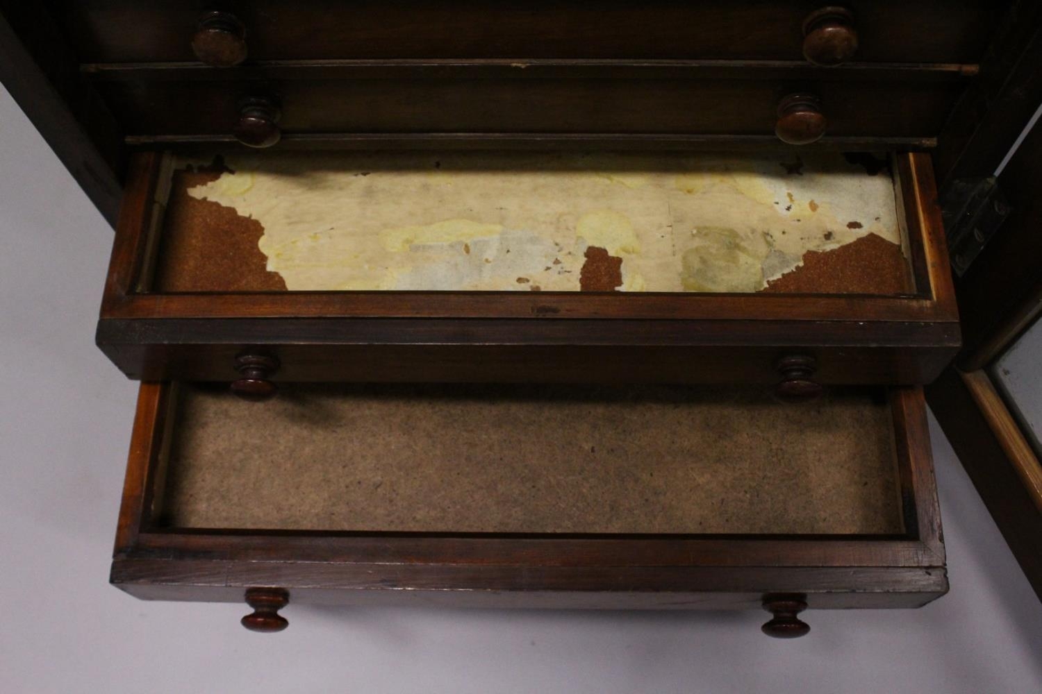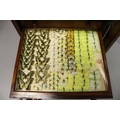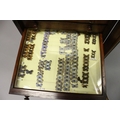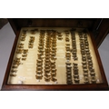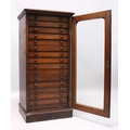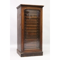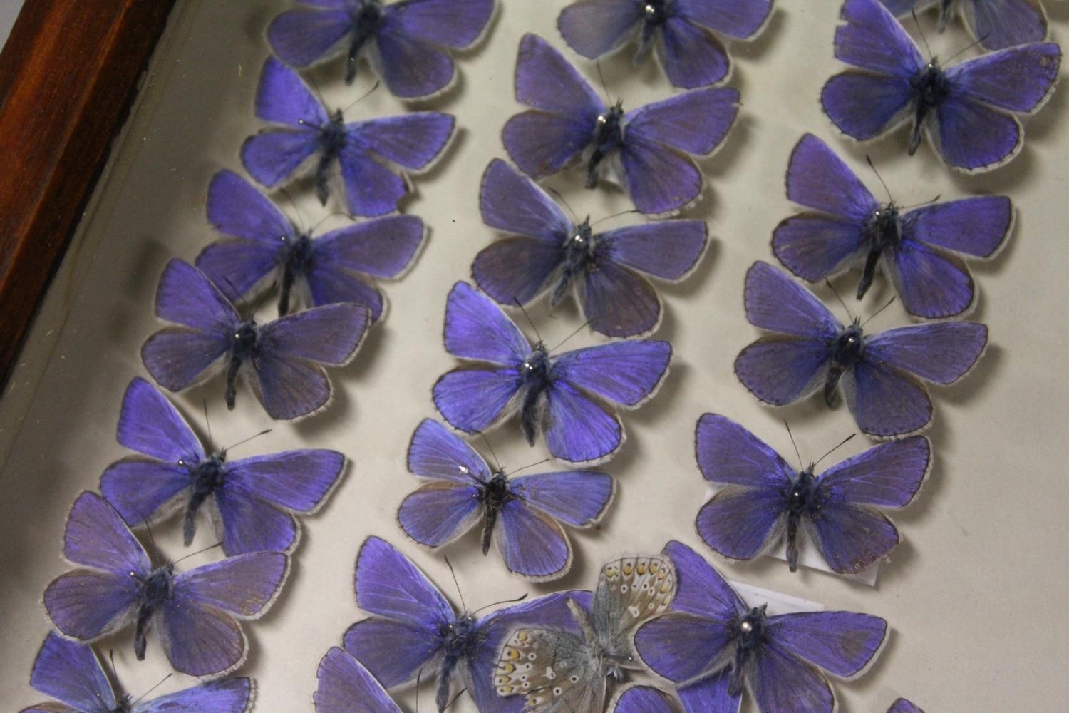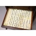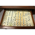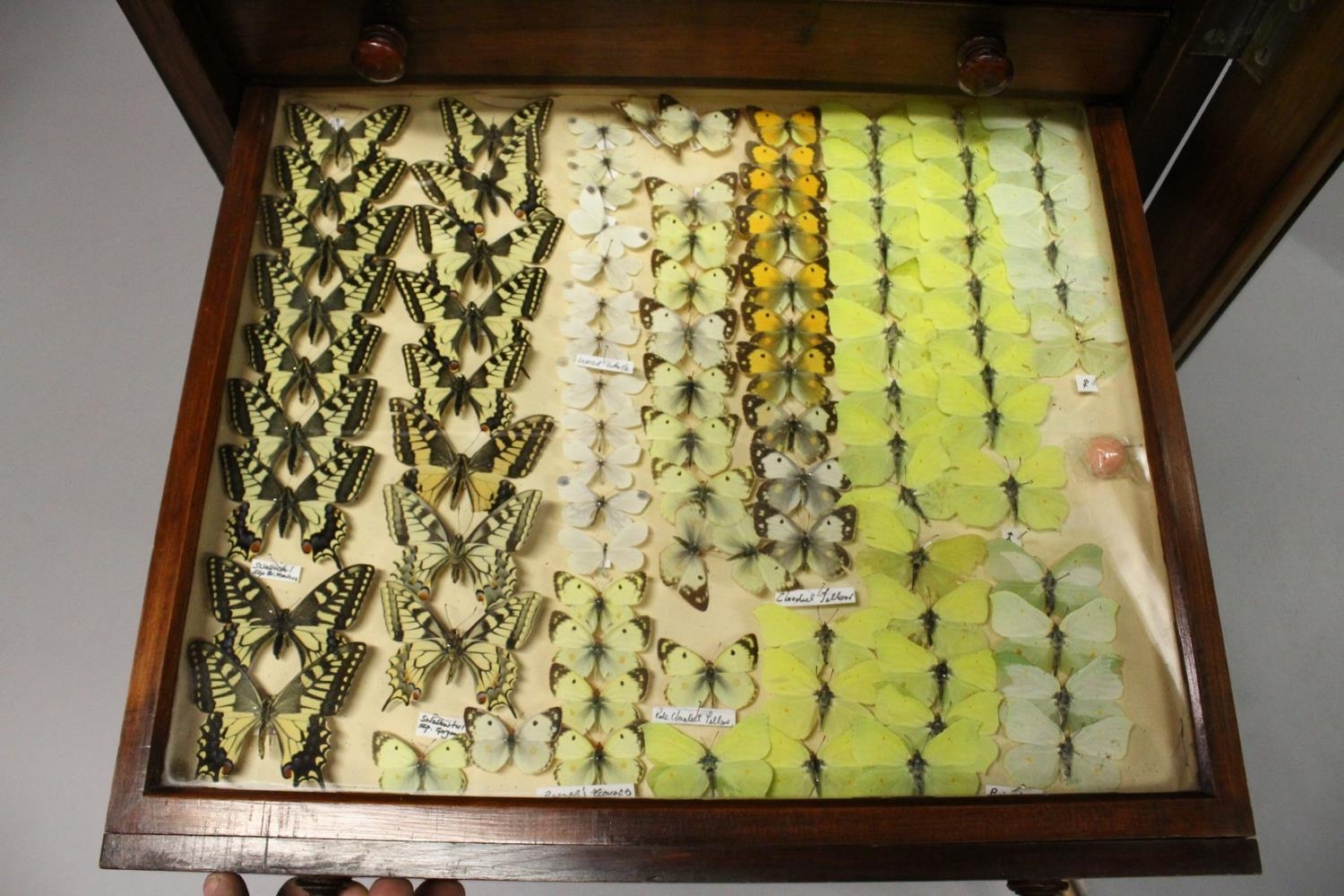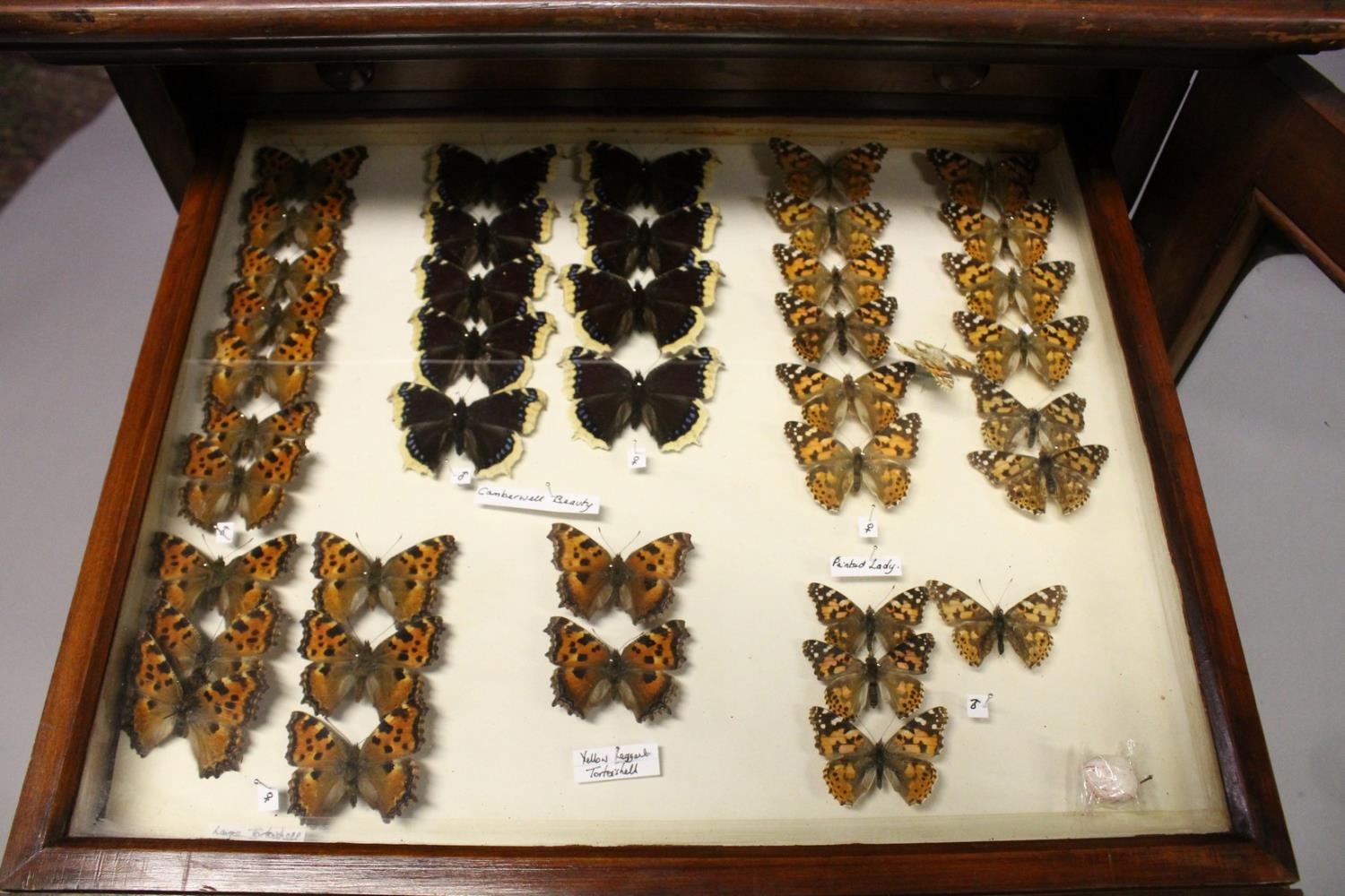 A VERY GOOD VICTORIAN MAHOGANY COLLECTORS CABINET, with glass front door enclosing 14 glass top drawers with wooden handles, containing a collection of Victorian butterflies.
