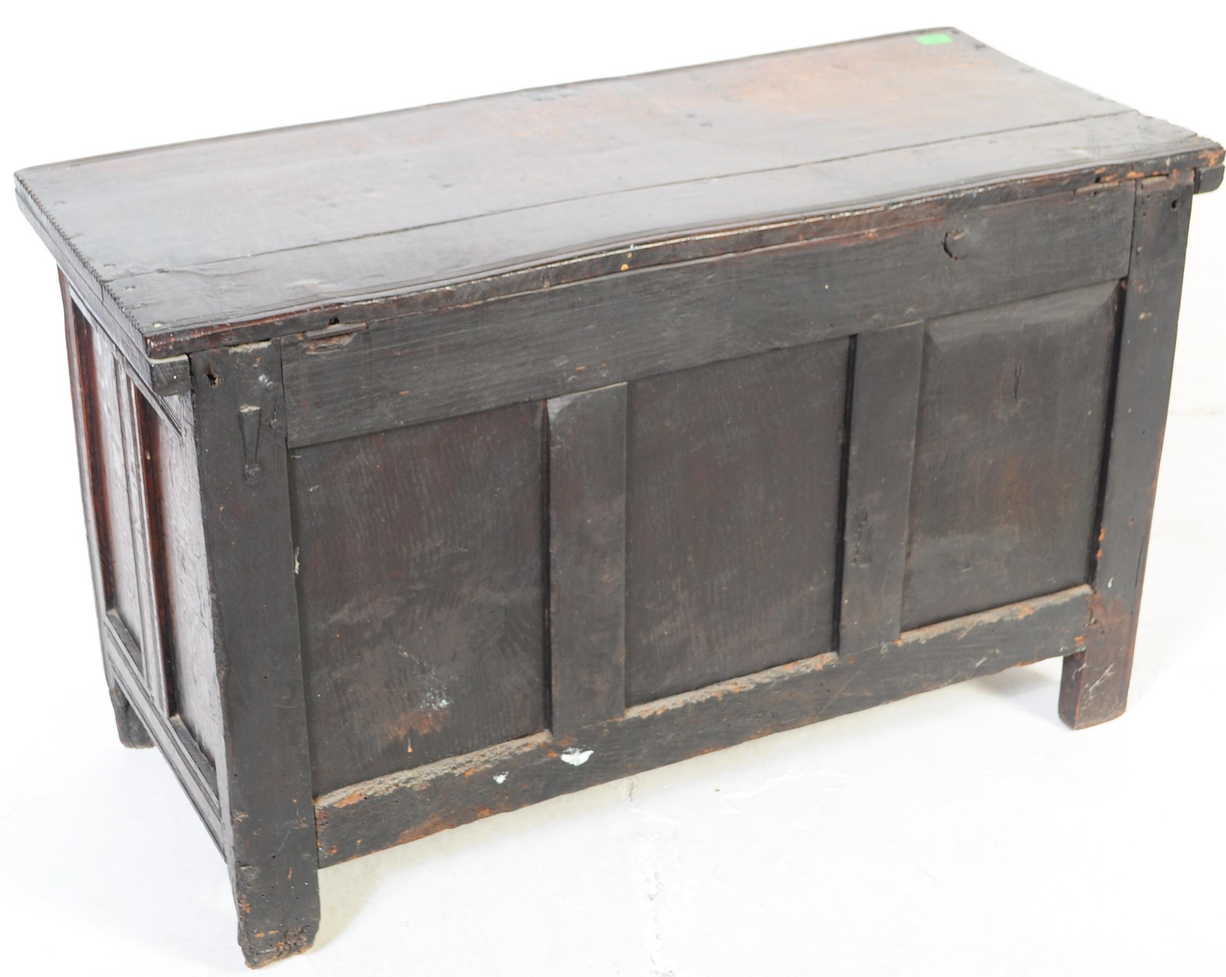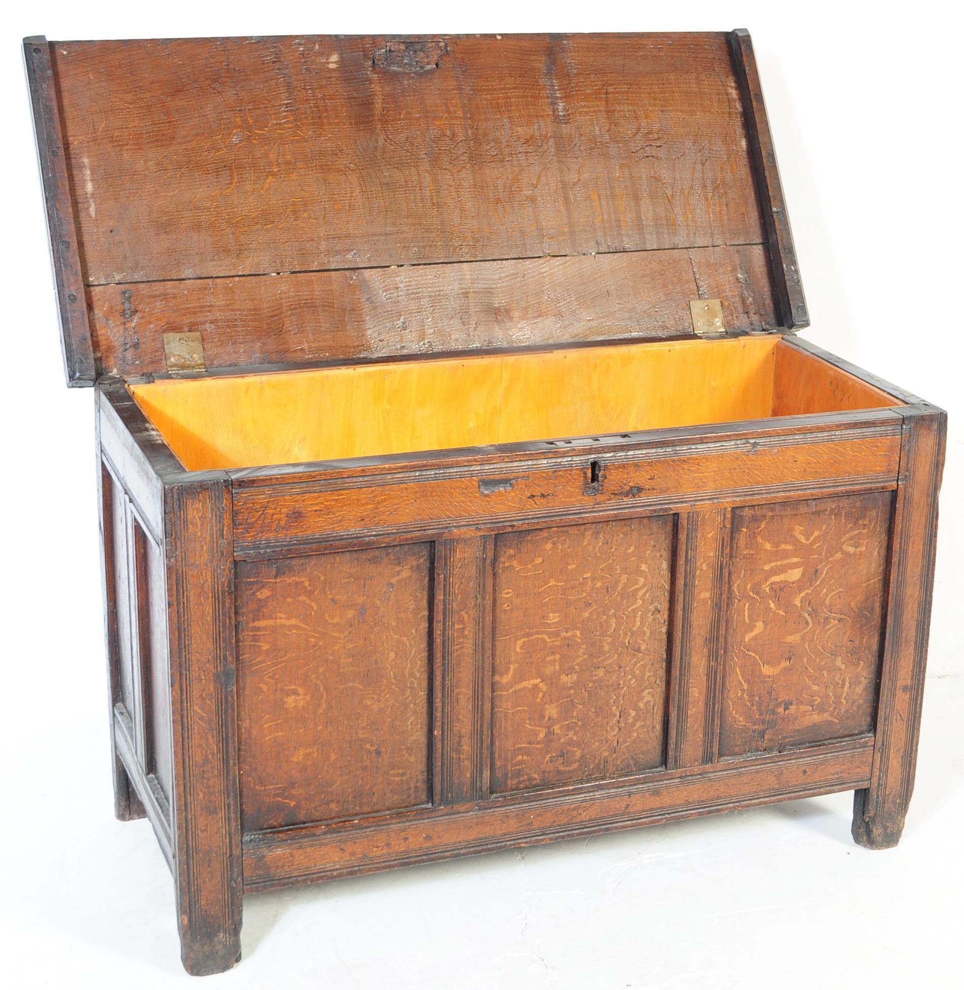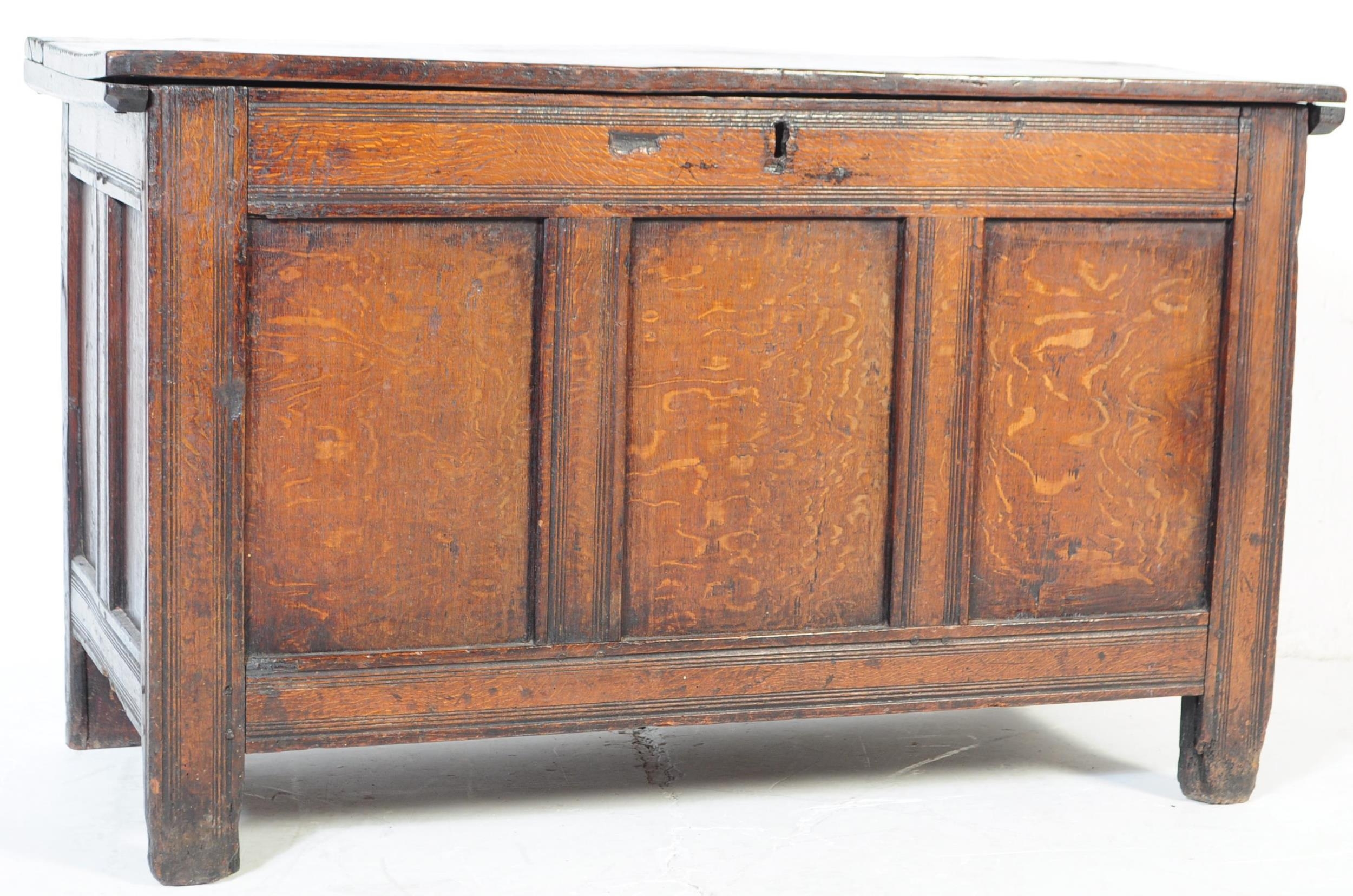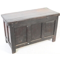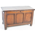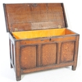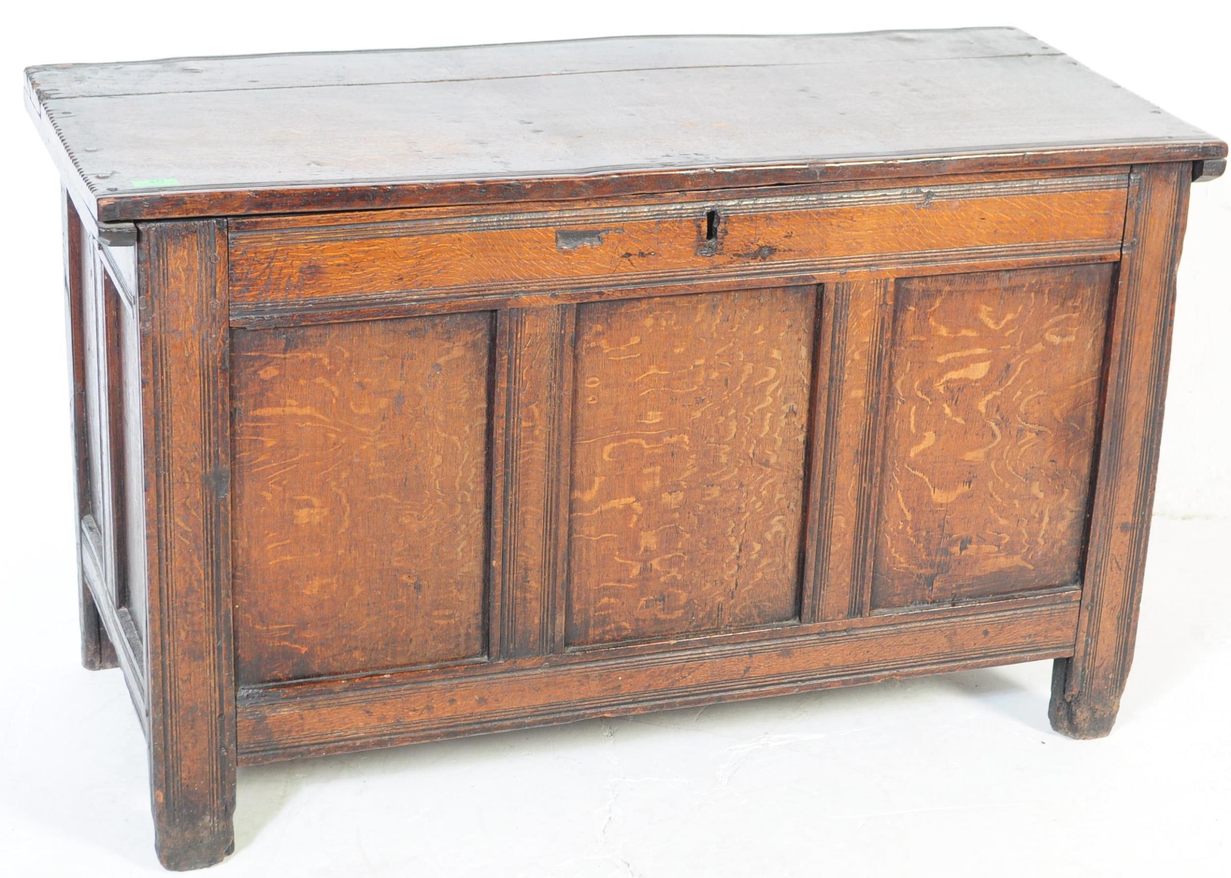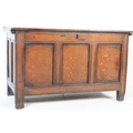 A 17th century English country oak coffer chest. Raised on stile legs with recessed fielded panels to the rectangular body. Hinged top above, lock plate to centre front. Measures approx. 68cm x 111cm x 49cm.