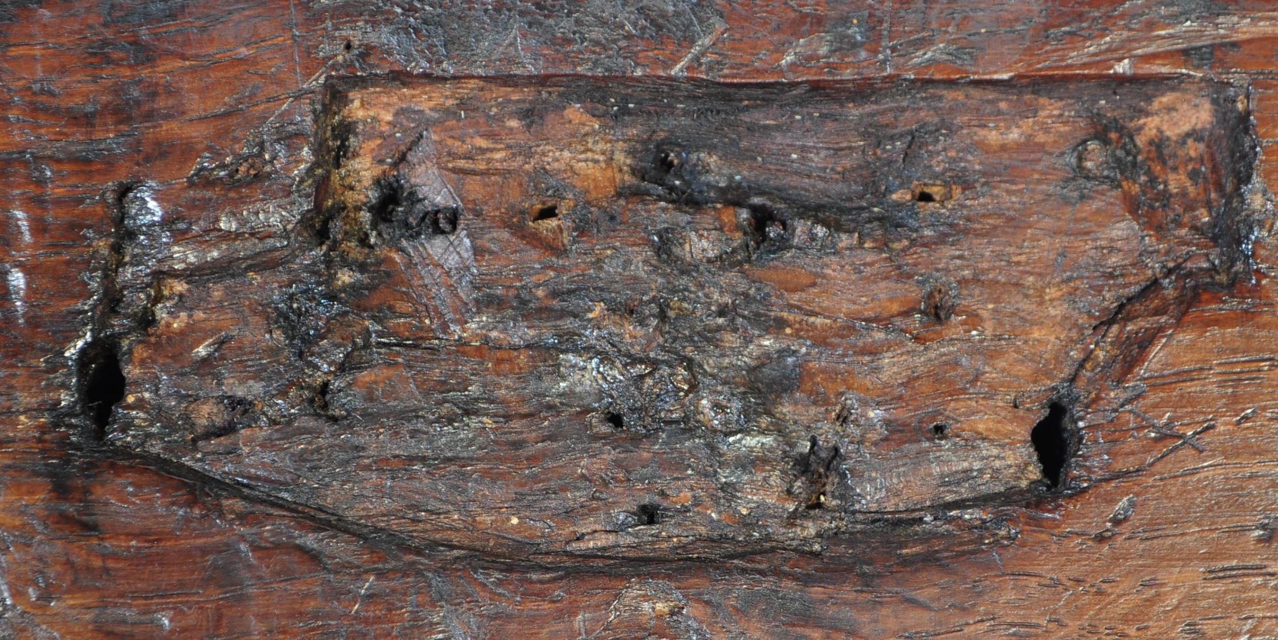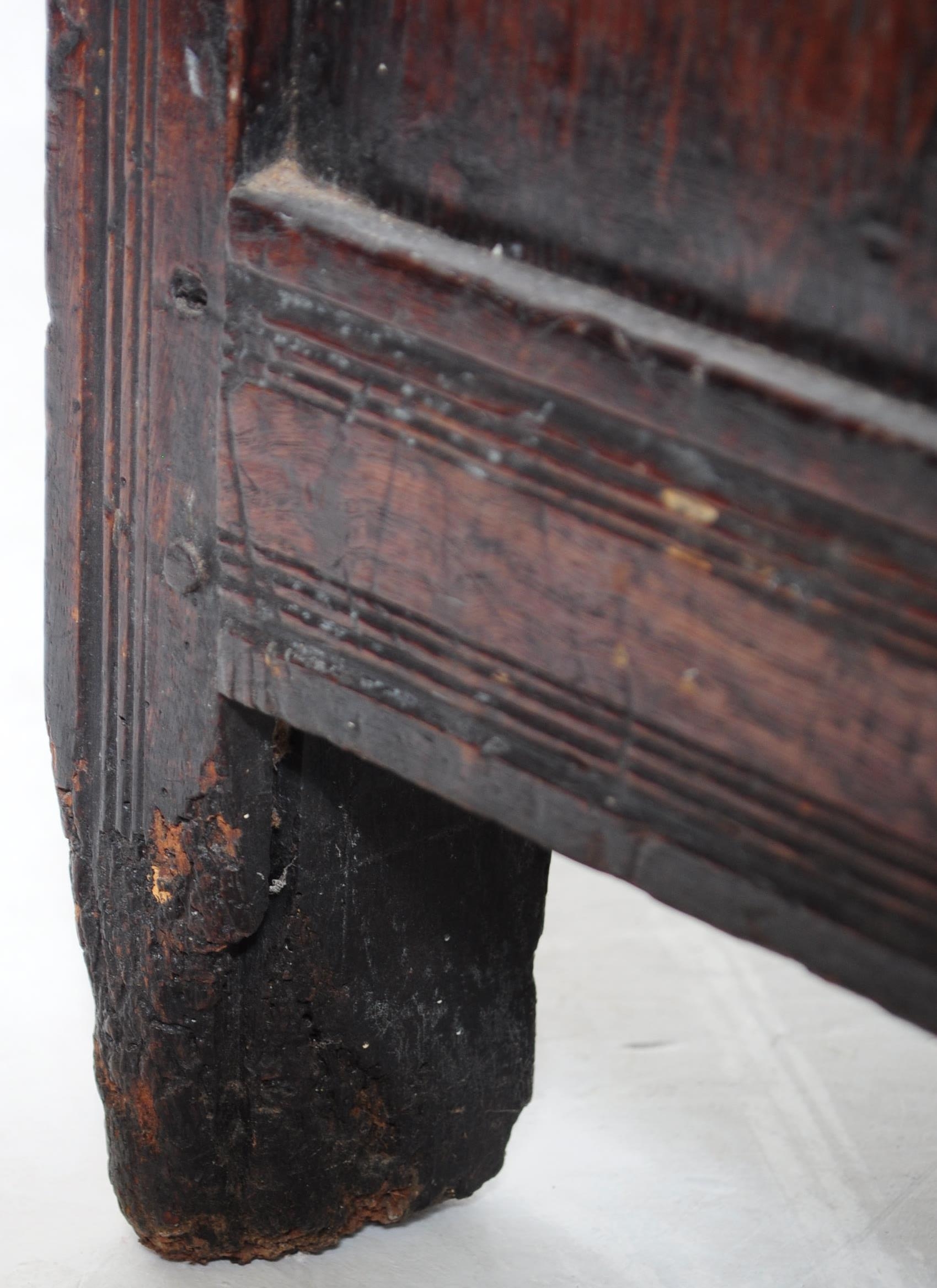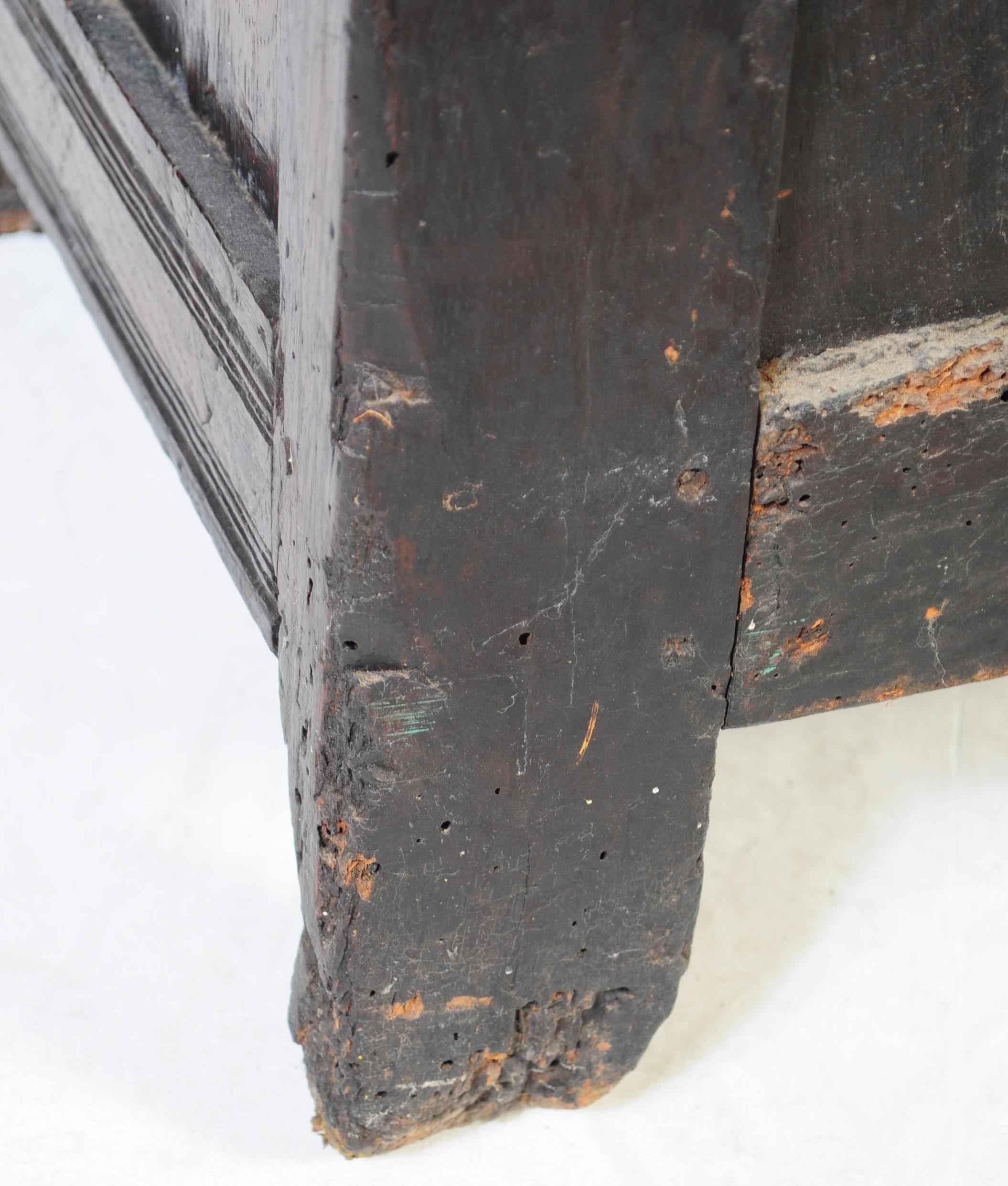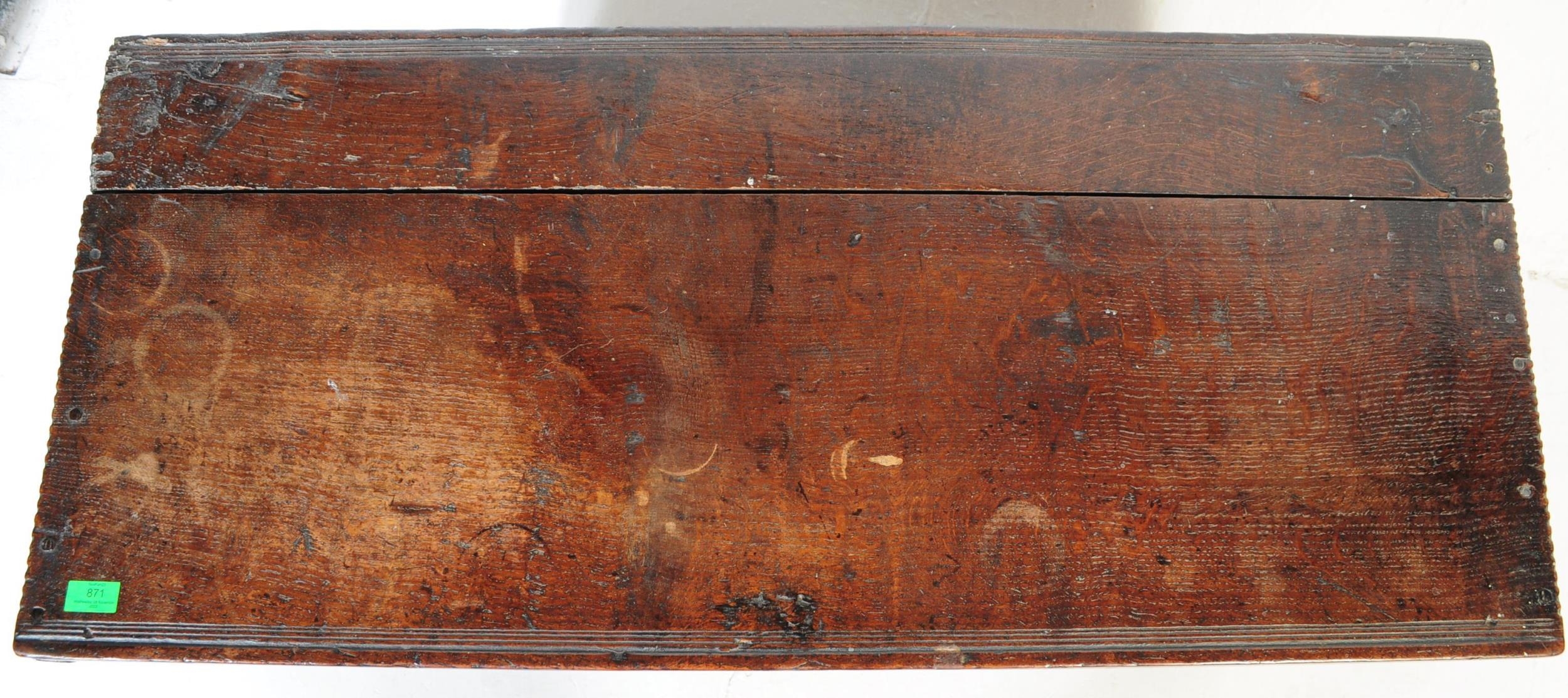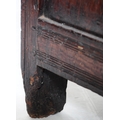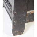 A 17th century English country oak coffer chest. Raised on stile legs with recessed fielded panels to the rectangular body. Hinged top above, lock plate to centre front. Measures approx. 68cm x 111cm x 49cm.