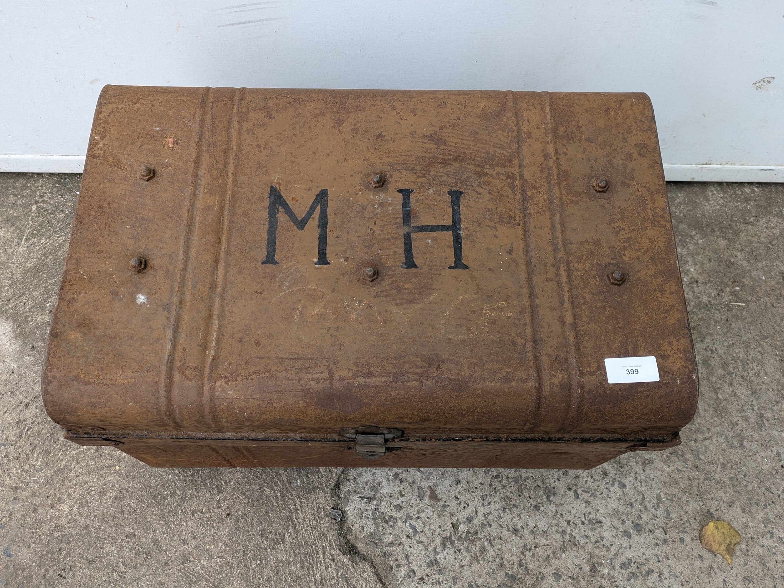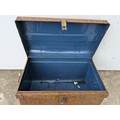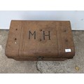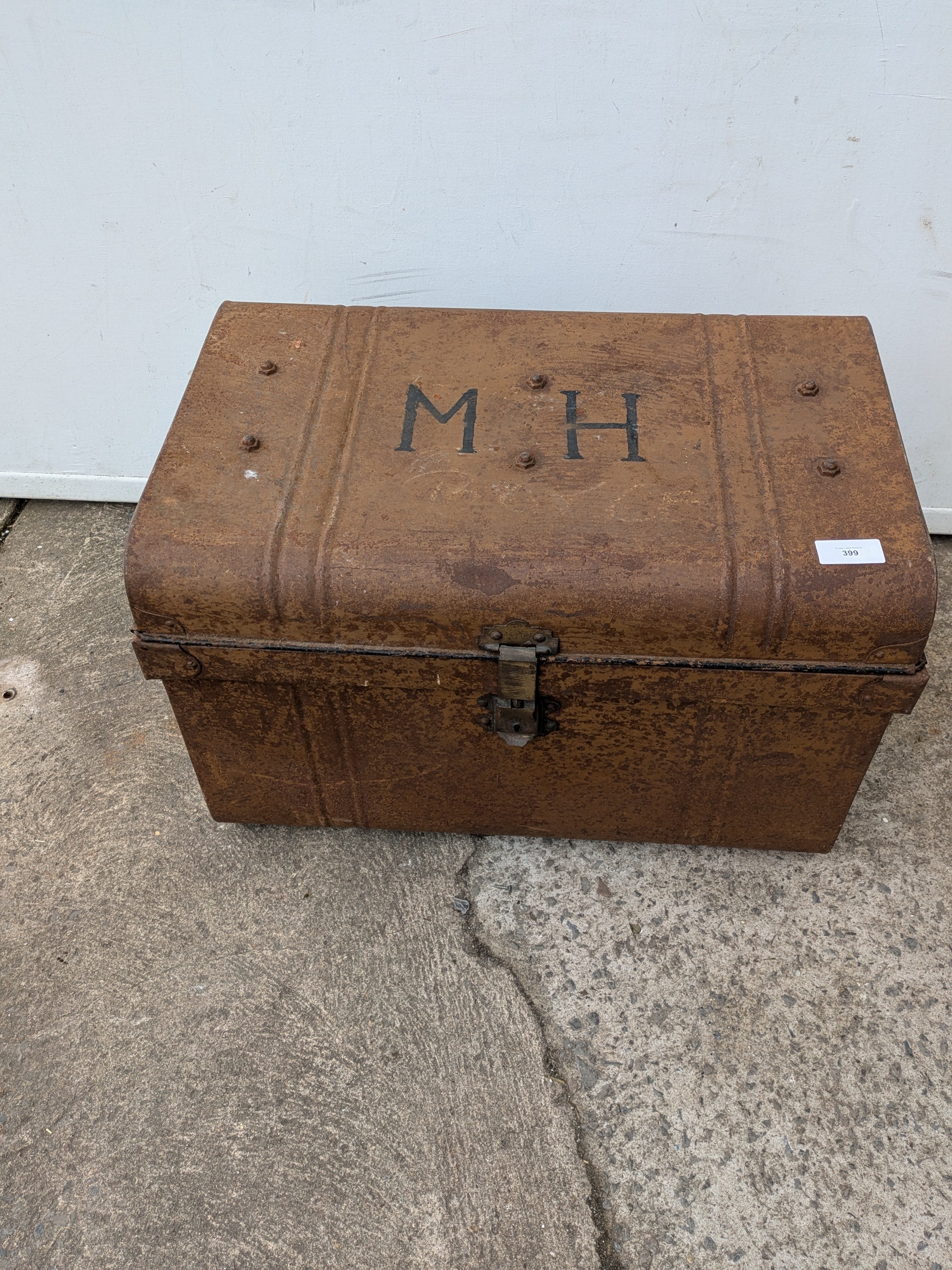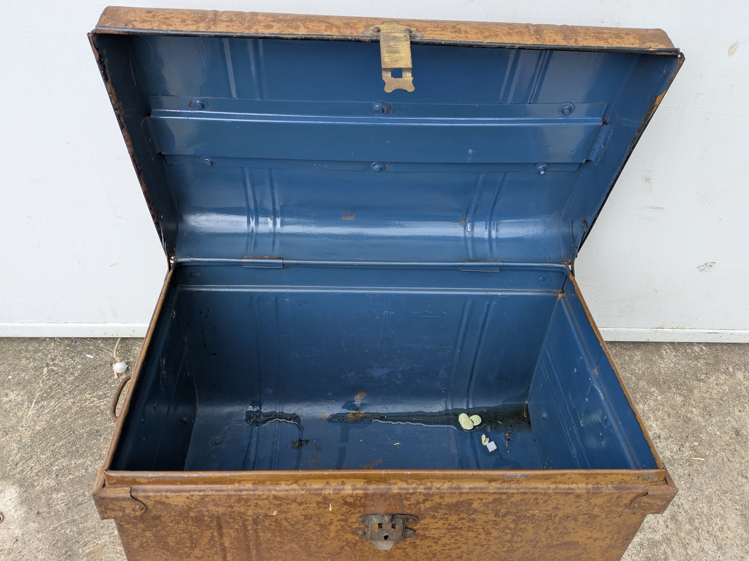 A vintage metal storage trunk
