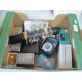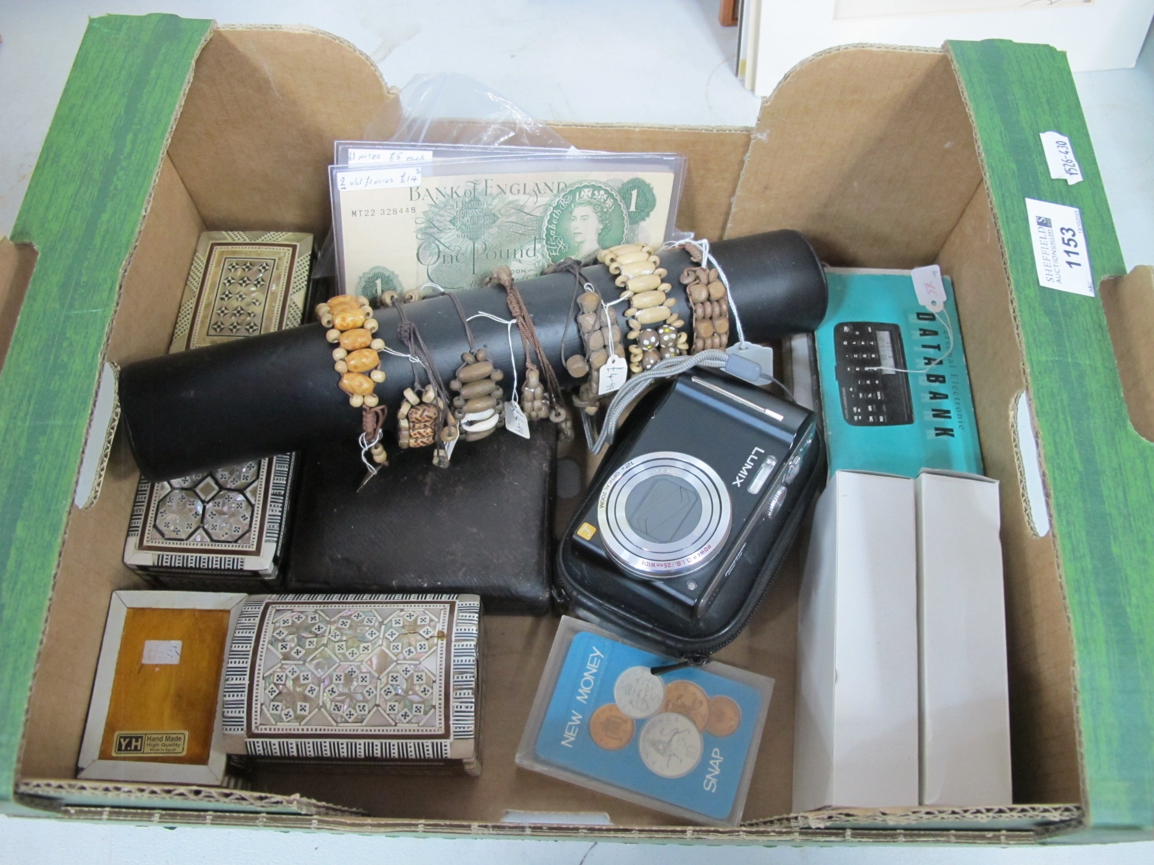 Four Egyptian made mother of pearl inlaid mosaic trinket boxes together with a LUMIX Panasonic DMC-TZ8 digital camera, an Austrian nail set in fitted box and seven English one pound notes. 1 Box.