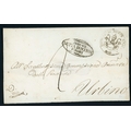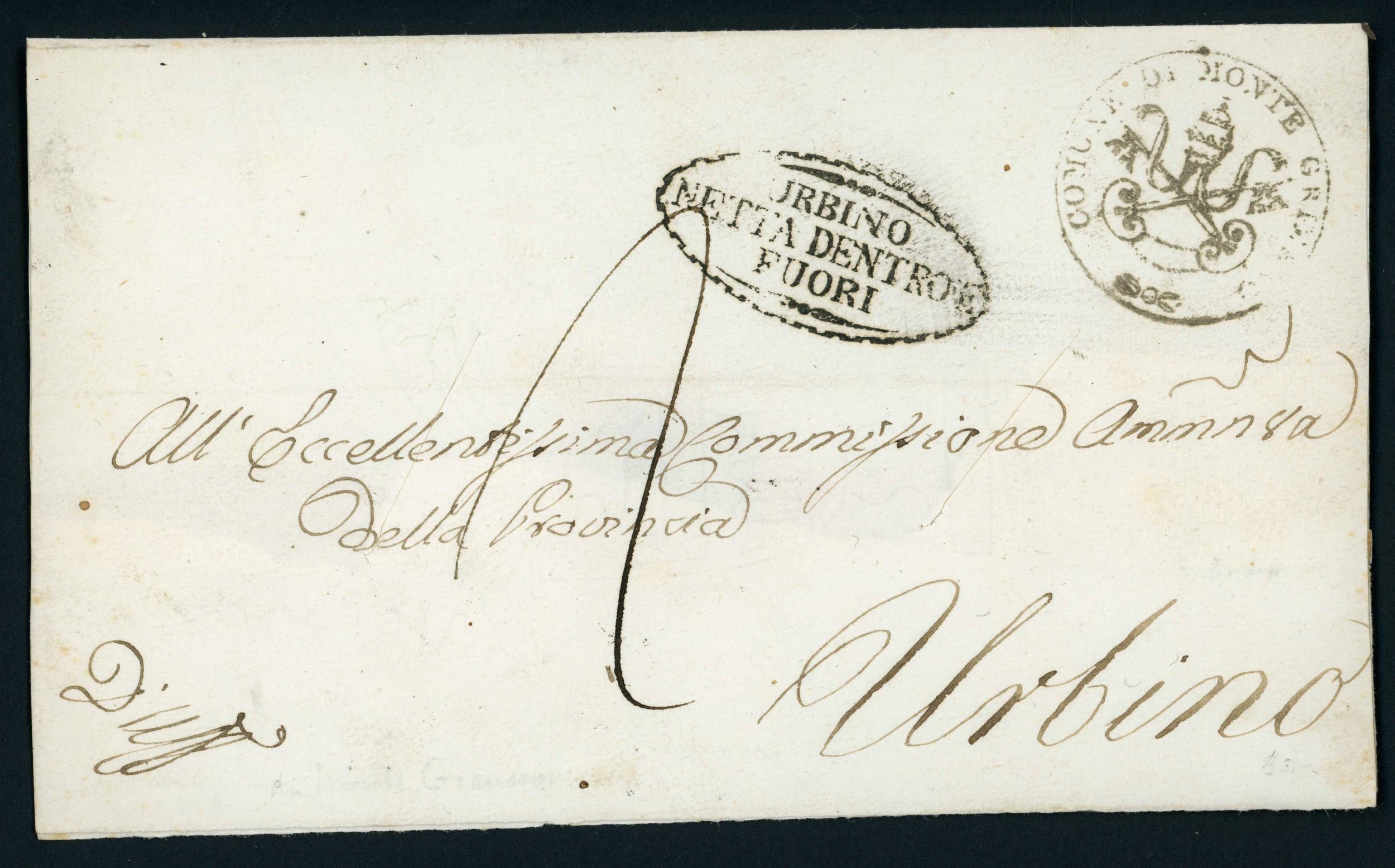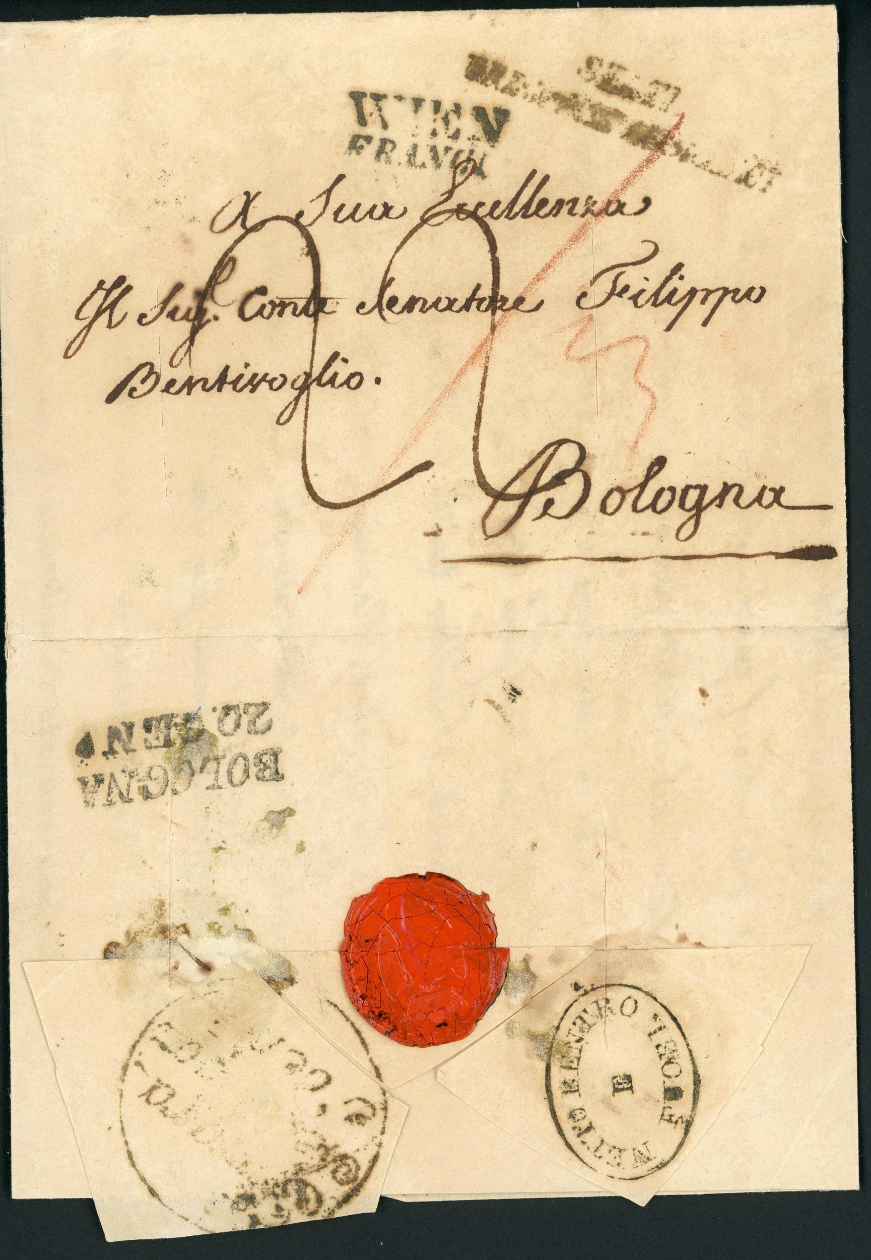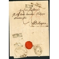 ITALY - UDINE & URBINO DISINFECTION: Jan. 1832 EL to Bologna with "WIEN/FRANCO" & "STATI/EREDITARI AUSTRIACI" hs's on front, opened for disinfection en route at Udine resealed with "NETTO DENTRO/E FUORI" hs applied, again in Romagna where circular "Ferrara Netta Fuori e dentro" hs applied, finally slit upon arrival in Bologna; plus 1855 local E to Urbino franked Papal States 2b with oval "URBINO/NETTA DENTRO E/FUORI" hs on front. [Ex Dennis Vandervelde] (2 covers) Cross Reference: DISINFECTED MAIL, ITALIAN STATES