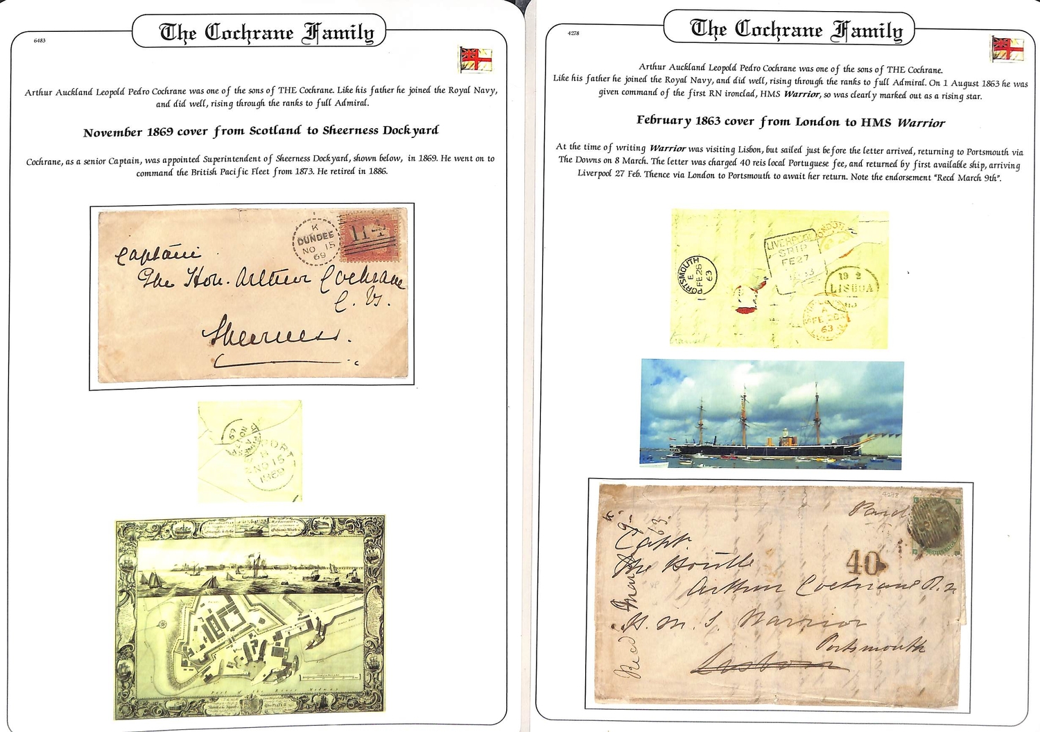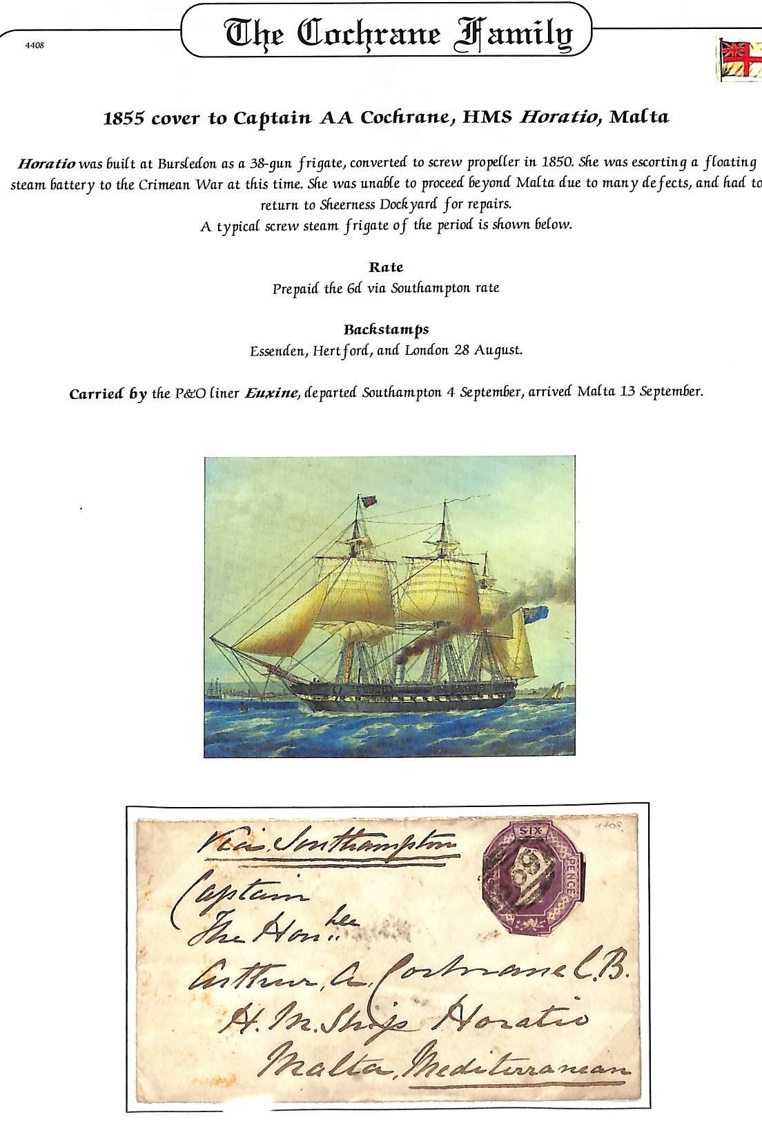 1855-69 Covers to Capt. The Hon. Arthur Cochrane comprising 1855 cover franked embossed 6d (cut to shape) from Essenden to H.M.S "Warrior" at Lisbon redirected back to Portsmouth with Liverpool and London Ship Letter backstamps, and a cover to Sheerness, also 1845 Admiralty Certificate listing Cochrane s 1839-44 naval service on H.M.S "Benbow", "St. Vincent" and "Salamander". Like his famous father Cochrane went on to become an Admiral, he commanded the first ironclad naval ship H.M.S "Warrior" and was later C-in-C Pacific Fleet. (4).