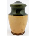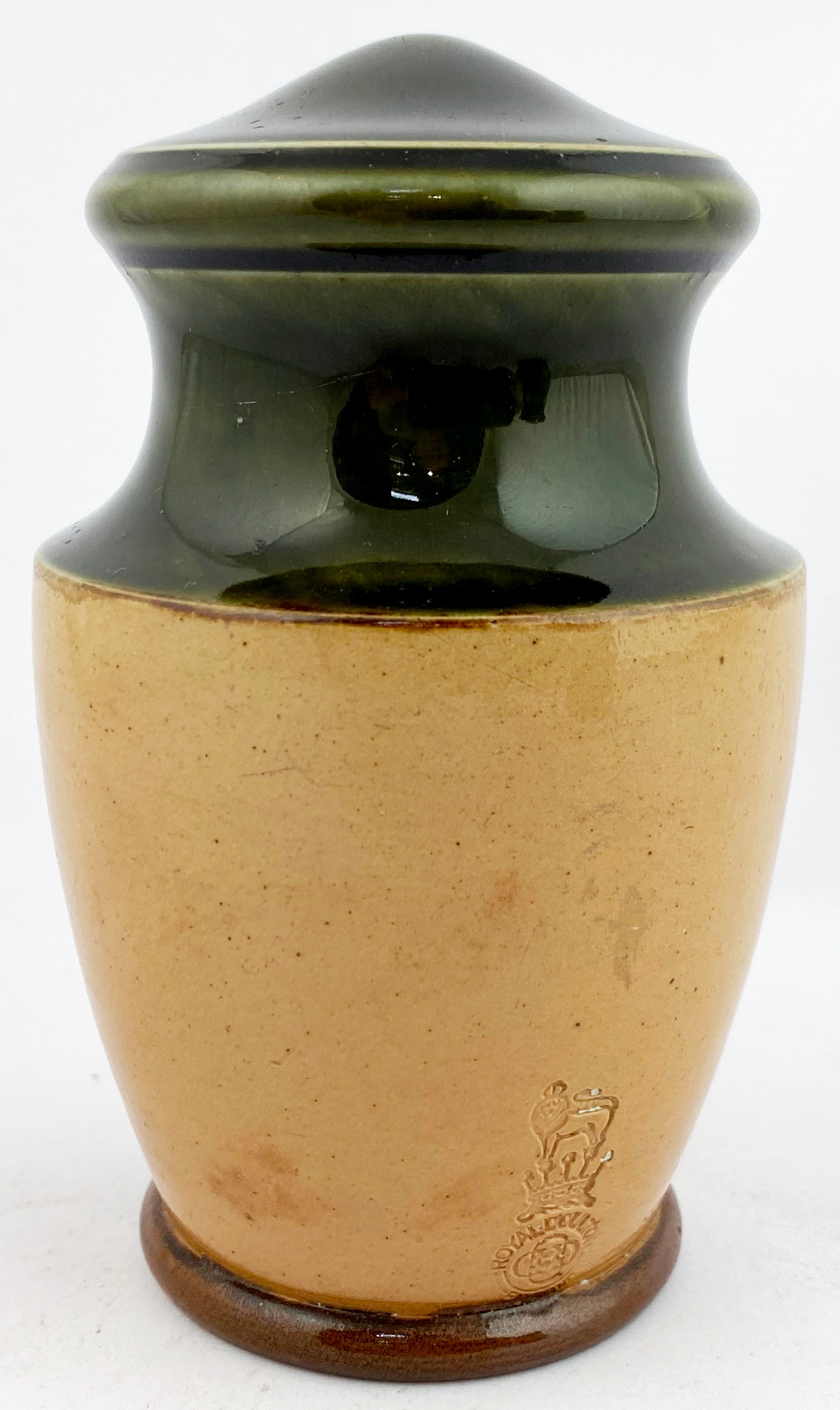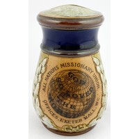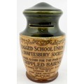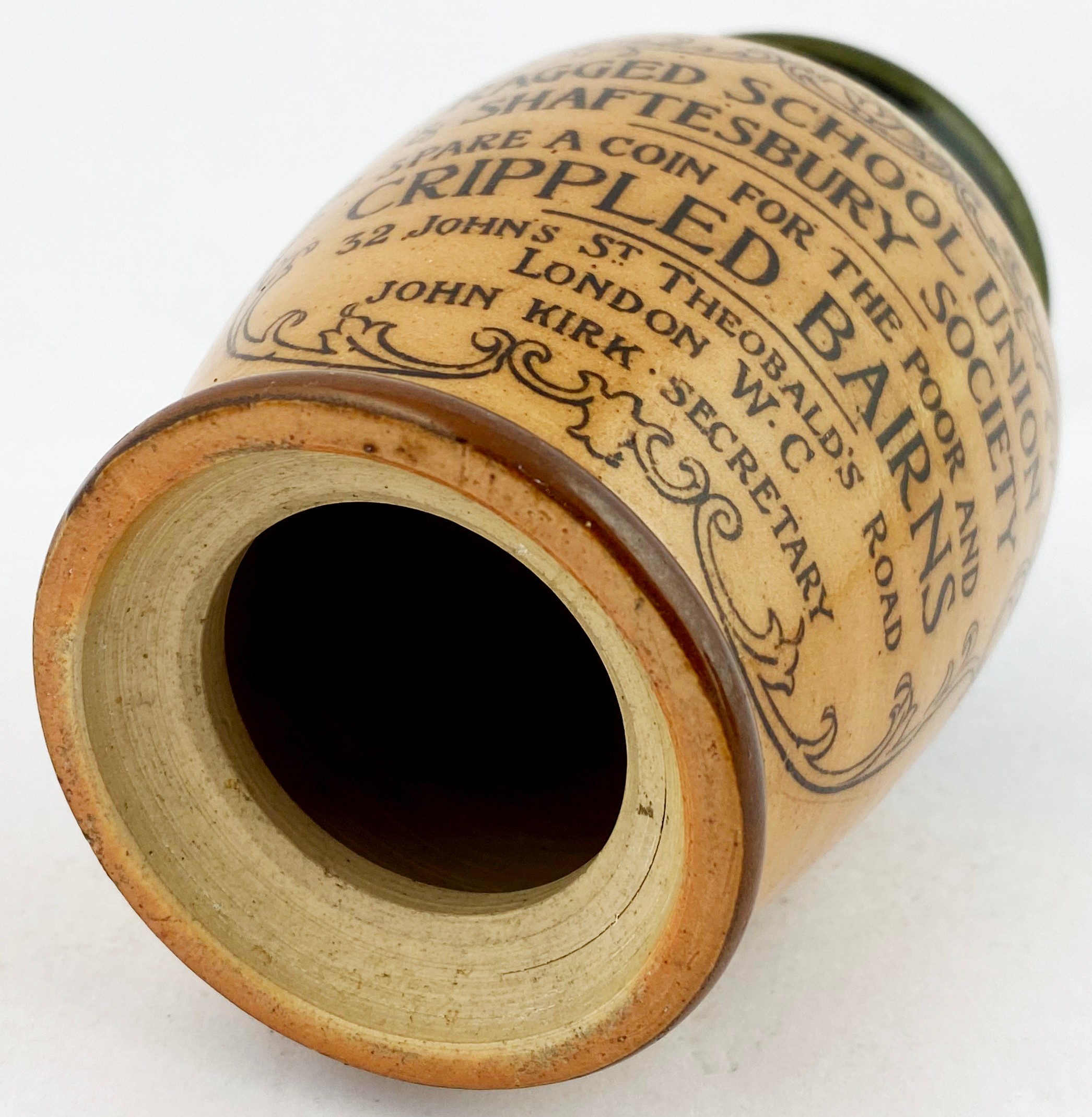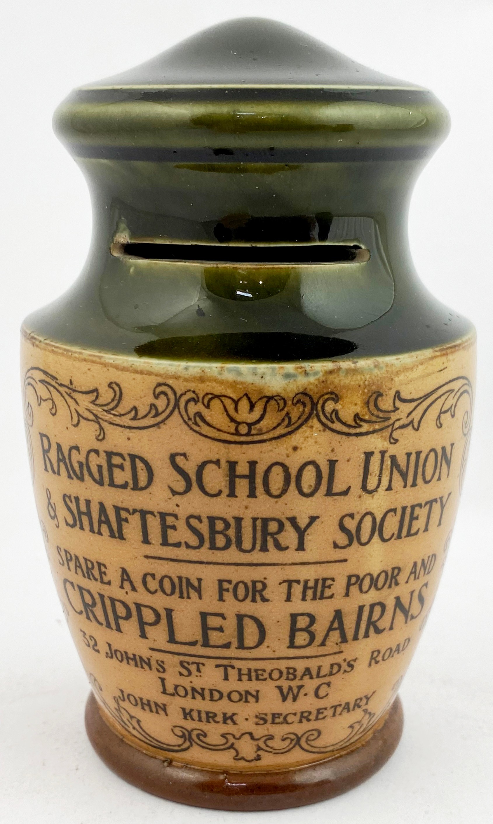 RAGGED SCHOOL UNION MONEY BOX. 4.2ins. Stoneware salt glaze money box with dark green top. Front transfer reads RAGGED SCHOOL UNION/ SHAFTESBURY SOCIETY/ SPARE A COIN FOR THE POOR AND/ CRIPPLED BAIRNS and three line address. Large base hole to take a sealing cork. Tiny edge of coin slot flake otherwise exc. Royal Doulton p.m. to rear.