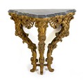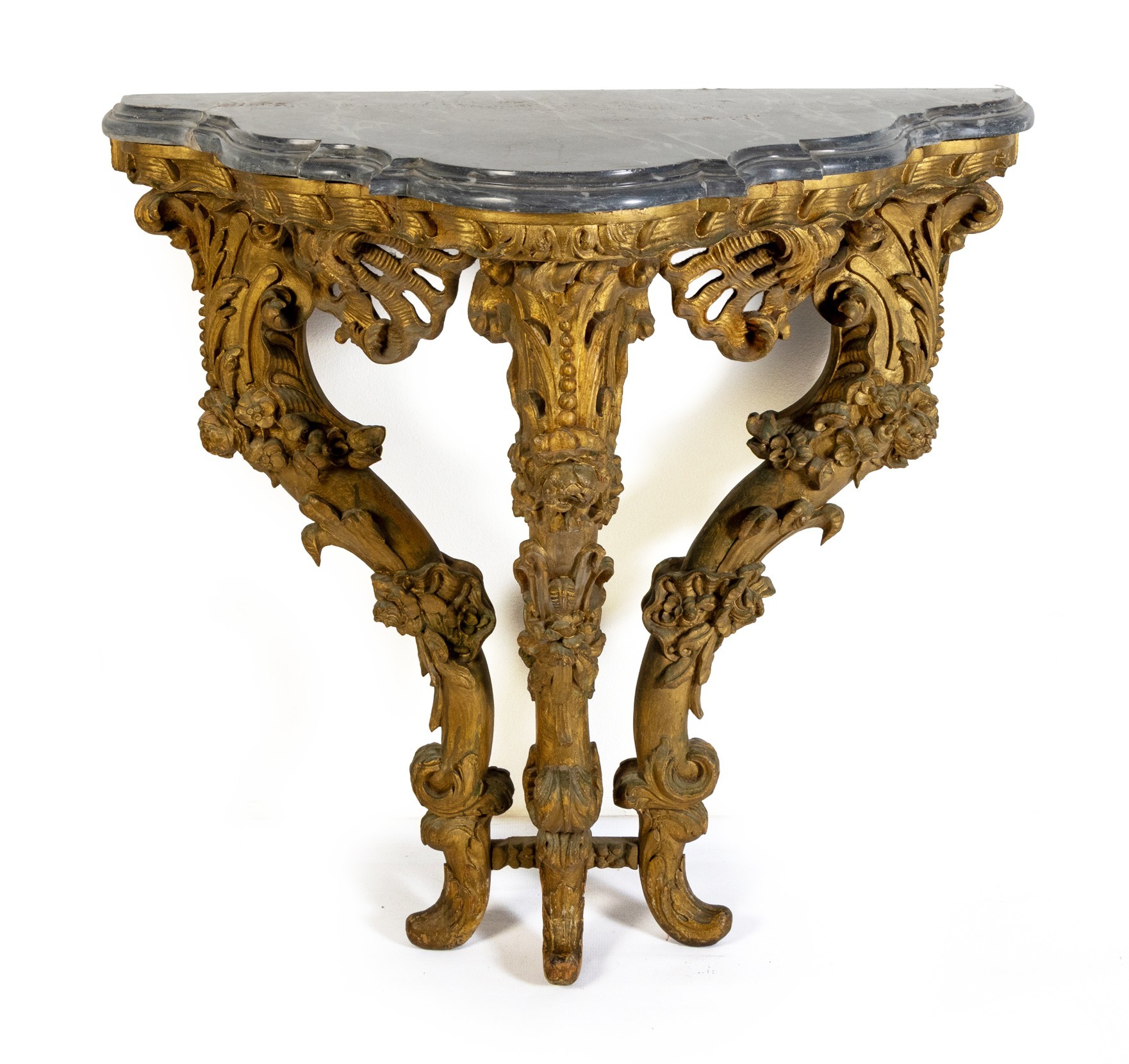 The serpentine demi-lune grey marble top above a pierced and foliate-carved apron, on foliate-carved cabriole legs