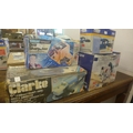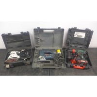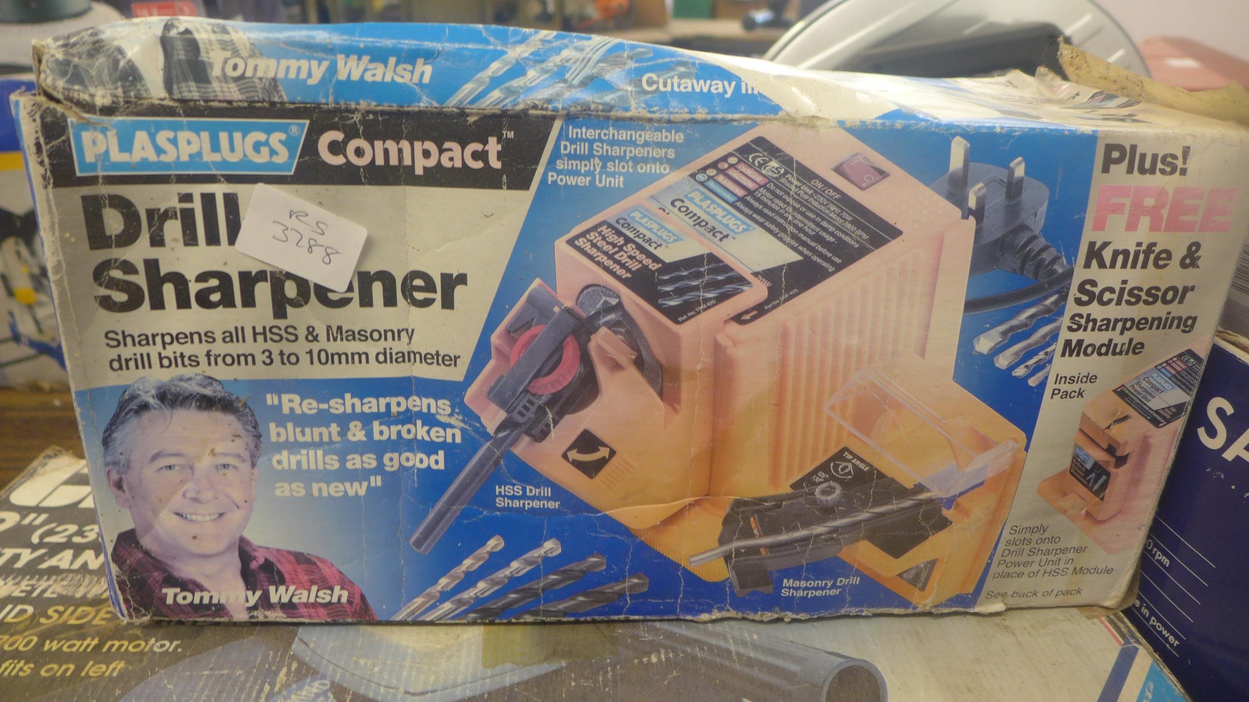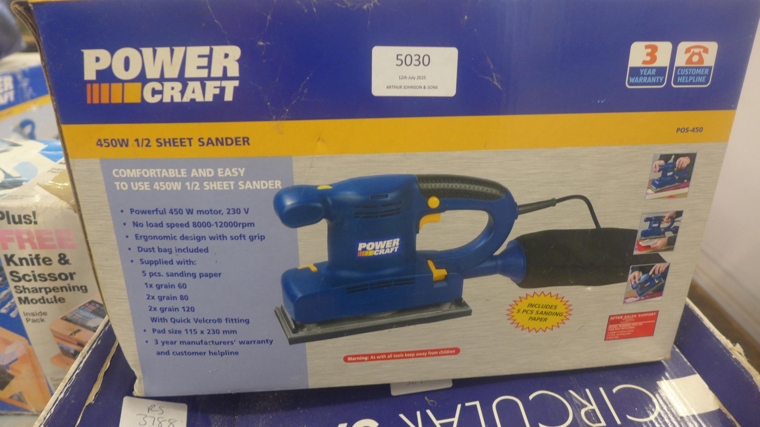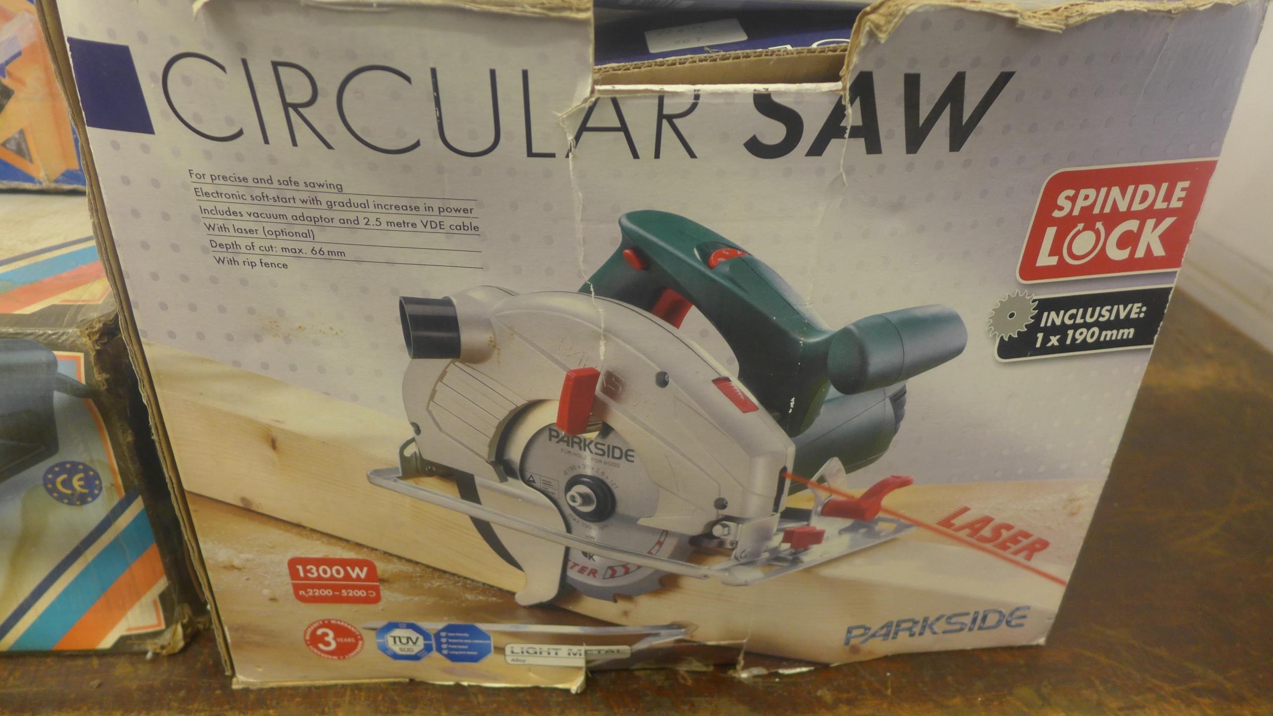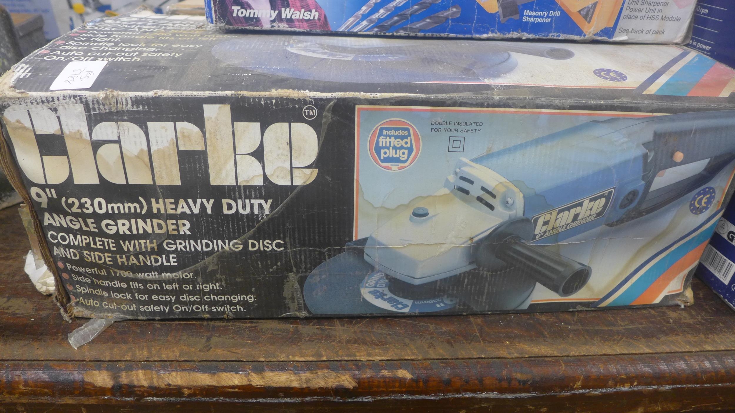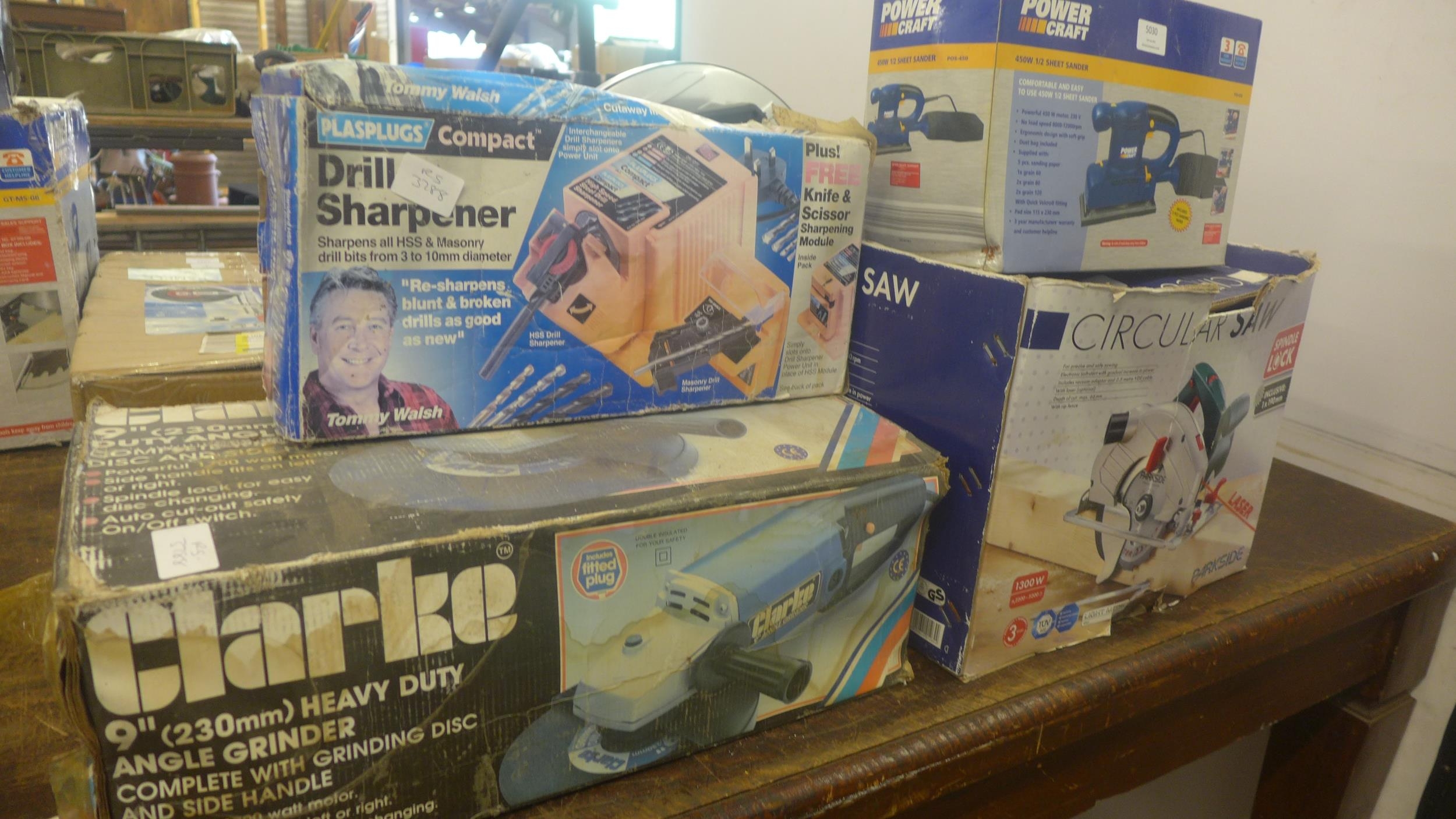 A boxed Parkside circular saw, a boxed Clarke 9" heavy duty angle grinder, a boxed Plasplugs compact drill sharpener and a boxed Powercraft 240V sheet sander