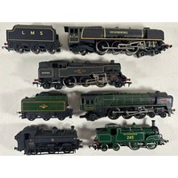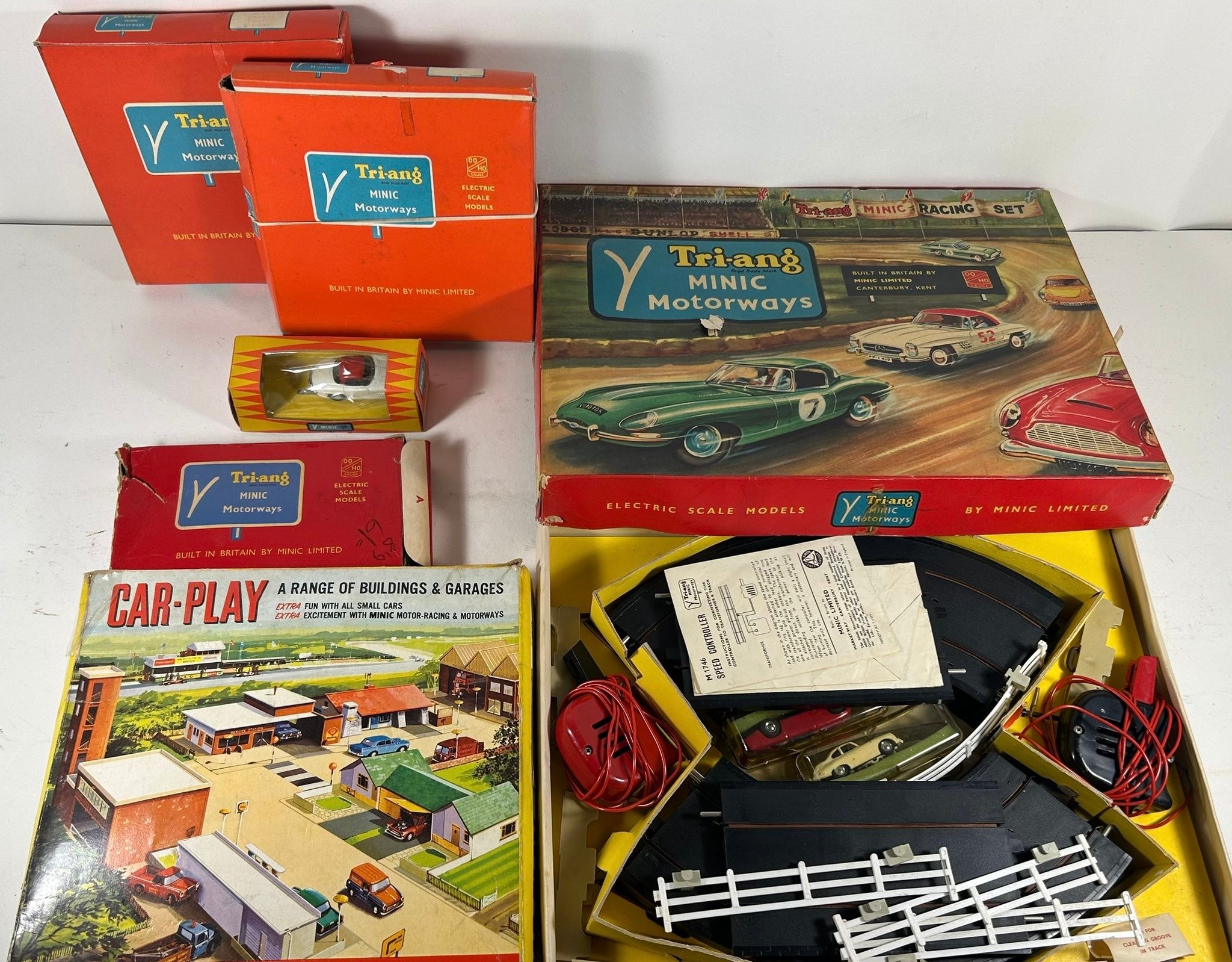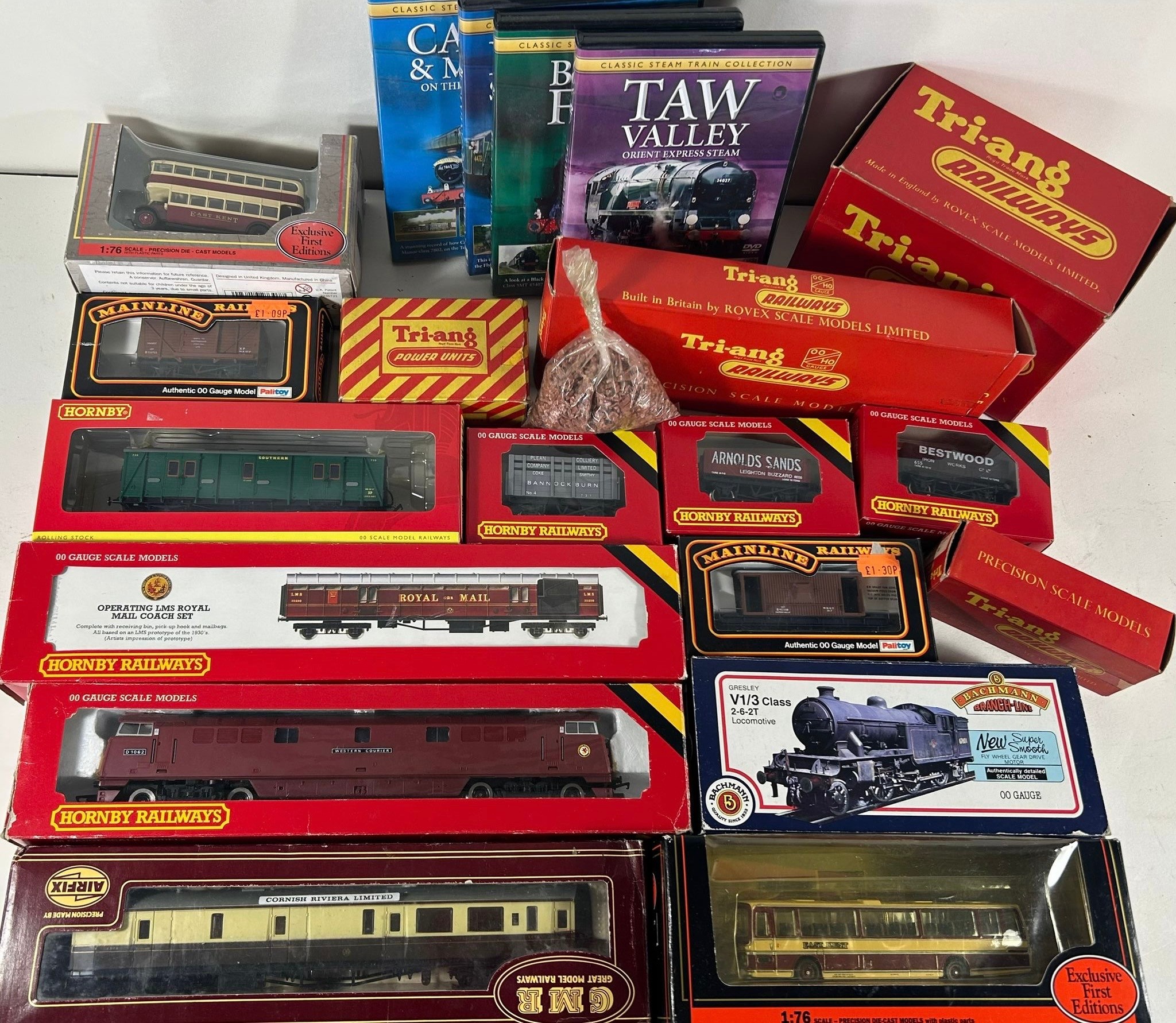 A quantity of OO railway by various makes. Hornby Western Class 52 Co-Co diesel hydraulic 'Western Courier' D1062. An Operating LMS Royal Mail Coach set. Plus an SR Maunsell Passenger Brake Van C. Also 3 wagons -Coke 'Bannockburn' and 2x 5 plank wagons- 'Arnolds Sands' and 'Bestwood'. A Bachmann Branchline BR Class V1/3 2-6-2 tank 67601 (broken motion). GMR GWR bogie brake coach. 2x Mainline freight wagons, etc. 4x Classic Steam Train Collection DVD's. Together with Tr-ang Minic Motorway items including set M.1525 comprising 2 cars-Aston Martin and Porsche, track and controllers. Plus another car-Mercedes 300SL and 2 boxes of track sections. Also a Car-Play set M.2003 Drive Thru Building and 2x EFE vehicles - Plaxton Coach and a Leyland TDI both East Kent. All boxed, some age wear/damage. Contents GC-VGC.