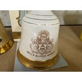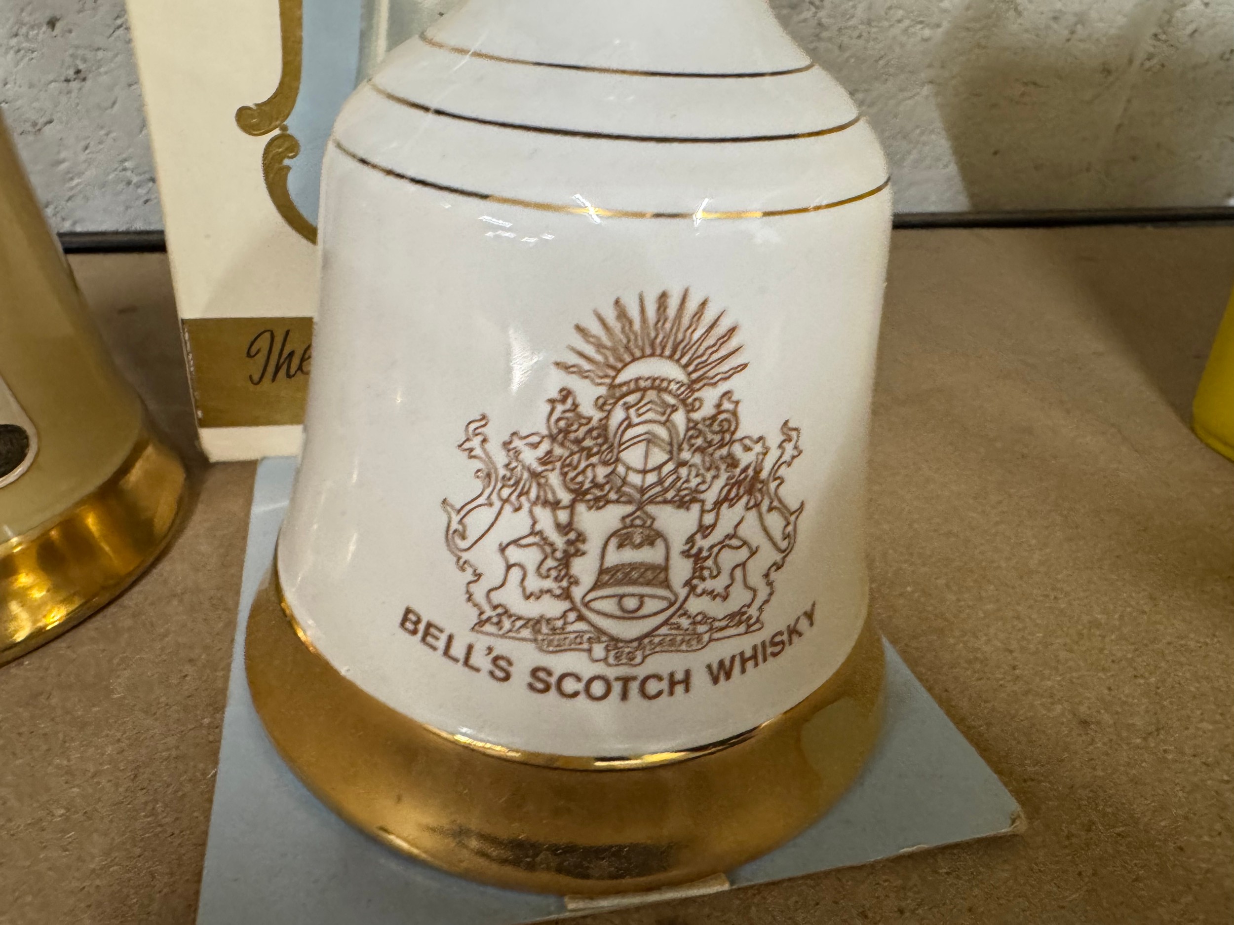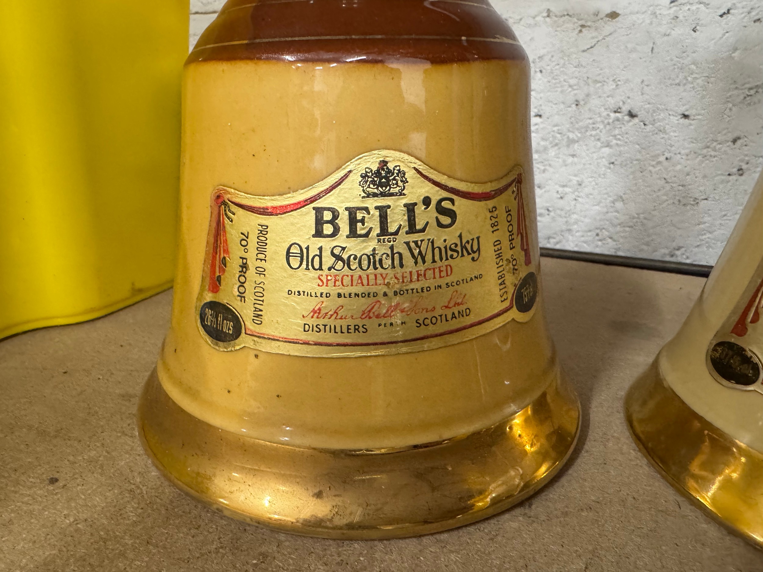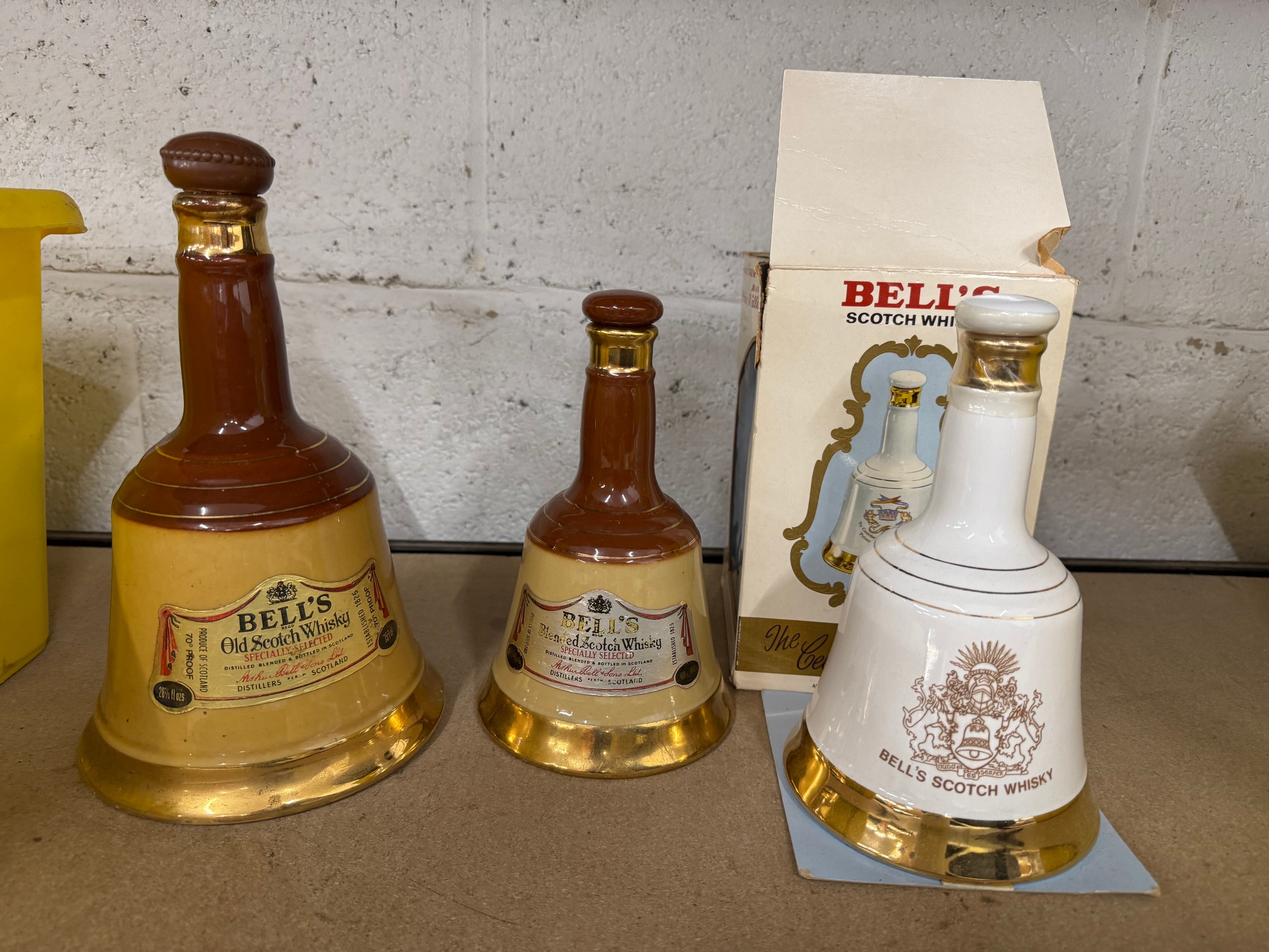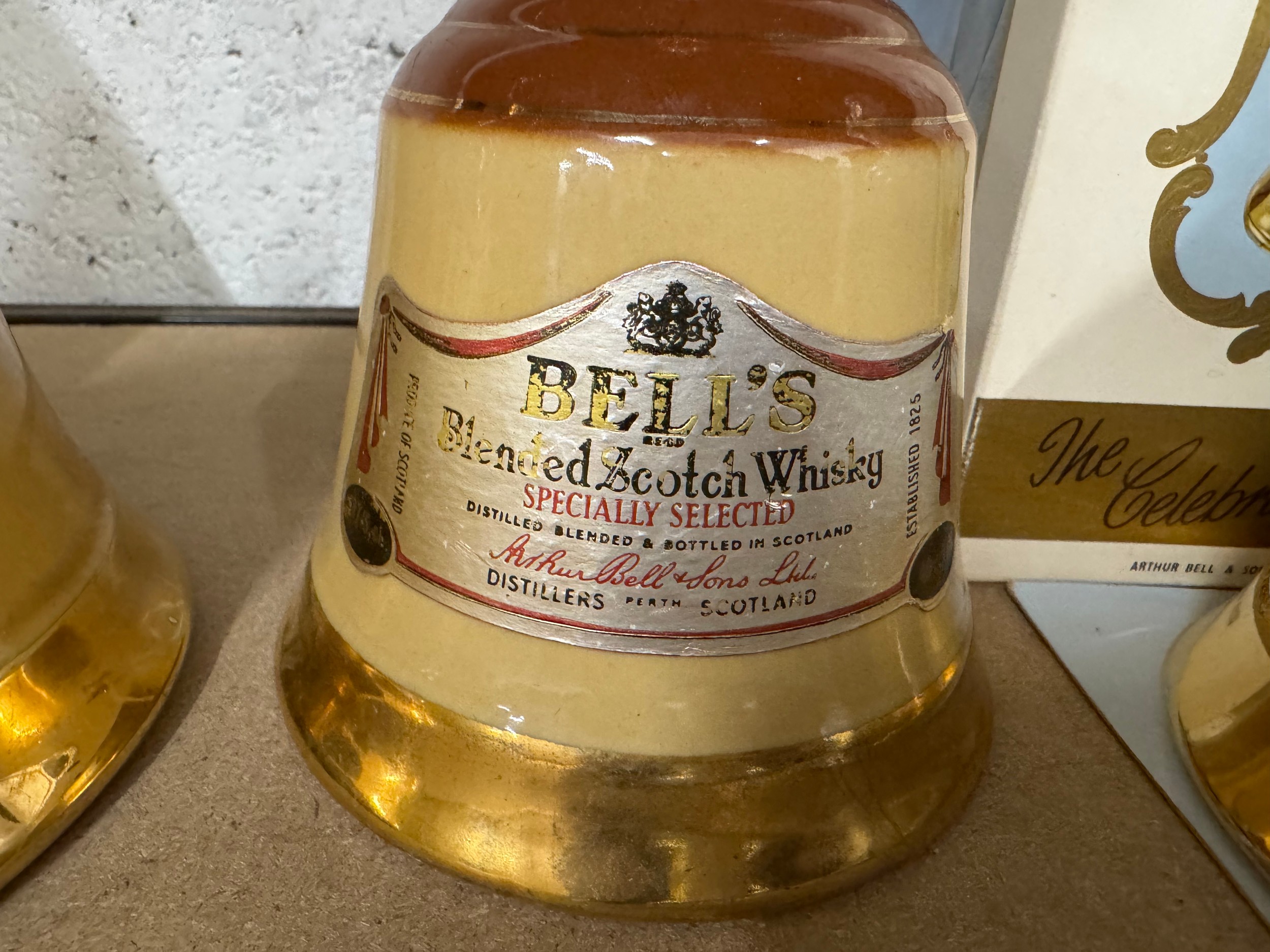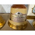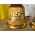Three bottles of bell's Scotch whiskey in bell shaped bottles