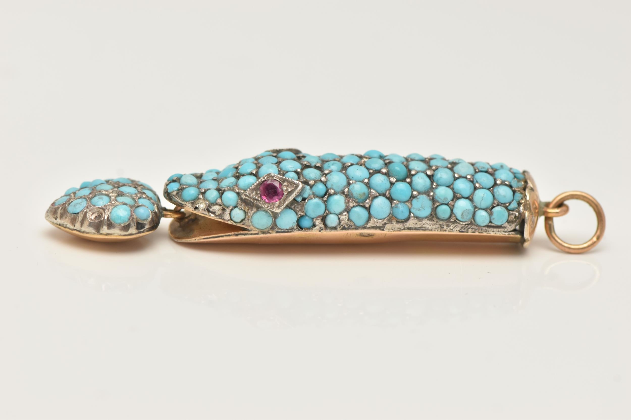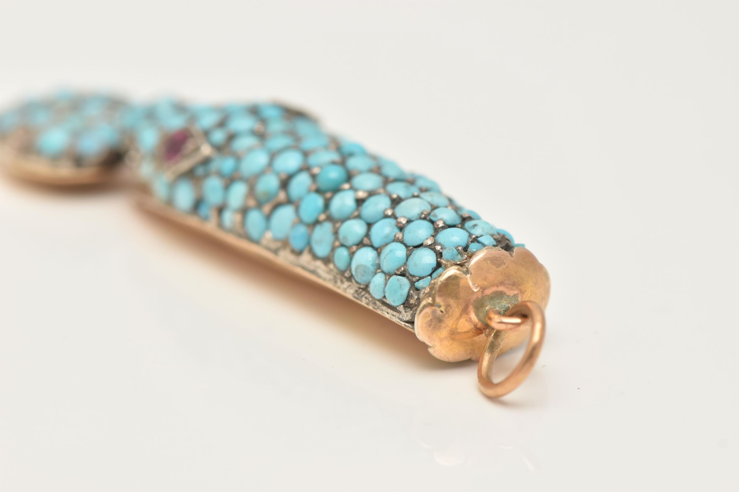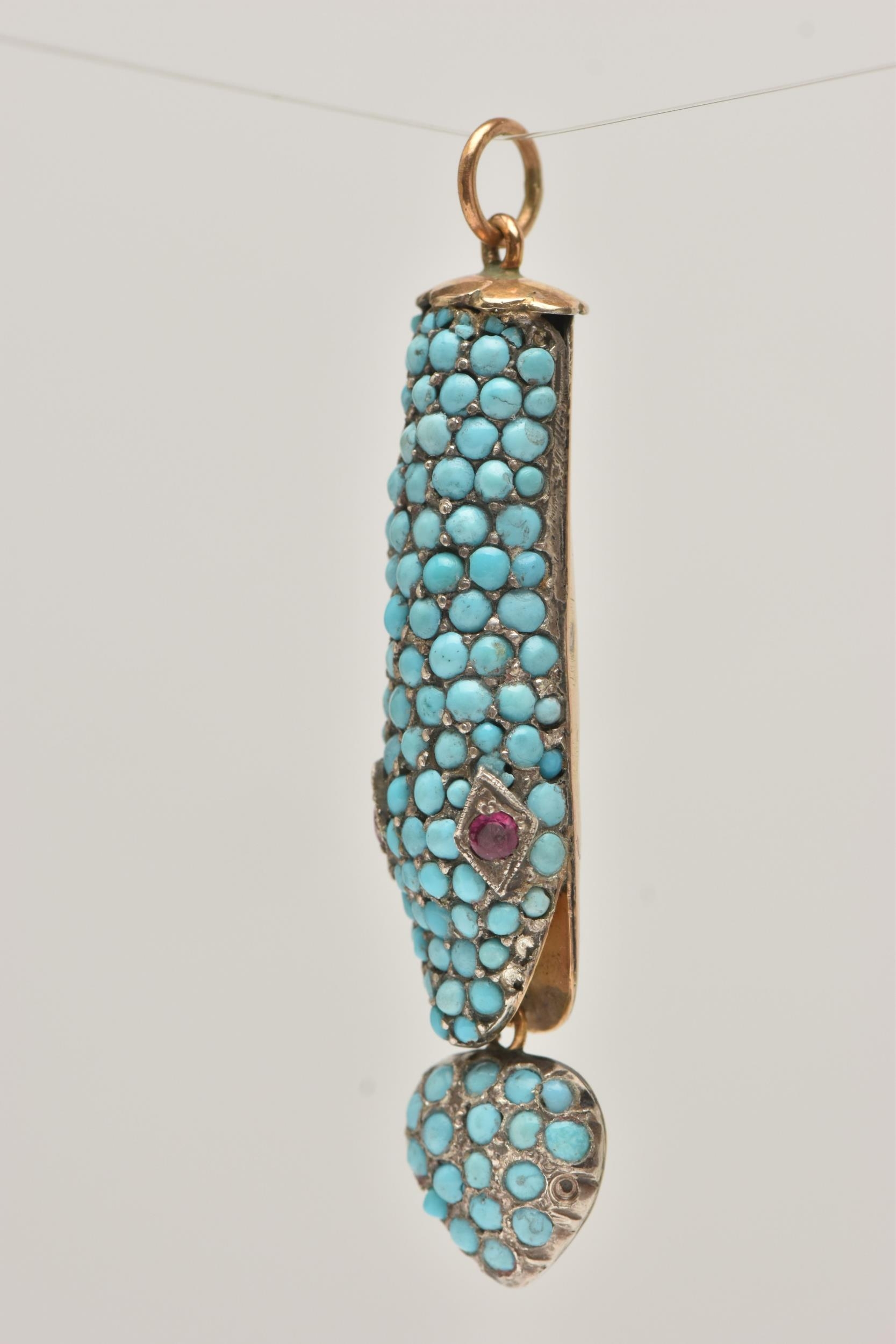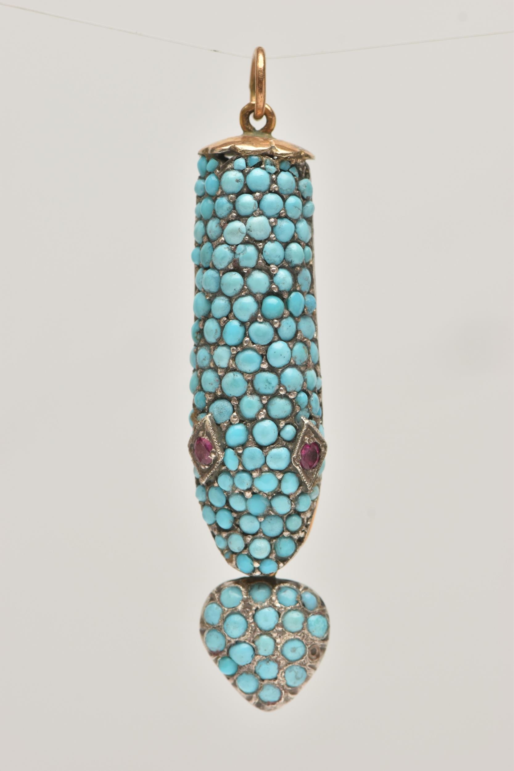 A TURQUOISE AND RUBY SNAKE PENDANT, snake head set with turquoise cabochon body and two circular cut ruby eyes, open mouth fitted with a heart dropper set with turquoise cabochons, in a white metal mount with a yellow metal reverse, unmarked, fitted with a jump ring for suspension, length including jump ring 60mm, approximate gross weight 9.7 grams (condition report: general light wear, all stones secure, light surface scratches but overall condition good)